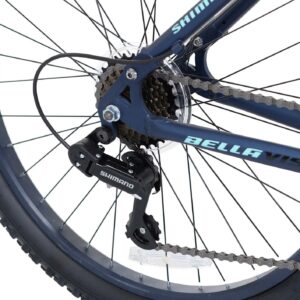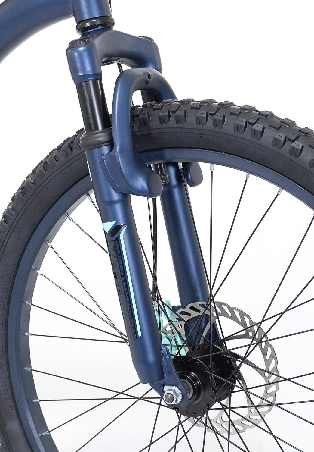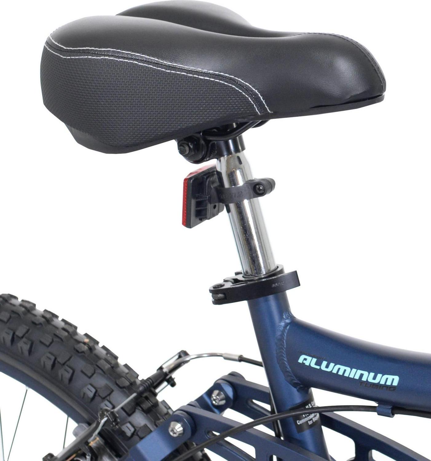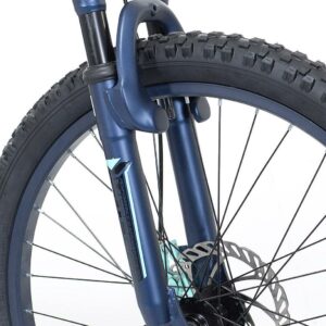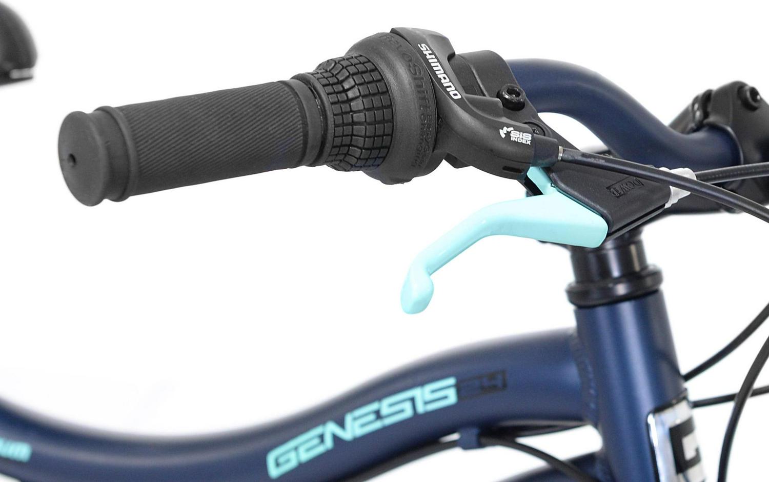 This is a 24″ tween/teen mountain bike from Genesis with front and rear suspension called the Bella Vista. This bike has 21 speeds and a Shimano rear derailleur. It also has rear linear pull hand brakes and front disc brakes as well as knobby off road tires. The bike also features a comfort saddle with a quick-release seat height adjustment for added convenience. This 24″ bike is a really cool dark blue color with matching blue wheels and is great for off-road adventures, paved bike paths or just around your neighborhood.