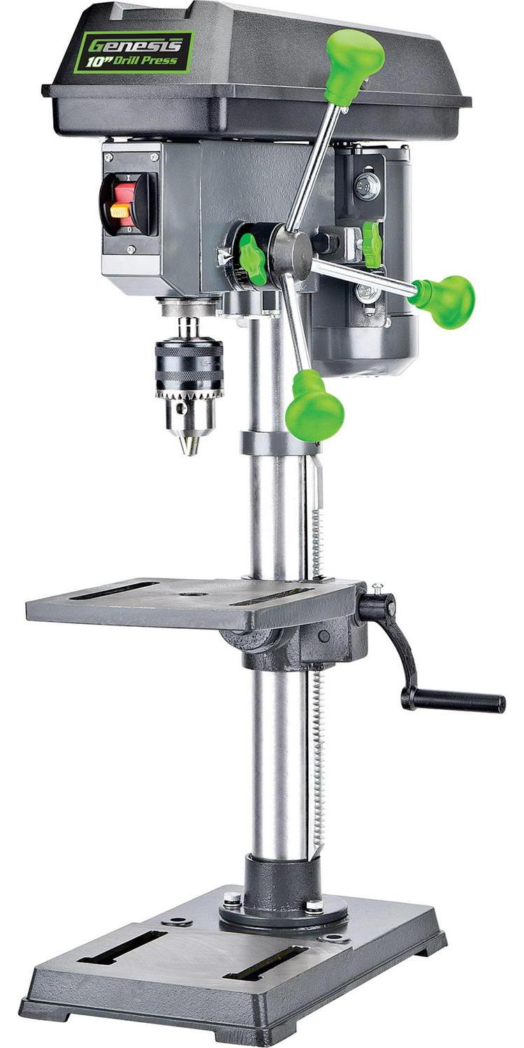 Genesis Bench Top Drill Press – 10 In. 5-speed drill press. Features 4.1 amp induction motor for quiet, smooth performance. 5-speed gear box provides versatility, 5/8 In. chuck handles larger bits. 7-1/4 In. x 7-1/4 In. table rotates 360 degrees and tilts up to 45 degrees. Easy to use rack and pinion table height adjustment. 3-spoke spindle travel handle with built-in adjustable depth stop. On/off switch with removable safety key. Built-in LED (light emitting diode) work light illuminates work surface. Heavy cast iron base for stability. Includes: chuck key, Allen wrenches, and (2) AA batteries for work light.