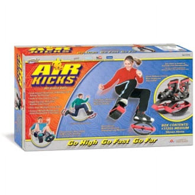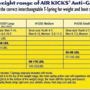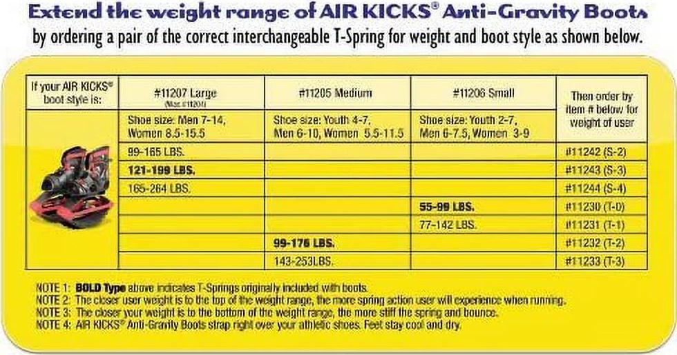 New AIR KICKS Medium (item #11205) are for body weights of 99-176 lbs. and use “T2” size T-Springs. They will fit over the user’s athletic shoes, and are adjustable to easily accommodate virtually ANY shoe size, provided the user is between 99 and 176 lbs.