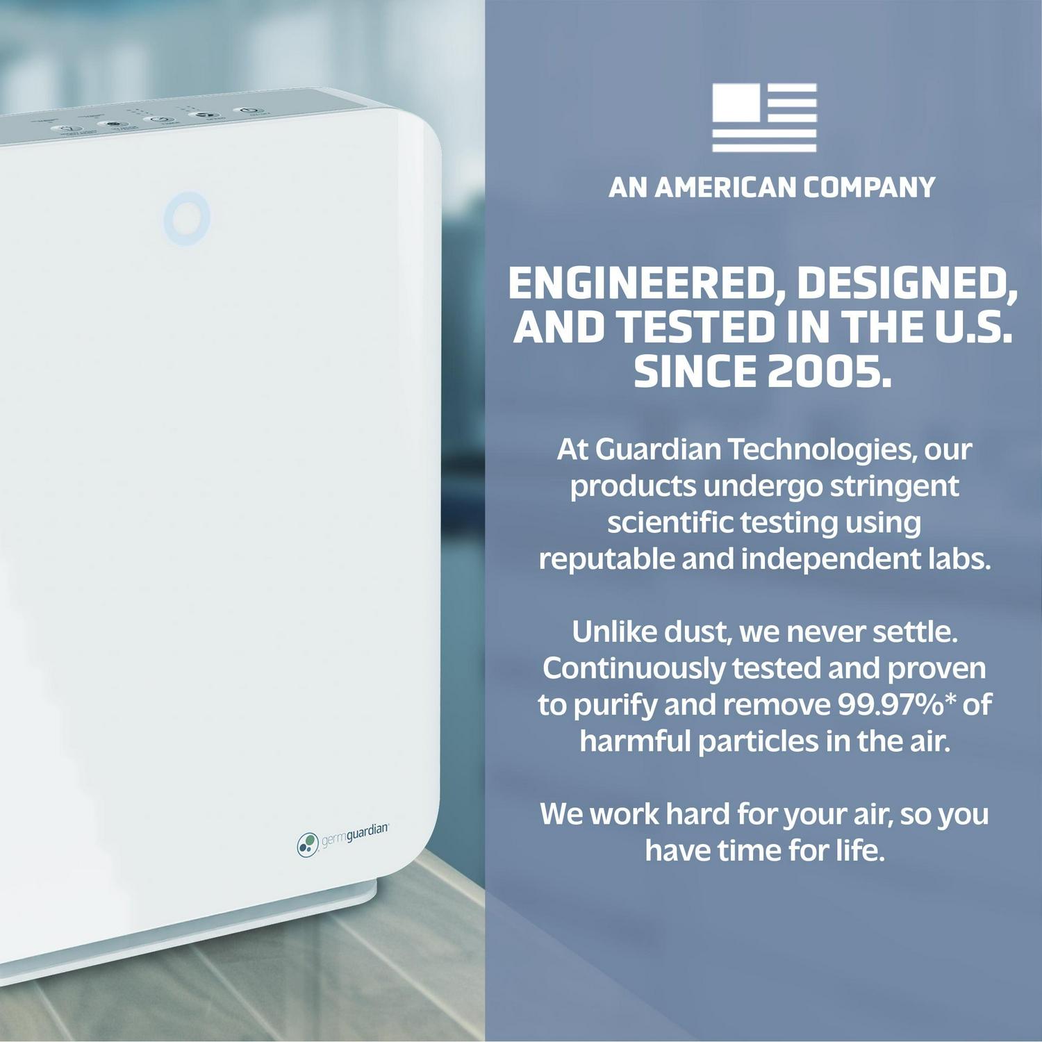 – Our air purifier is Ultraviolet – C (UV-C) enabled, providing an extra layer of defense, helping to reduce airborne germs such as Staphylococcus Albus, Escherichia Coli, Aspergillus Niger, and Phi-X174 as well as airborne bacteria and mold spores*
