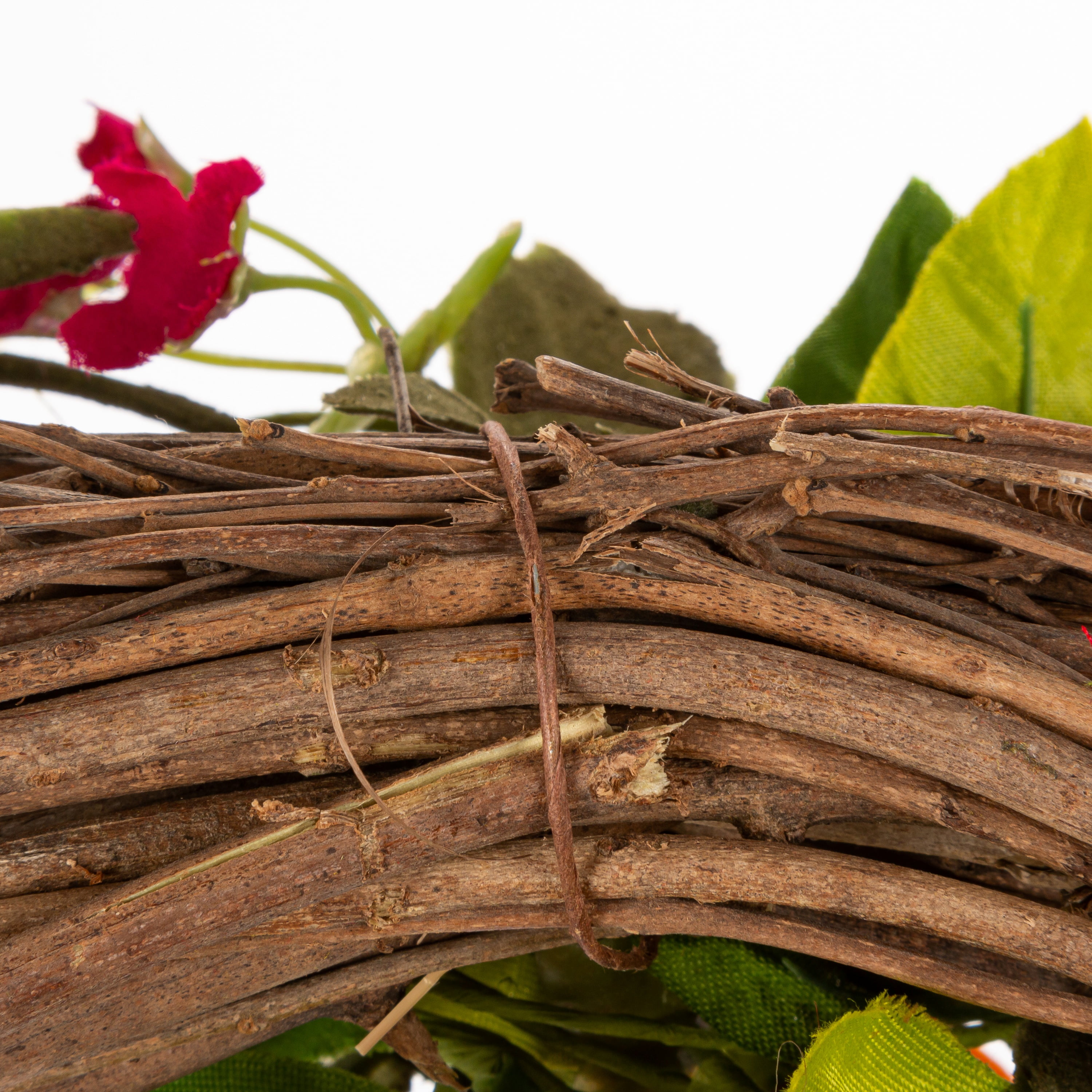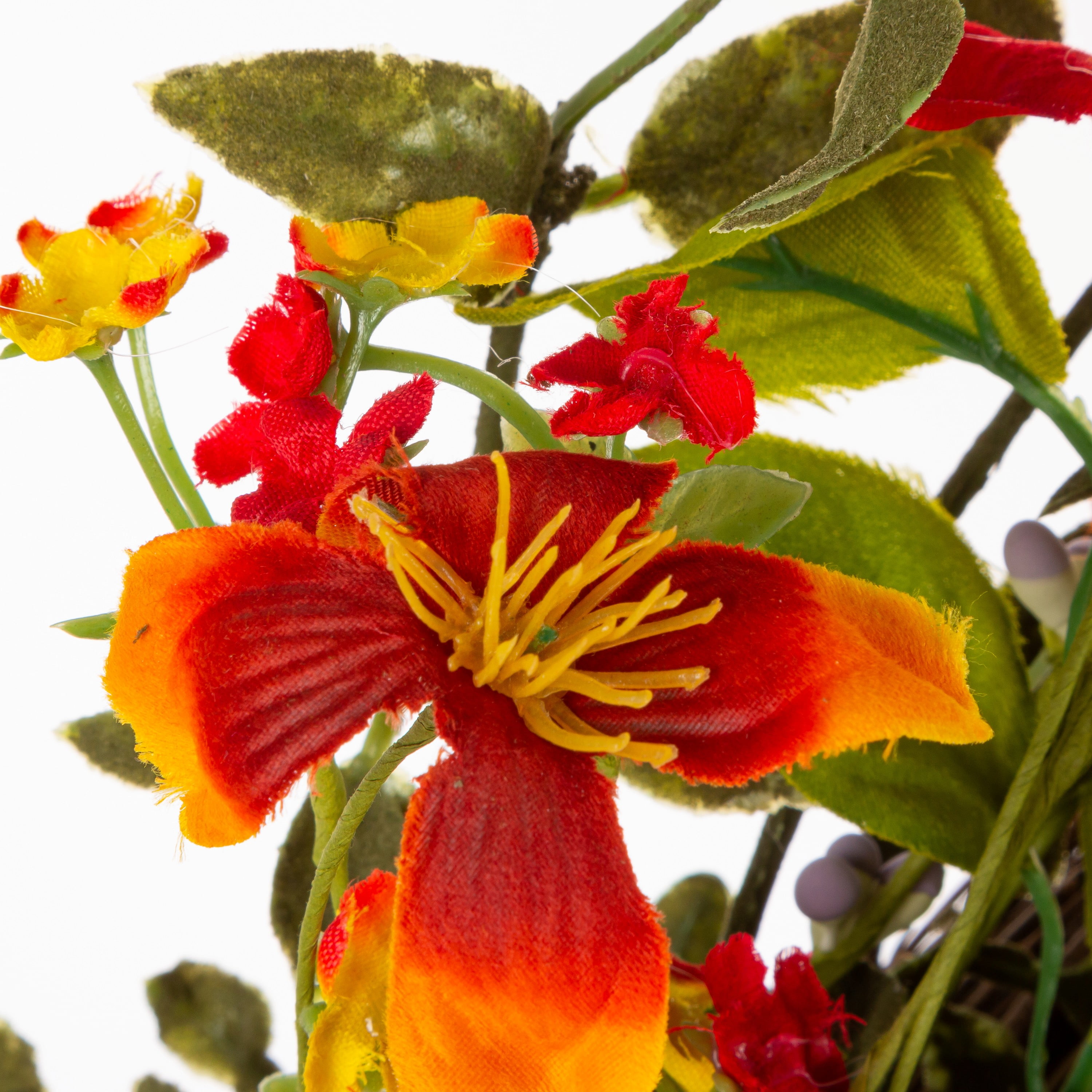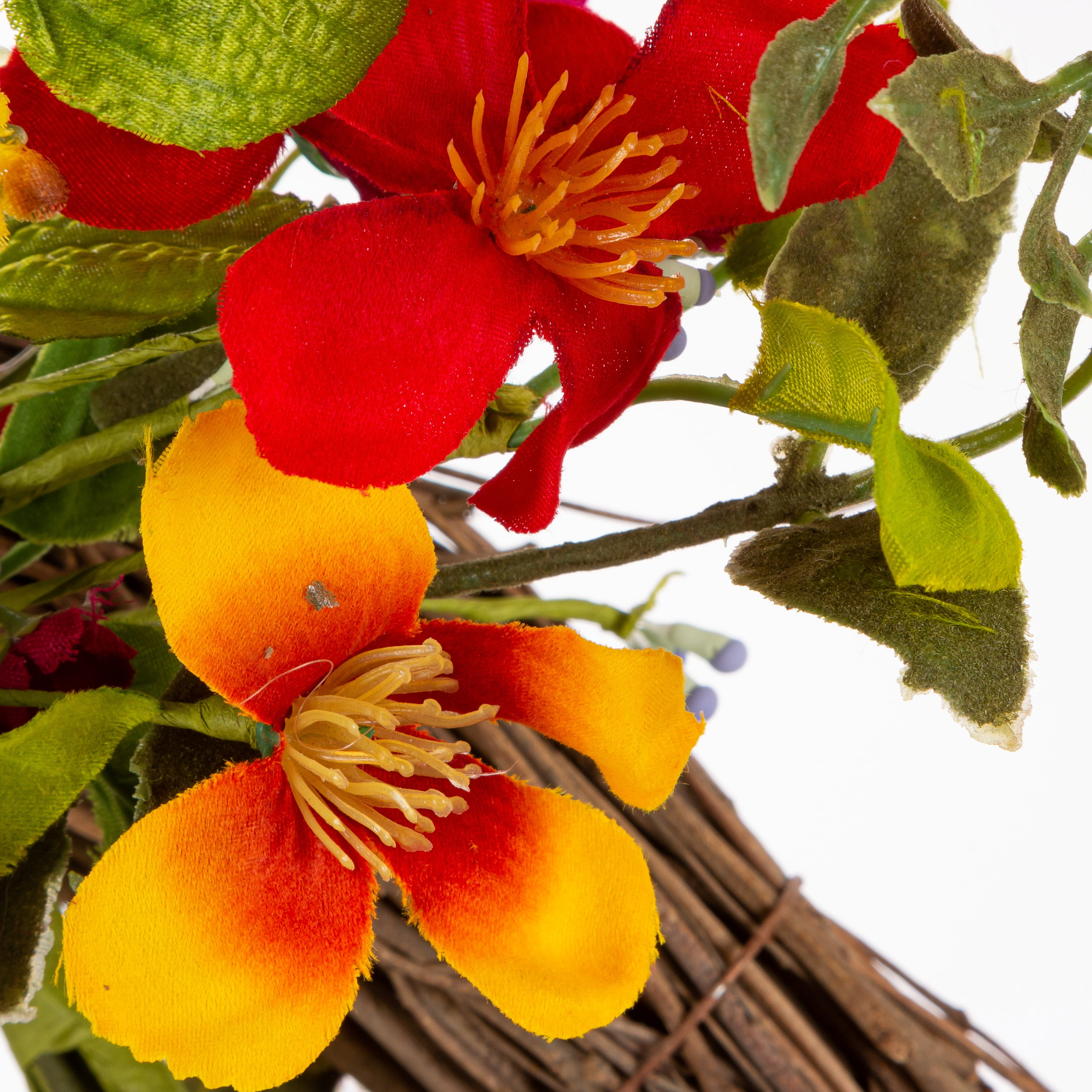 Add color to your front door with this 24 inch diameter wild flower wreath Artfully crafted of paper, plastic and natural twigs, these flowers are realistic and colorful Bursting with color, these blooms are two toned with yellow, orange and red to brighten any door or room Natural twigs supported by wire create a natural base for this wreath Easy and lightweight ready to hang in your home decor Intended for indoor or covered patio use only