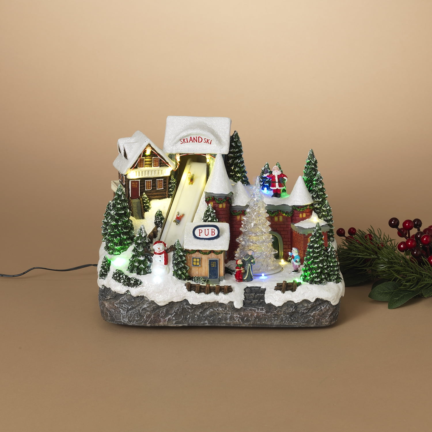 Lighted holiday ski village features a Ski Slope, Snowman, and Santa, while also playing Christmas Music Ski Village scene has moving tree in the center and multicolor lights, plays 8 Christmas tunes Village is illuminated with energy efficient LED lights in green, blue, and yellow Lights and moving tree are powered by a UL-Listed cord for your safety This ski village is the perfect stand-out piece to add just the right amount of Christmas cheer to your holiday decor For indoor use only