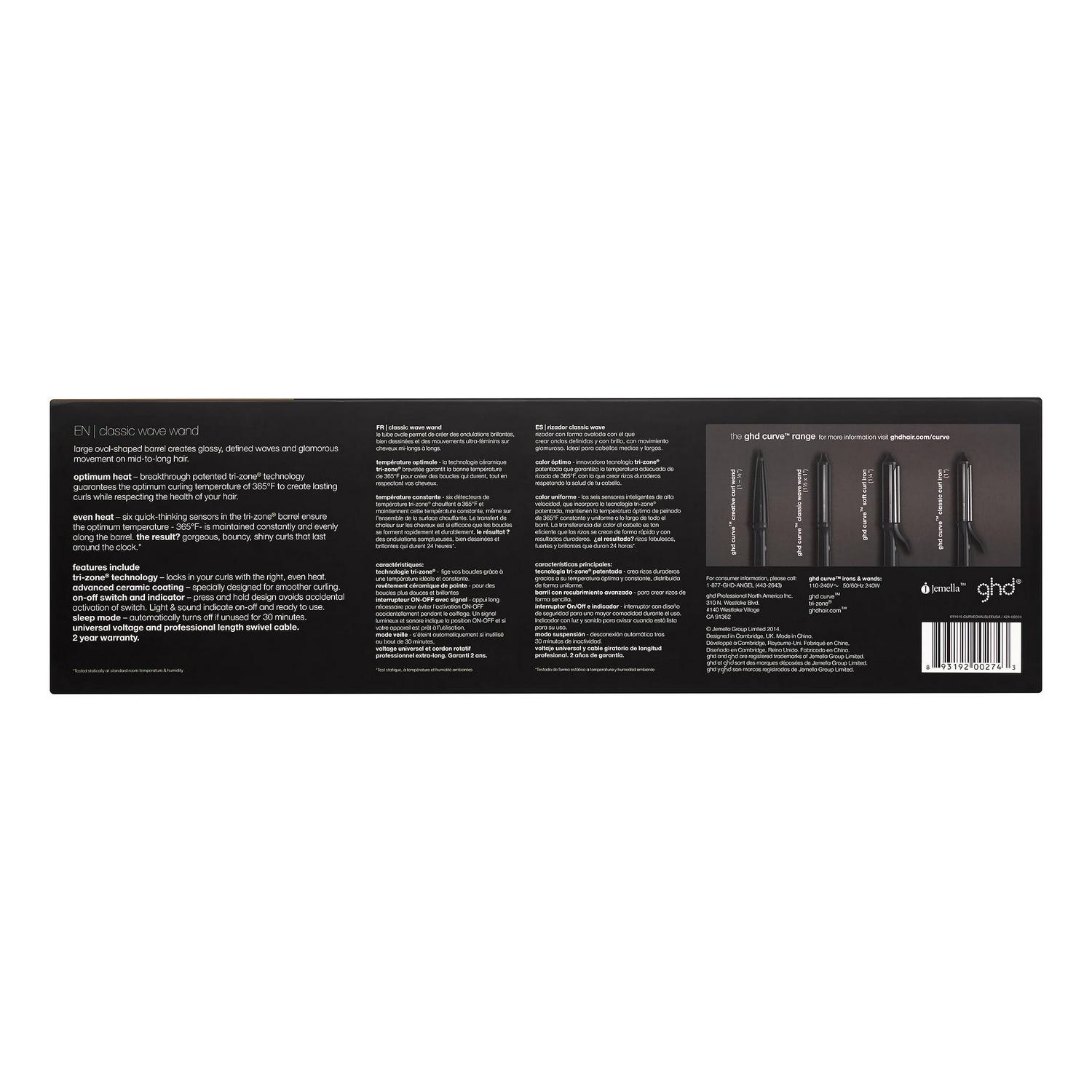 Introducing ghd curve , the new range of curling irons & wands from ghd. Featuring tri-zone technology for gorgeous, shiny, bouncy curls that last as long as you do. Each ghd curve wand contains patented tri-zone breakthrough ceramic technology that guarantees the right curling temperature of 365 F. This is maintained with six quick-thinking sensors in the tri-zone barrel that ensures the optimum temperature is delivered constantly and evenly all along the barrel of the wand delivering lasting curls that are formed fast and stay locked-in, while respecting the health of your hair. The ghd curve classic wave wand has a 1 1/2″ – 1″ oval-shaped wand that creates glossy, defined waves and glamorous movement on longer hair. The protective cool tip provides you with a safe place to hold the hair in place while you curl, and the built-in safety stand allows you to place the wand down securely during styling. Other handy features include a professional-length cord to allow for flexible styling, automatic sleep mode after 30 minutes without use and universal voltage, so you can use your wand anywhere in the world. Features: oval barrel designed to create classic deep waves with movement cool tip designed for more comfortable curling safety stand for securing the tong on a hard surface while not in use patented tri-zone technology locks in your curls with the right, even heat advanced ceramic coating specially designed for smoother curling on-off switch and indicator press and hold design avoids accidental use during styling. Light & sound indicate on-off and ready to use sleep mode automatically turns off if left unattended for 30 minutes universal voltage and professional length swivel cable