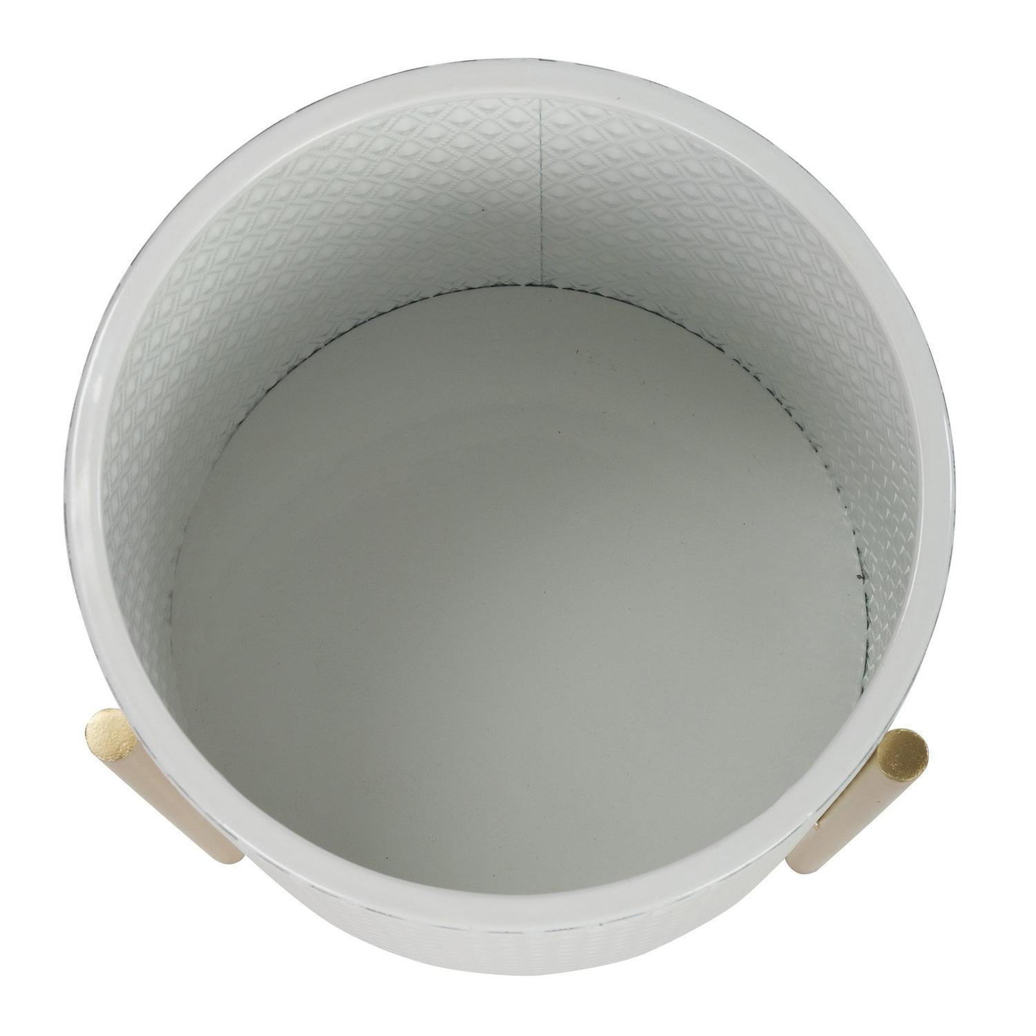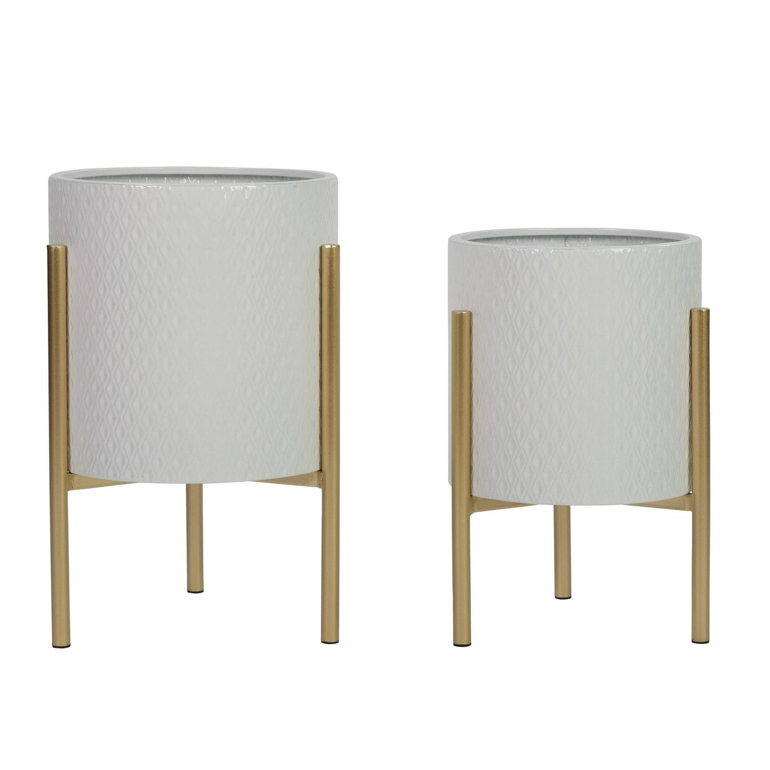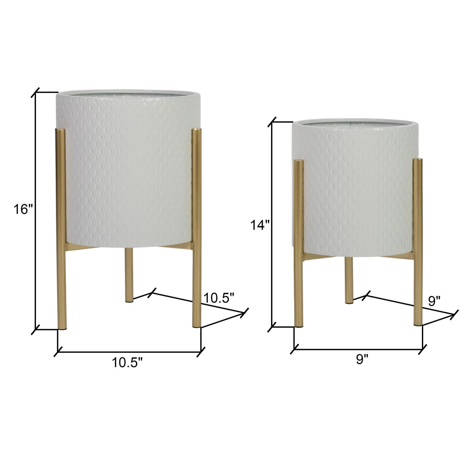 Place these metal planters in any mid-century modern, Bohemian, or modern space to elevate the design and offer a set of attractive vases for your plants. The glossy surface features an embossed diamond texture and is accented with a set of metal gold legs. Once you’ve added your greenery, use one or both as traditional planters for the floor or as a dramatic table centerpiece.
