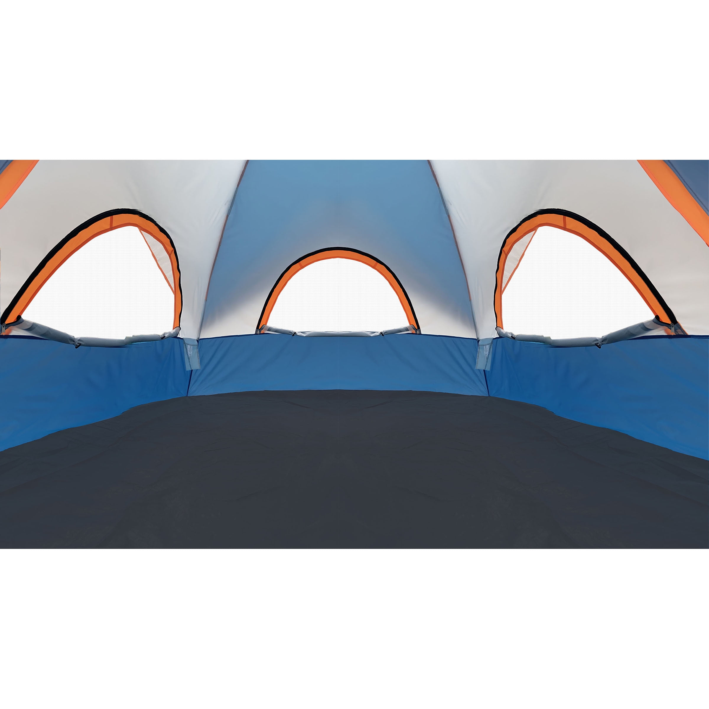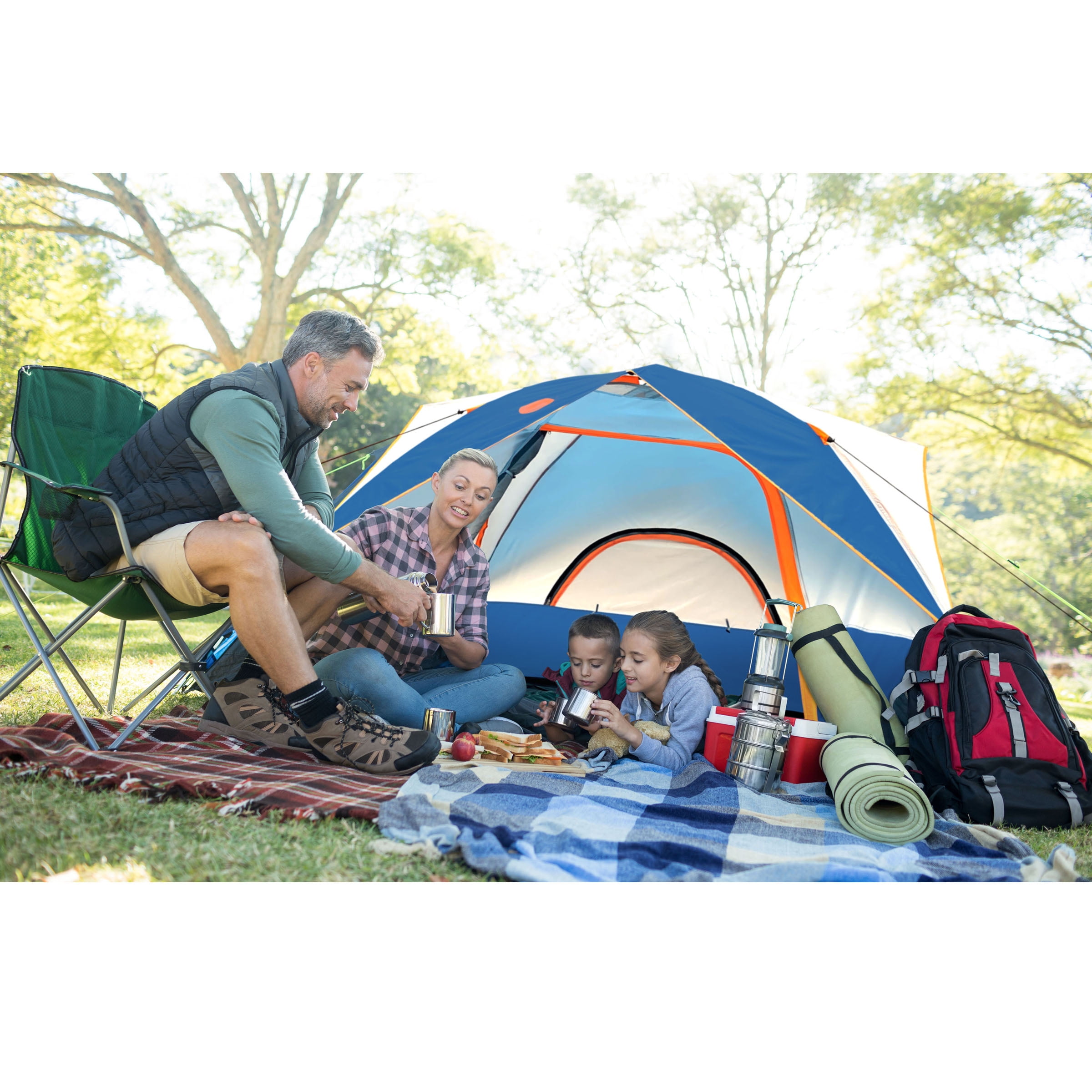 Sleeps 4 Peaked rain fly Ultra-violet-resistant materials Shock-corded fiberglass poles provide strength and durability Polyester fly and tent fabric Polyethylene waterproof floor Mosquito mesh windows Entrance tarp Dome design One room One door Four windows One interior storage pocket Easy setup 8′ x 8′ size 56″ interior height at the center of the tent 9 lbs 11 oz Includes duffle style carry bag Packs to 23” x 7” x 7”