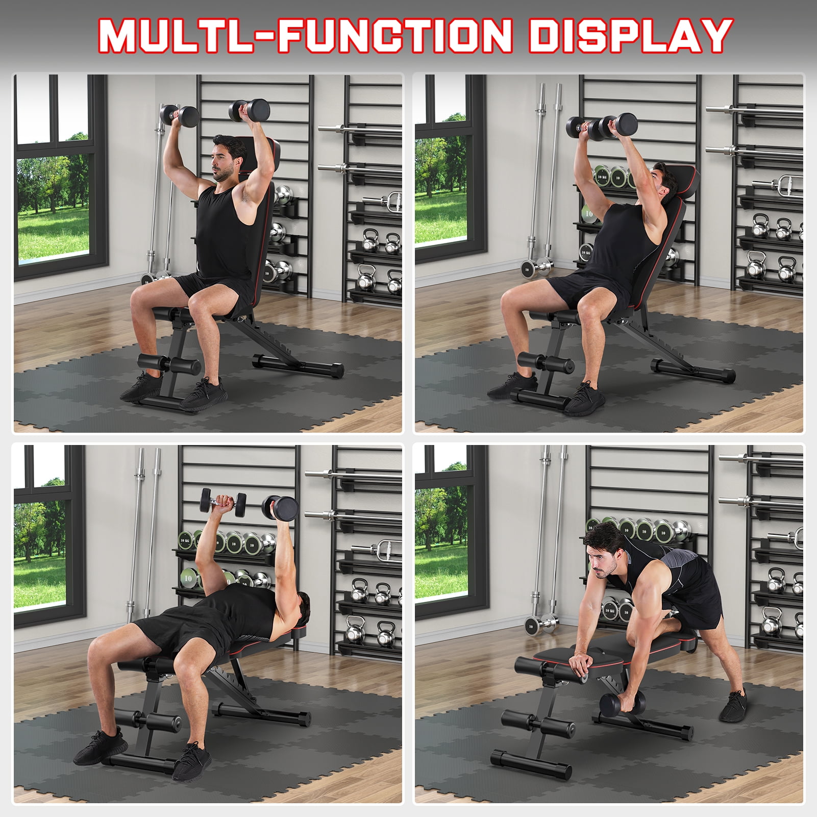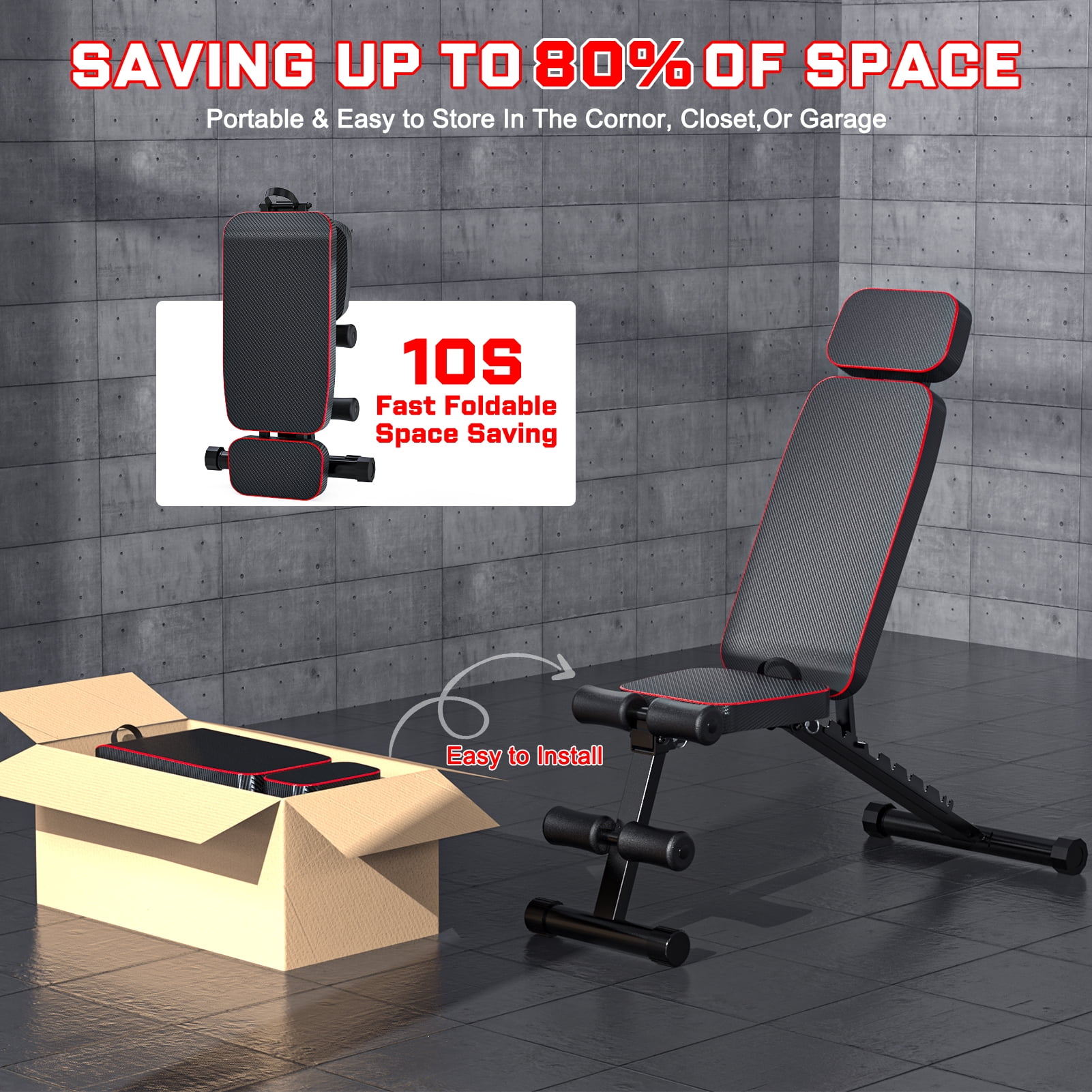 Feature: Sturdy and Long-lasting- The weight bench is constructed of High-quality steel, forming a stable triangular structure. Allowing the weight bench to carry a load capacity of up to 800 lbs. High Quality Material- This weight bench is made of 1.8 inch thick back cushion and seat cushion,high quality soft leather, which is not only soft and comfortable, but also wear-resistant and non-slip. Adjustable- The barbell rack can be adjusted to 9 different levels to accommodate individuals of different sizes. In addition, the backrest of the weight bench can be adjusted to tilt, drop, or lie flat to meet your various needs. Versatile- This weght bench is used for a variety of exercises including bench press, stretching, sit-ups and dumbbell exercises. Great for personal training and home gyms. Foldable and Convenient for Storage- This fitness bench is compact and foldable. The adjustable exercise bench can be folded in just 2 steps and easily lifted by the handle. Pull out 2 pins and drop the mat to complete the folding, easy to carry and store. Easy to Install- Equipped with complete installation tools and installation guide, each step has individually corresponding bolts and nuts, so there is no need to worry about assembly difficulties. Specification Color: Black Max Weight Capacity: 800lbs Material: Steel, Foam weight:23.1lbs Backrest: 9 Position Adjustment Folding Sizes: 33.15×18.33×7.8 inches