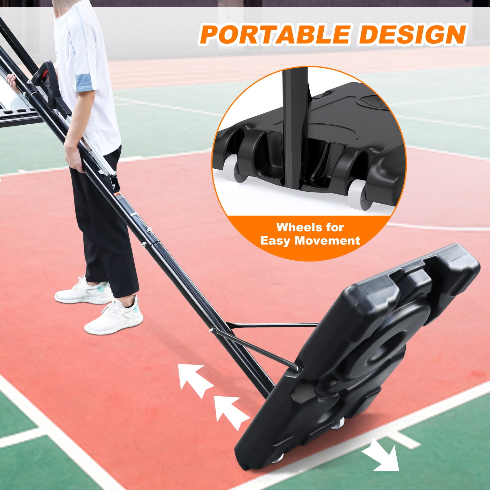 If you’re a basketball enthusiast, the GIKPAL portable basketball goal system is a game-changer. Please click the link for the assembly video It features a one-touch height adjustment design. Unlike other basketball goal system that need different poles for height changes, our system offers single-handed, one-touch operation, saving you time. With a vibrant color design and an adjustable height range of 4.9 to 10 feet, it suits users of all ages. With a robust PVC back panel and effortless assembly, it’s a durable and user-friendly choice. The standout feature is its superior stability, thanks to a base that can hold 53 kilograms of water or 150 pounds of sand. Whether indoors or outdoors, the wheeled base ensures easy portability, and the system’s durable construction with a shatterproof PVC backboard, sturdy steel frame, and weather-resistant nylon net guarantees long-lasting, stylish performance. It’s the ideal solution for basketball enthusiasts of all levels and is versatile enough for any location.