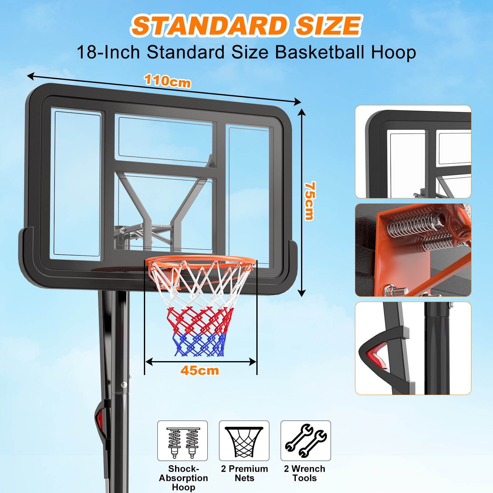 Key Features One-Touch Height Adjustment Design: Easily adjust the height with just a one-touch operation, no need to disassemble the support pole. This system offers a height range from 4.9 feet to 10 feet, suitable for adults and children aged 6 and above. Designed by the professional fitness brand GIKPAL, it is an ideal choice for both experienced basketball players and beginners. Portability: The wheeled base allows for convenient transport, making it perfect for use both indoors and outdoors. You can move it around effortlessly to find the ideal playing location. Durable Construction: The system features a PVC 44-inch shatterproof backboard, a robust iron basketball frame, and a weather-resistant nylon net. It’s designed to withstand the elements and provide a stylish, long-lasting addition to any basketball setup. Sturdy and Stable Base: The base can be filled with 116.8 pounds of water or 150 pounds of sand, guaranteeing stability during play. It’s a reliable choice, even in outdoor conditions. Plus, it can be easily emptied in freezing temperatures to prevent damage. Easy Assembly: The system is user-friendly and comes with an instruction manual, ensuring a hassle-free setup. Customers can quickly put it together themselves. Product Specifications Brand: GIKPAL Color: Black Material: PVC Backboard, PE Base, Iron Tube, Weather Resistant Nylon Net One-Touch Height Adjustment: 4.9 ft.-10 ft Height Adjustment: 5 Level Backboard Dimensions: 43″x30″( L x W ) Assembled Size:42″ x 30″ x 120″(L x W x H) Net Color: Red, White, and Blue Warranty: 6-Year Limited Assembled Product Dimensions:42″ x 30″ x 120″(L x W x H)