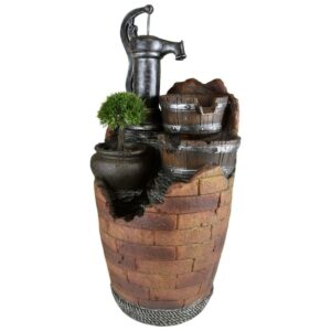 The Glenville Water Pump Cascading Fountain brings a charming, country cottage feel to your home or garden. A rustic-looking water pump trickles water down through barrel style pots and into the base. A third pot serves as a planter to display some greenery of your choice. This polyresin and fiberglass construction is durable and weather-resistant, making it suitable for outdoor use. For your convenience, a five-meter cord and pump are included.