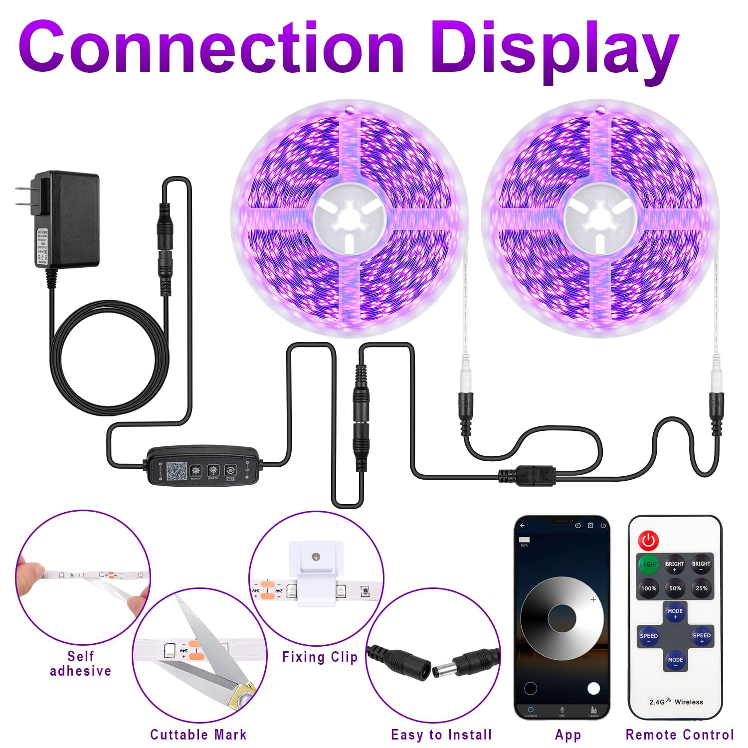 Smart App Control Blacklight Strip: Using Zengge app, you can control one or group of black lights for glow party, adjustable brightness, set up timer schedule. The uv light also has music mode that reacts to sound and customization candle mode. One/Two 50ft Consecutive Black Led: The glow party black light is 50ft/100ft in length. One continuous 50ft strip connects to one output from the controller. The black light is super bright for its high density leds, 18 leds each foot and brightness is dimmable. The working voltage of the purple led strip is 24 volt for better energy efficiency. 360° Controllable Remote: You can control the blacklight strip light by app or the 2.4g remote. The remote allows control from all directions without pointing to the black string light. With the remote you can also use dimming, speed and mode changing(breathing, strobe, flash). Tip: the remote is mateable in app. Black Light for Glow Party: The trippy black light led has wavelength of 385-405nm and flexible long length, suitble for bedroom, vaseline glass display case, uv reactive poster lighting, fluorescent painting galleries, neon glow birthday party, Halloween and other black light room decoration. Self-adhesive Black UV Led Strip: The cuttable halloween indoor light strip has sticky tape backing and extra clips are included for easy installation, just peel and stick. The purple led strip lights is also cuttable on the brown marks and provided with 24 month warranty. Please do not hesitate to contact us if any problem.