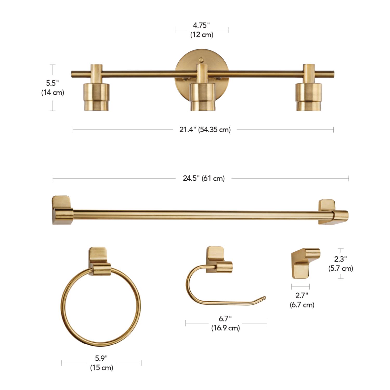 With clean lines paired with modern accents and a matte brass finish, the Alexandria 5-Piece Bathroom Set adds a striking minimalist element to any space. The open socket construction of the vanity light fixture lets you showcase your own personal style with the bulbs you choose. Using vintage-inspired bulbs to create a classic feel or try designer bulbs to create a more modern look. Update and modernize your bathroom or add the 3-light vanity to your bedroom to create a nice little getting ready nook. Complete with a towel bar, towel ring, robe hook, and toilet paper holder also in matte brass, your bathroom will look streamline and welcoming. While the pieces complement each other you can split this set up and use it throughout your home. The towel bar makes an excellent shoe holder. The towel ring would be great in your kitchen. The vanity light would work in your bedroom. Think outside the box!