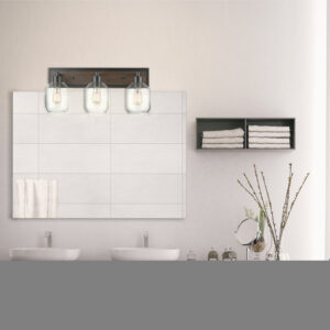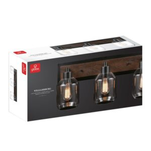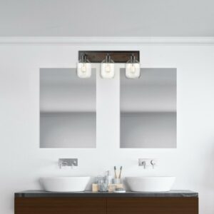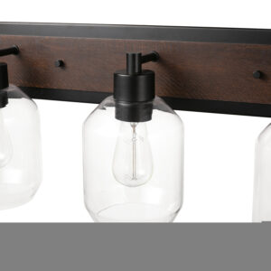 Globe Electric Williamsburg 3-Light Matte Black and Faux Wood Vanity Light with Clear Glass Shades, 51708