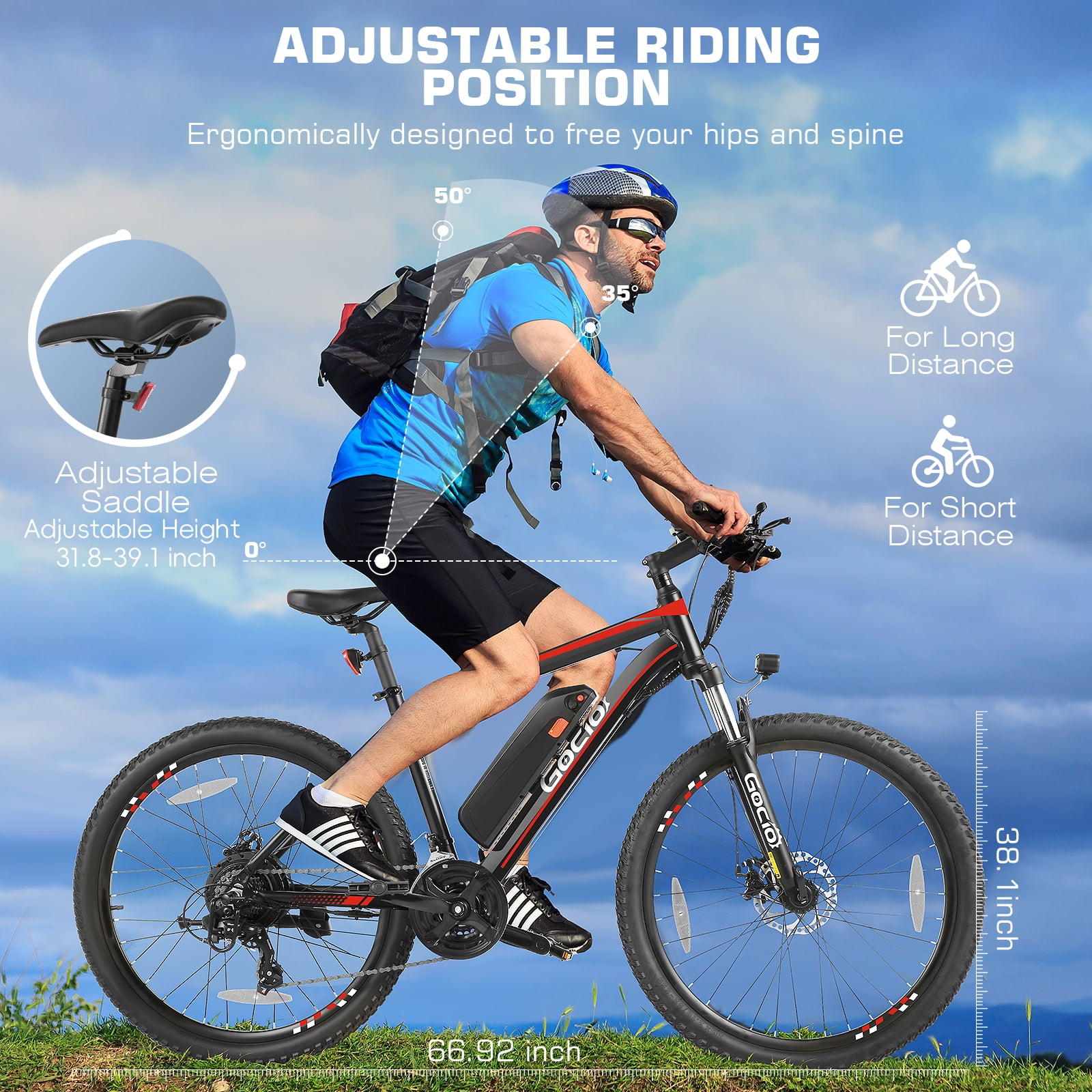 Gocio Peak 750W Electric Bike / 48V 10.4Ah Electric Mountain Bicycle /Adjustable Ebike for Adults Men Women / 22MPH Electric Mountain Bike / 26″ * 2.1″ wide tires Ebike Main Feature: ✨【Powerful Riding Performance】: This adult e-bike features a 500W high-speed brushless motor, achieving speeds up to 22 MPH. The 48V 10.4Ah 499Wh removable high-capacity battery (UL certified) offers up to 30-45 miles in pure mode and 45-60 miles in PAS mode. With new fast charging technology, it fully charges in just 3-4 hours——2X faster!The battery features IP65 waterproofing and BMS protection, significantly extending its lifespan. ✨【Suitable for all terrains.】: The adult electric mountain bike features 26 * 2.1 inch anti-slip wide tires with strong grip and excellent shock absorption, ensuring a smoother riding experience. It is suitable for various terrains including city roads, mountains, grass, snow, and sand. Additionally, the quick-release front wheel system offers convenience and flexibility, making the bike easier to handle, transport, and store. ✨【Safe & Comfortable Riding】: This adult electric bicycle is equipped with a lockable suspension front fork. Activating the fork enhances shock absorption for a smoother ride, while locking it saves energy, extend range, and ride faster and farther. The ergonomic saddle adapts to riders of different heights. Seat height : 31.8″-39.1″. Recommended height: 5.2 – 6.2 FT. ✨【Versatile Riding Experience】: This mountain electric bike offers 5 riding modes: electric throttle mode, pedal assist mode, pure pedal mode, walk assist mode, and cruise control mode, with 5 PAS levels (1/2/3/4/5). You can freely switch between these 5 riding modes and 5 PAS levels. Combined with the Shimano 21-speed gear system, this adult electric bike provides a versatile riding experience, suitable for commuting, off-road adventures, and outdoor cycling. ✨【Multifunctional Practical Design】: The upgraded LCD display provides various data such as mileage, battery level, and speed. The bright front light, rear reflector, and electric horn ensure your safety during night rides.The responsive dual disc brake system ensures your riding safety, allowing for quick braking. ✨【Easy Assembly and Support】: This adult electric bike arrives 85% pre-assembled, with the remaining tasks being simple DIY. We provide clear instructions and a toolset, along with dedicated customer service. Enjoy lifetime technical support for peace of mind.