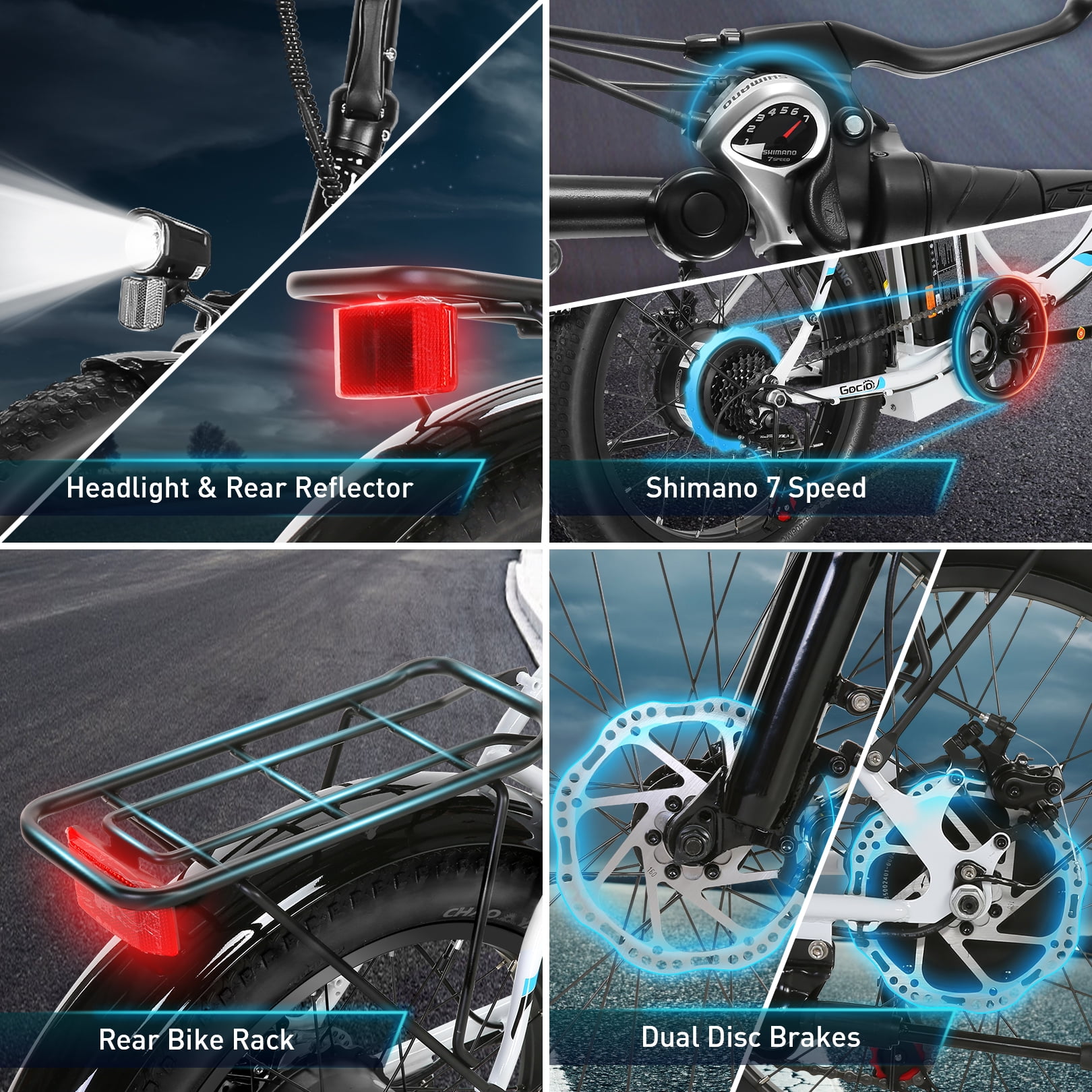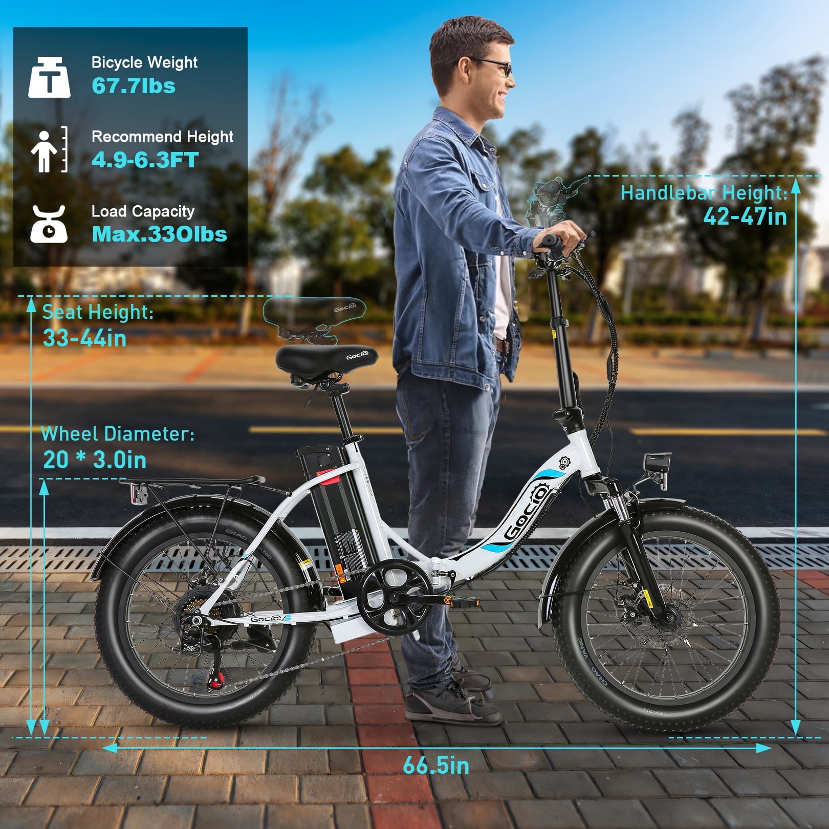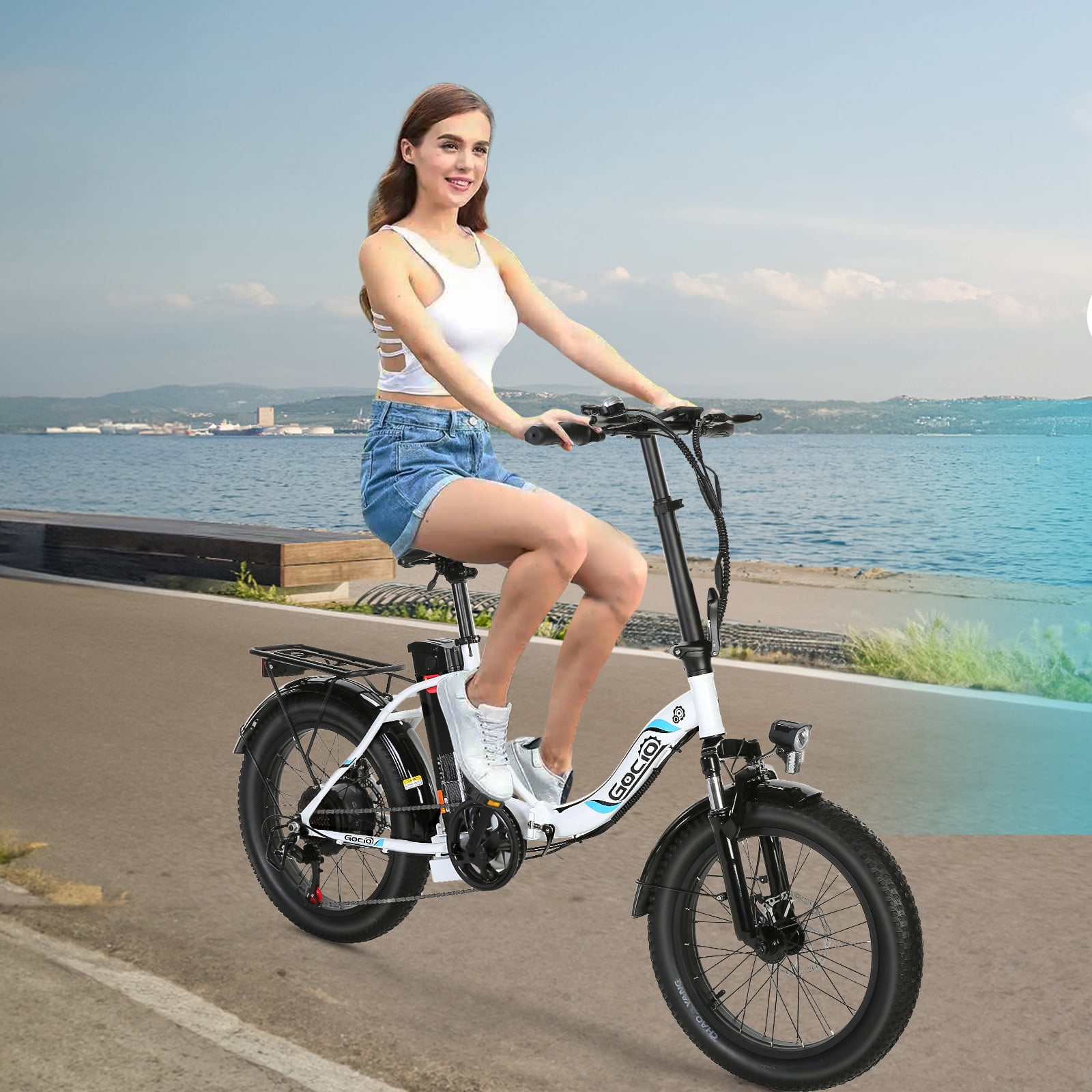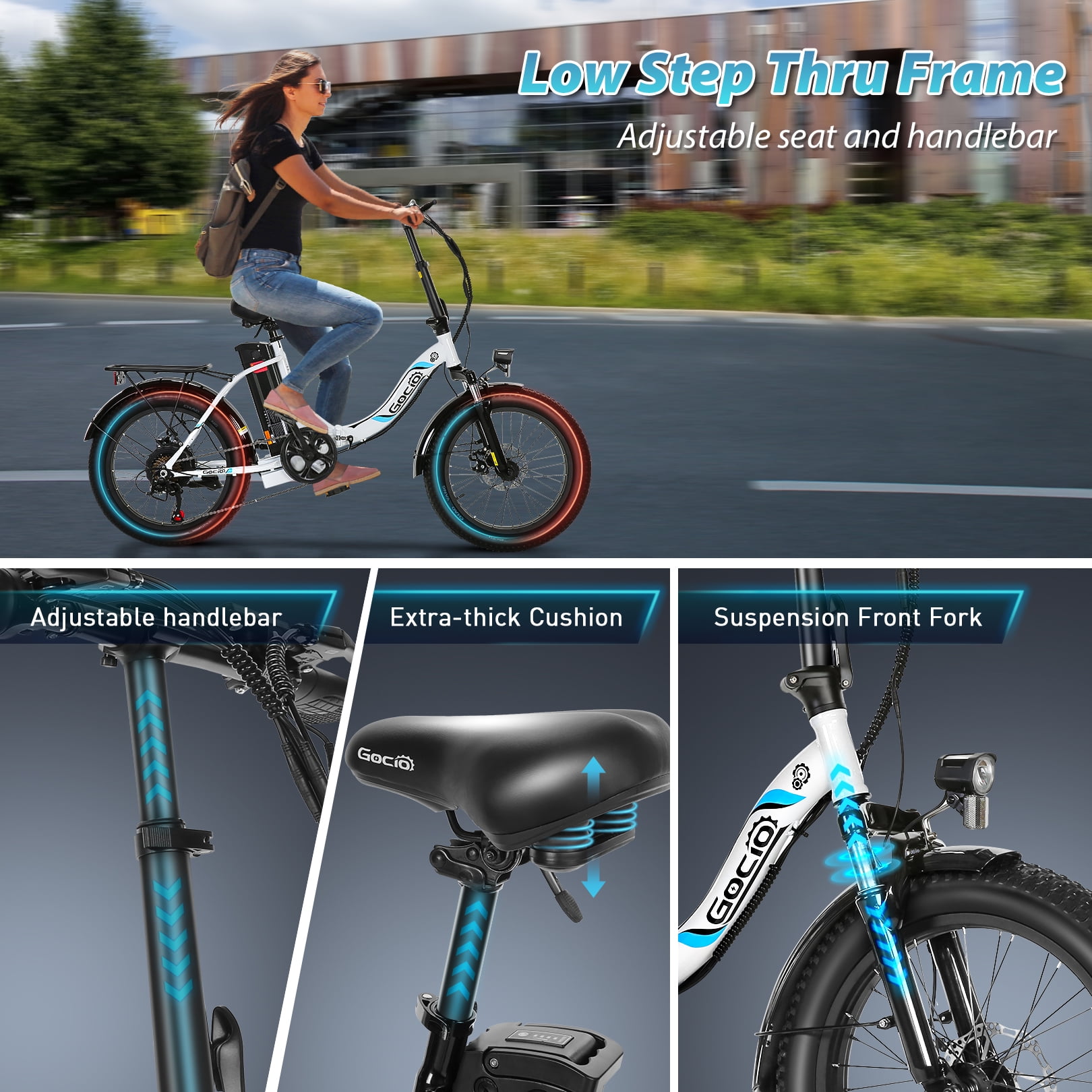 Gocio 500W (700W Peak) Electric Bike | 20″ * 3.0″ Folding Electric Cruiser Bicycle | Low Step Frame Electric City Bike | 500Wh Battery Ebike | 50+ Miles Range Commuter Ebike | 5 Working Modes Electric Hybrid Bike ✨Main Features: 🚴 Upgraded Performance: We have upgraded the tire size and display on this electric bike. From 20″ * 1.95″ to 20″ * 3.0″ fat tires, makes you less slippery, more stable and more grippy while riding. And the HD smart LCD display lets you grasp the assist level/speed/battery/mileage information in real time, makes you riding more peace of mind. 🚴 500W Powerful Motor & 48V Battery: This electric bike is equipped with 500W brushless motor and 48V 10.4Ah 500Wh (UL 2849 certified) removable lithium battery. Max. speed and range can reach up to 19.8mph and 25-50miles respectively. The battery is removable and lockable to guard against theft. 🚴Electric Bike with 5 Working Modes: Pure Electric Mode/ Pedal-Assisted Mode/ Traditional Pedal Mode/ Walk Push Mode/ Cruise Control Mode. In addition to the three common modes, e-bike motor provides small assistance to make pushing the ebike effortlessly in Walk Push Mode. Maintain the current speed without needing to hold the throttle in Cruise Control Mode. 🚴 Comfortable & Safe: The seat and handlebar height is adjustable for person of different heights (5′-6’5″). The high-strength shock-absorbing forks, 20-inch anti-slip resistant tire, and the comfort seat will absorb bumps on the way down the road make riding comfortably. The bright headlight and the rear reflector helps you ride safely at night! 🚴 Two Step Folding Design: Two step folding design will make it easier to carry or store in the trunk.The net weight of this ebike is 67lbs and max. load capacity is 330lbs. With the rear carrier ebike rack, you can carry things conveniently. 🚴 Low Step Frame: This electric bike features a low step frame which is user-friendly for women and senior to get on and off the electric bicycle conveniently. It can be a great gift for female to facilitate her commute and shopping.
