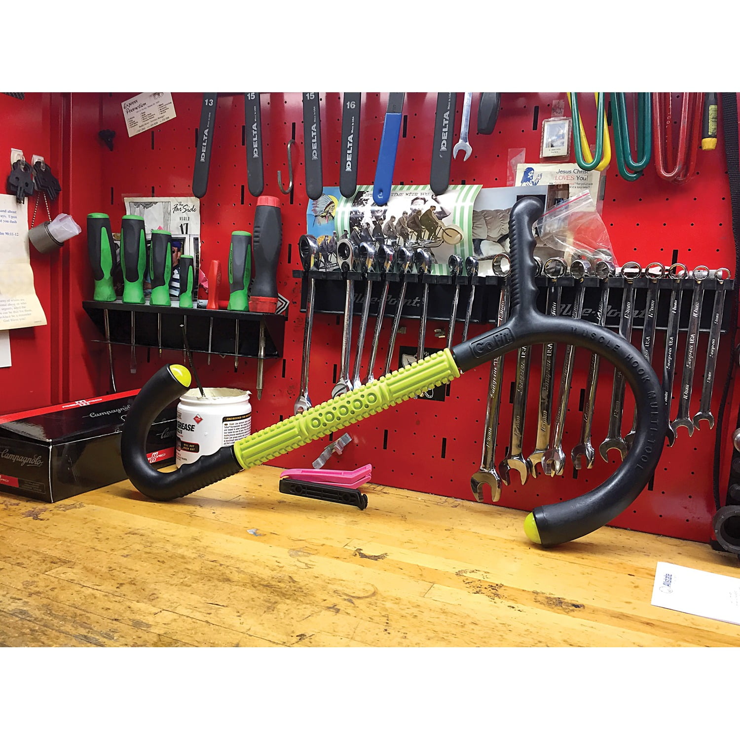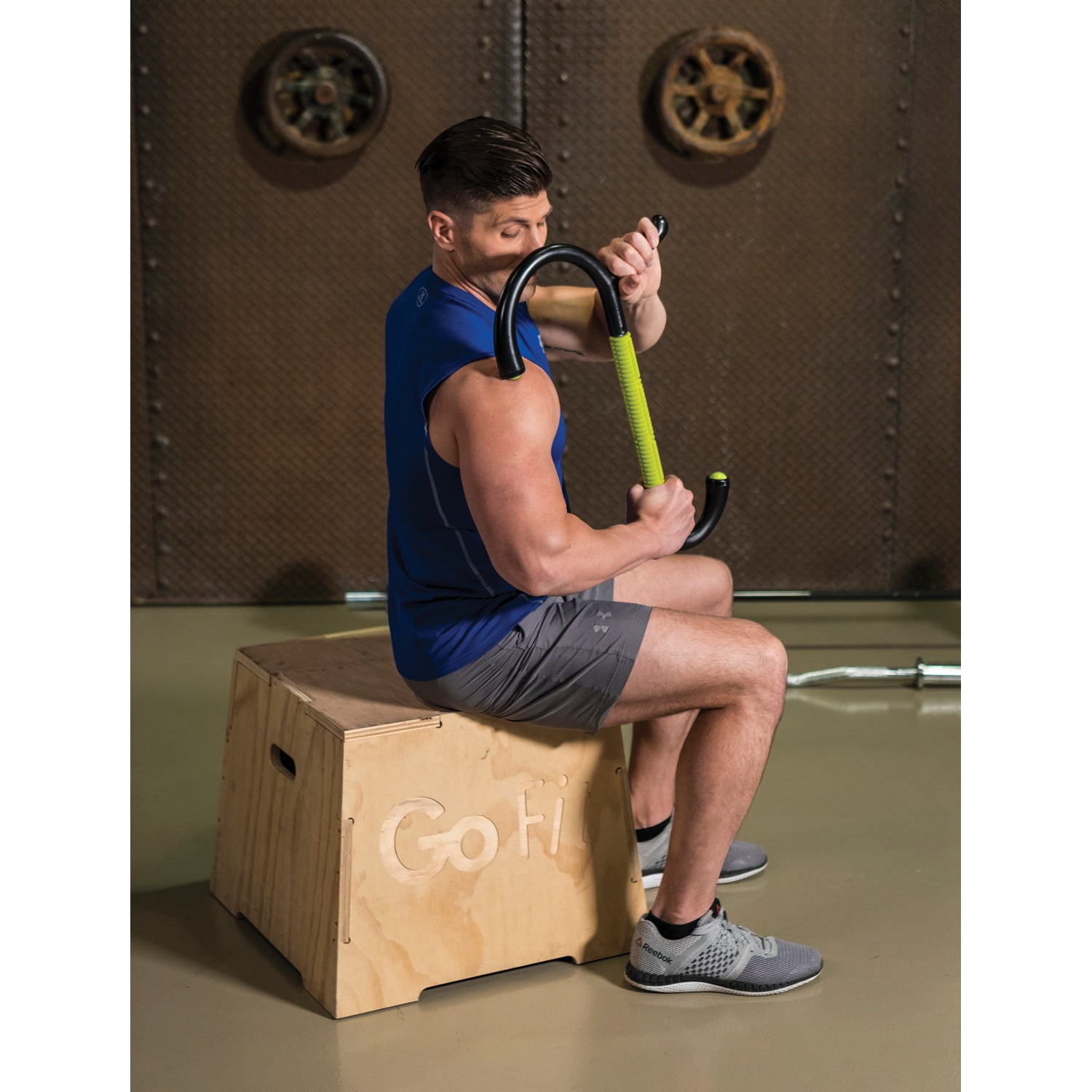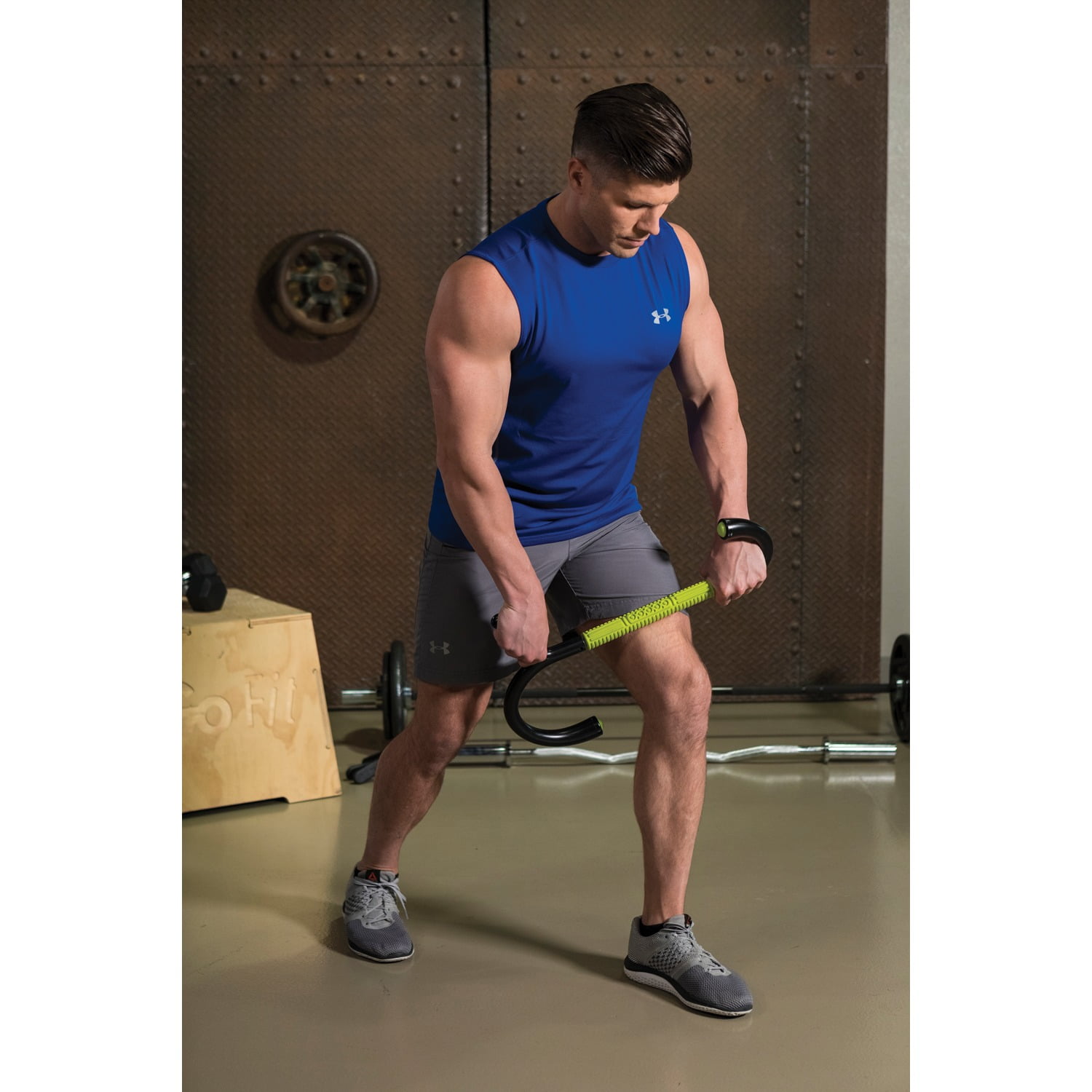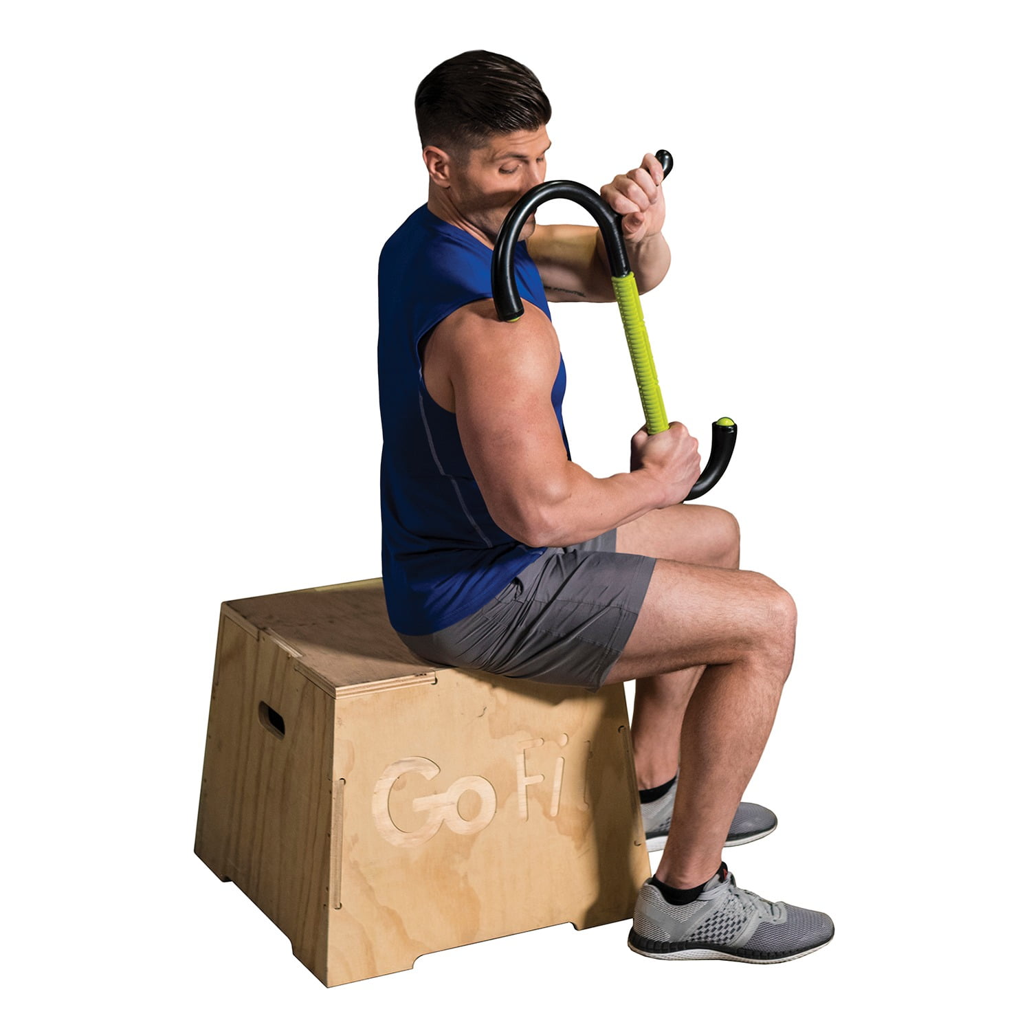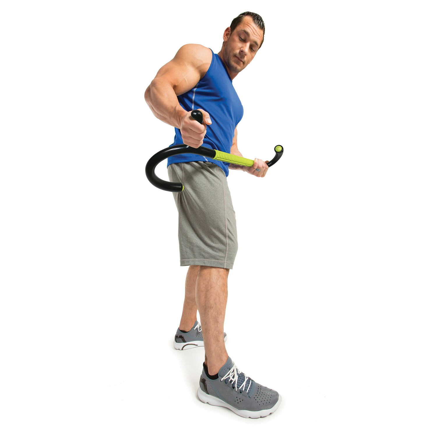 GoFit Muscle Hook Multi-Tool Its unique hook design and hand grips help reach tight muscles with massaging leverage. The relief-pattern of its rolling massage bar kneads sore muscle tissue while the roller-ball end knobs simulate massaging thumbs for total body recovery. Heavy-duty urethane Roll-On hook ends for direct contact Nonlatex rubber Spinning Massage Bar with solid steel axle precision ball bearings Targets the body for deep-tissue muscle recovery Durable polyurethane hook and handle design for leverage Roll-on hook ends and spinning massage bar de-attach easily for cleaning