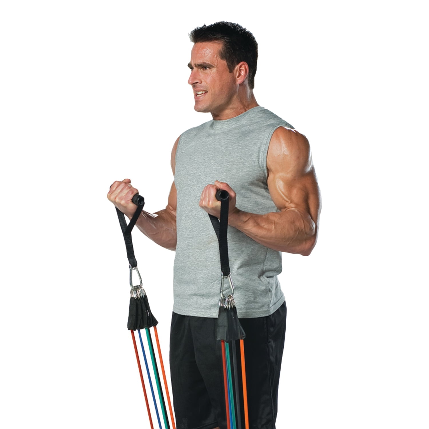 20 lb. tube 30 lb. tube 40 lb. tube 50 lb. tube 2 handles 2 leg straps 2 door anchors Exercise book Carrying bag