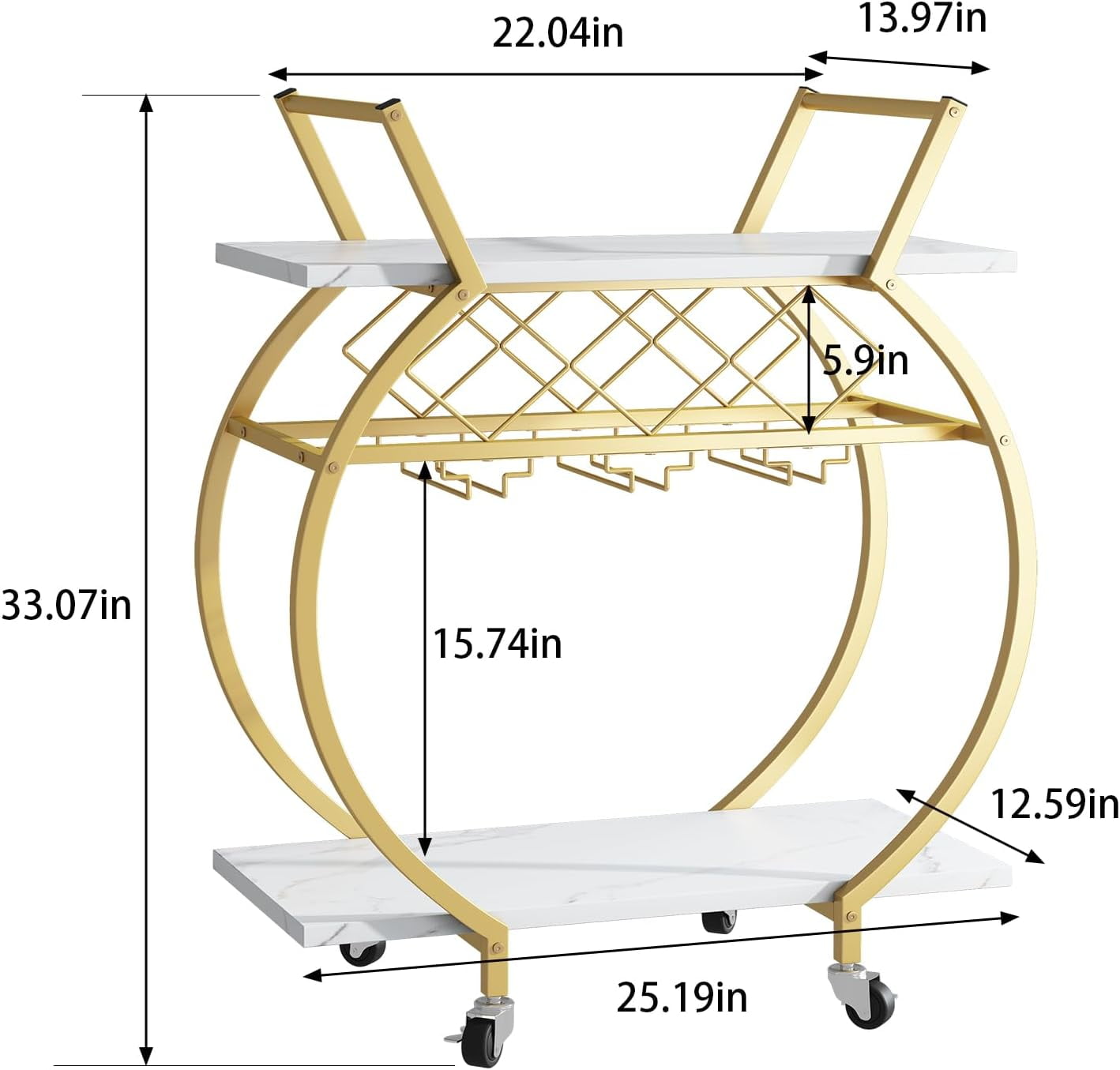 Round Wine Cart Exquisite & Durable The golden high-quality steel frame is paired with a white marble wooden board, and the unique texture on the surface does not appear monotonous. It will not only be a good helper for gatherings, but also a unique decoration. Suitable For Various Occasions Our movable golden wine cart has a large storage space.This cart can not only serve as a service cart for the kitchen, a beverage cart for parties, but also a wine cart or coffee cart for hotels. A Charming Wine Serving Cart Easy to serve for you guests with 4 four 4 360° swivel casters. Designed with Round steel frame and wine rack & glasses rack ,bringing convenient for your party time. Specifications: Item Dimensions:25.19×12.59×33.07inches Material: Steel Frame & MDF Board Color: White & Gold Item Weight: 9.36LB Load Bearing: 99 lbs