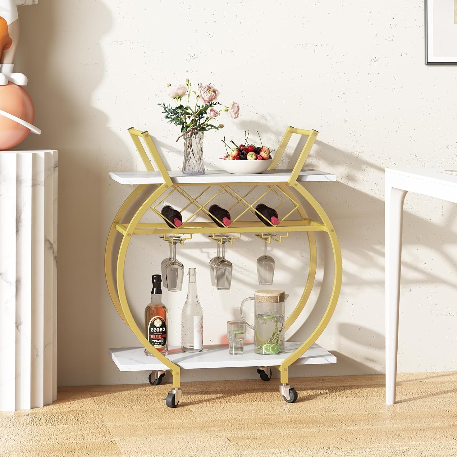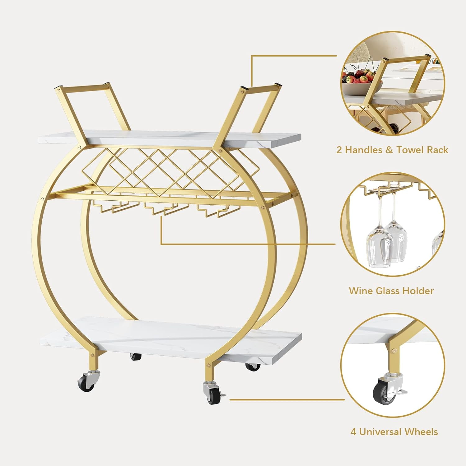 【BEAUTIFUL & DURABLE】The bar car has a curved gold frame design, and the storage layer is made up of white marble wooden board showcases an elegant and noble sense of modernity. 【LARGE CAPACITY】The Bar cart measures 25.2*13.98*32.87 inches and has 2 tiers of open display storage shelf. You can put things like wine, snacks, fruit, coffee,cutlery, etc.At the bottom of the first floor, we have added a wine rack that can hold three bottles horizontally and hang up to six wine glasses to meet your needs. 【MULTI FUNCTION】This golden bar cart can not only serve as a kitchen service cart, microwave rack cart, beverage cart at parties, but also serve as a wine cart or coffee cart for hotels. With its convenient and versatile design, this mobile tool car will be a good assistant for various gatherings and household storage. 【CONVENIENT & MOBILE】This wine cart features four universal wheels that can rotate 360°to ensure flexibility for daily use. Two of the casters are equipped with brakes, which can stop on one side steadily, without worrying about accidental sliding, ensuring safety. 【MORE DETAILS】This wine cart is equipped with two modern metal handles that allow you to push in all directions. In addition, this metal handle can also be used to hang towels, suitable for various occasions.