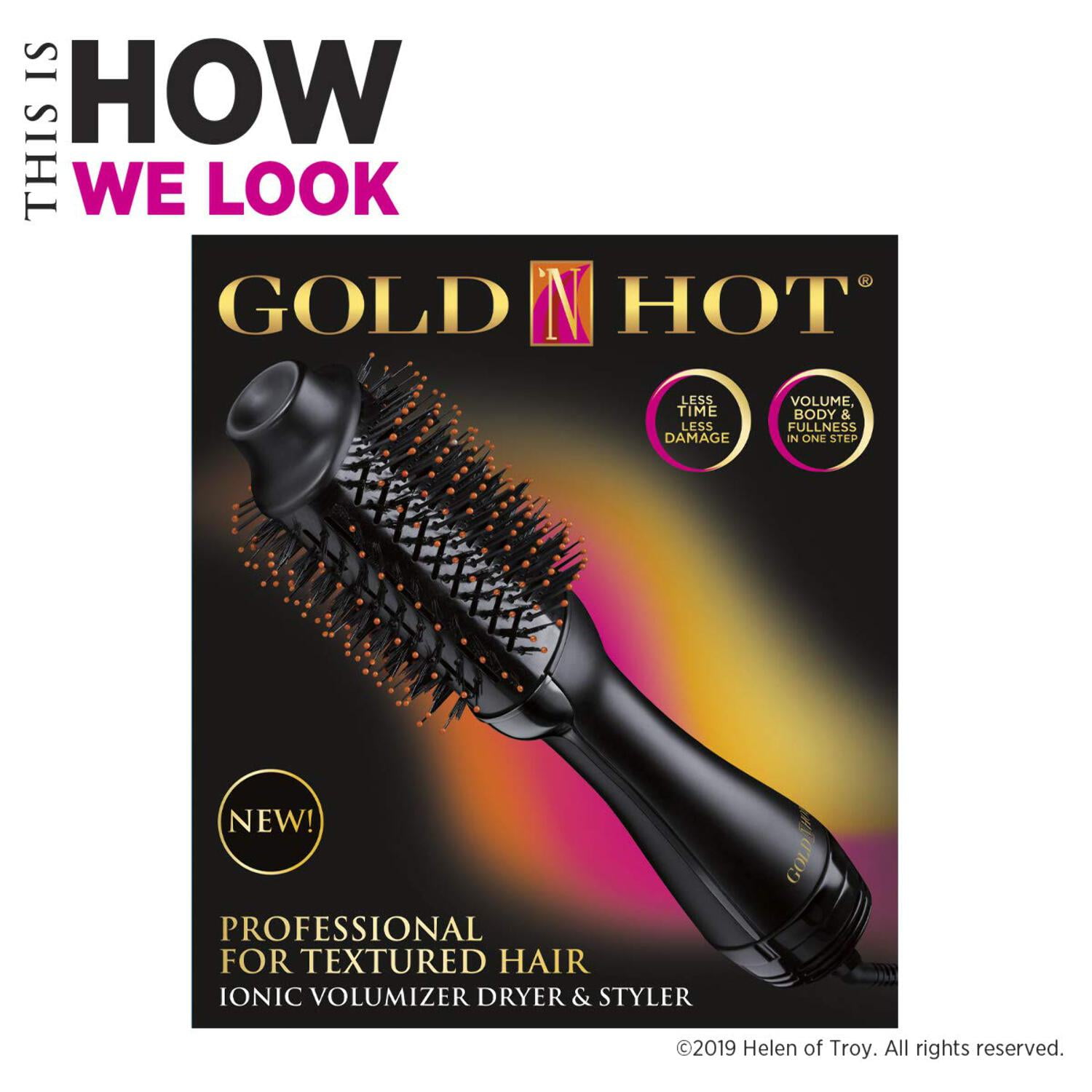 Less Time Less Damage Volume Body and Fullness In One Step Ceramic: For even heat distribution and helps prevent heat damage Ions for increased softness, shine, and reduced frizz Soft, flexible detangling bristles Powerful, precise styling Combined Nylon Pin Ergonomic design Rotating temperature control with 3 heat settings Gold N Hot – Professional For Textured Hair Ionic Volumizer Dryer Styler