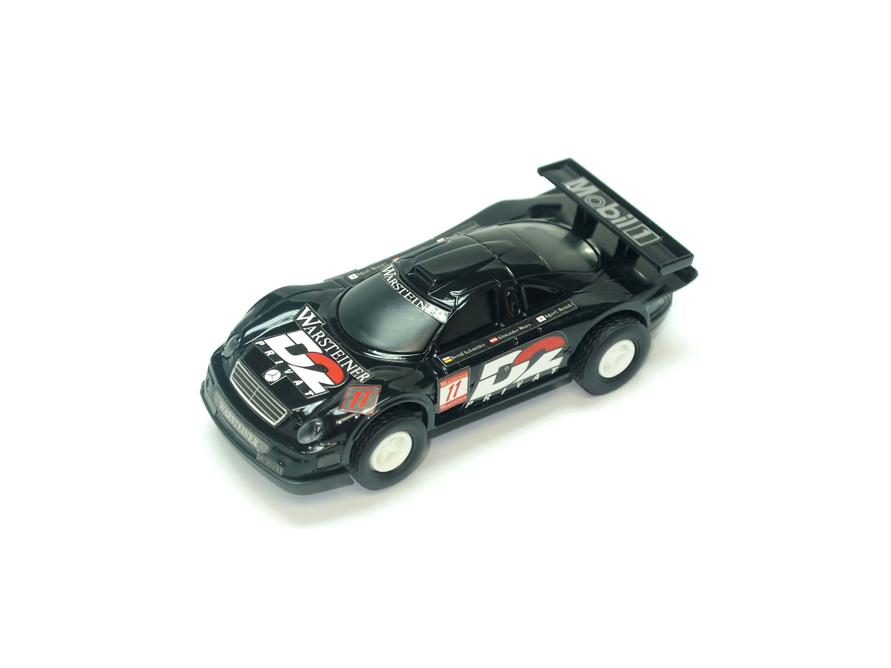 Mercedes Benz CLK GT2 & Nissan Skyline GT-R Licensed Racers with Working Headlight & Magnetic Base. 2 Speed Hand Controllers. Approved Transformer Included. Lap Counter with Power Intake Track. Over 12 feet of track.