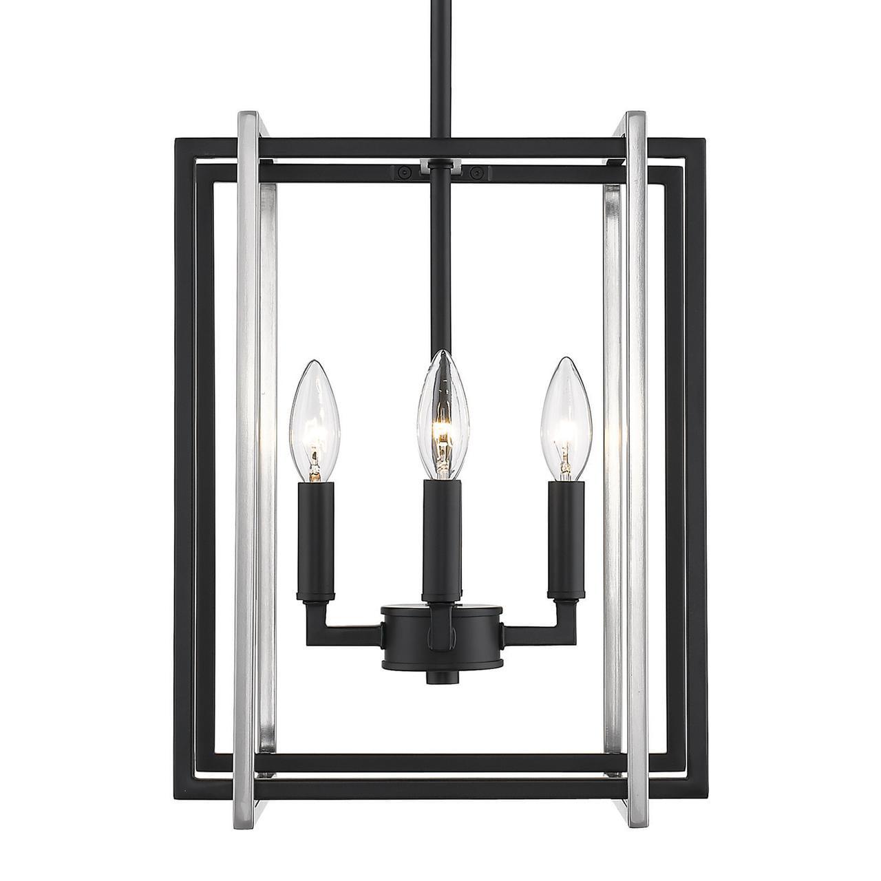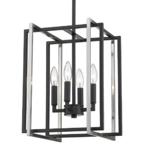 Golden Lighting-6070-4 BLK-PW-Collection: Tribeca, Material: Steel, Finish Color: Black, Width: 12″, Height: 16″, Depth: 12″, Hanging Method: Stem, Lamping Type: Incandescent, Number Of Bulbs: 4, Wattage: 240 Watts, Moisture Rating: Dry Rated, Desc: Tribeca is a contemporary, geometric series of customizable layered boxes. These striking open-cage fixtures bring sophisticated style to a space. Offered in a variety of finish options and silhouettes, including two-tone combinations, this clean transitional design pairs well with modern fashions. This 4-light chandelier creates a dramatic focal point and smooth ambient lighting.