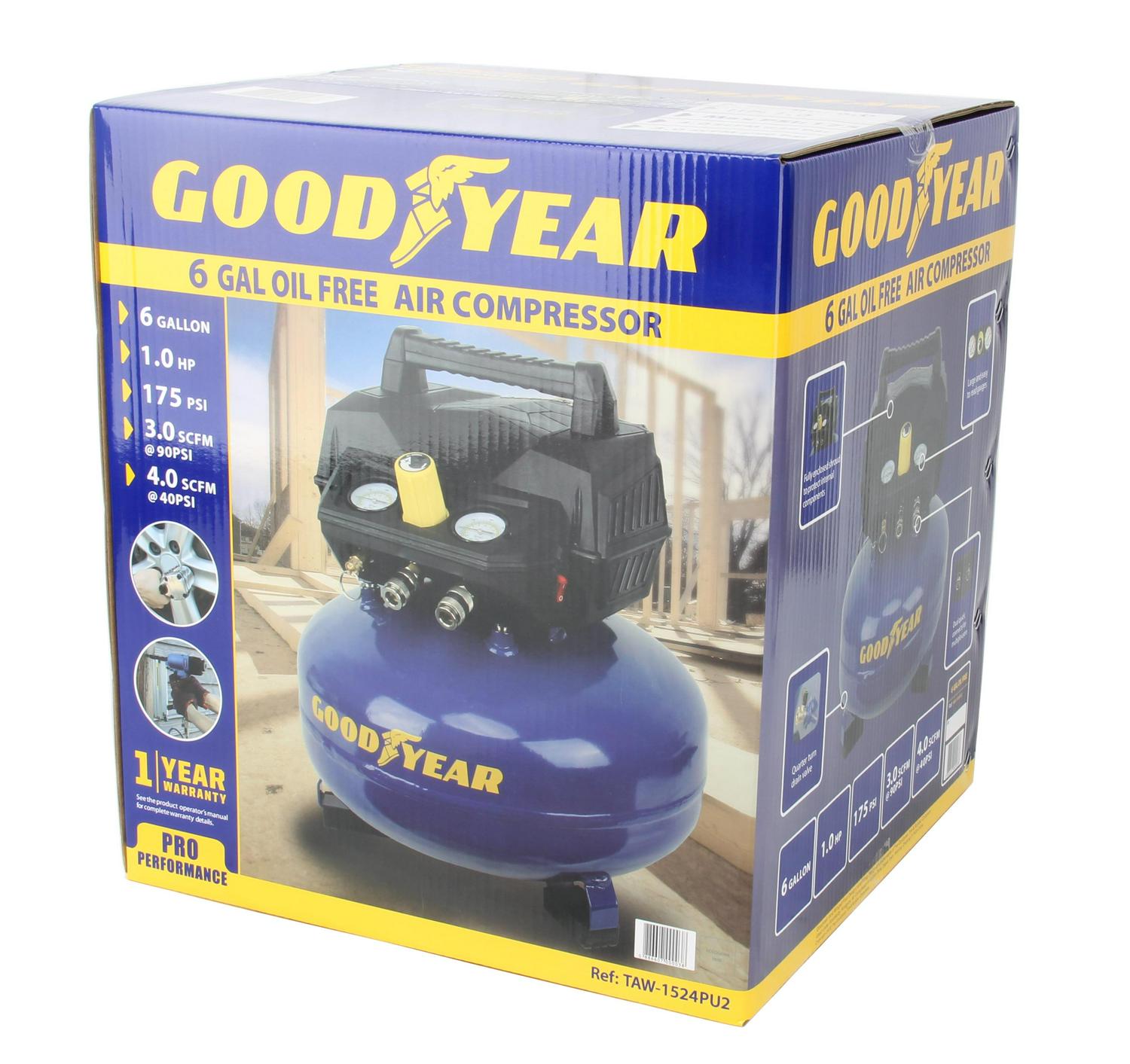 This is a GOODYEAR 6 Gallon Portable Pancake Air Compressor. This compressor boasts of 175 Max Psi with an impressive 4.0 SCFM at 40 PSI and 3.0 SCFM @ 90 PSI. This unit has an oil free maintenance free pump. You do not have to worry about changing the oil and works perfect in cold weather. This unit has a carry handle to maximize portability and only weighing approximately 37 lbs. The GOODYEAR 6 gallon is perfect for trim work and finishing work with duel quick connects. This unit is powerful enough to operate 2 nailers at a time. Everything you need to get the job done.