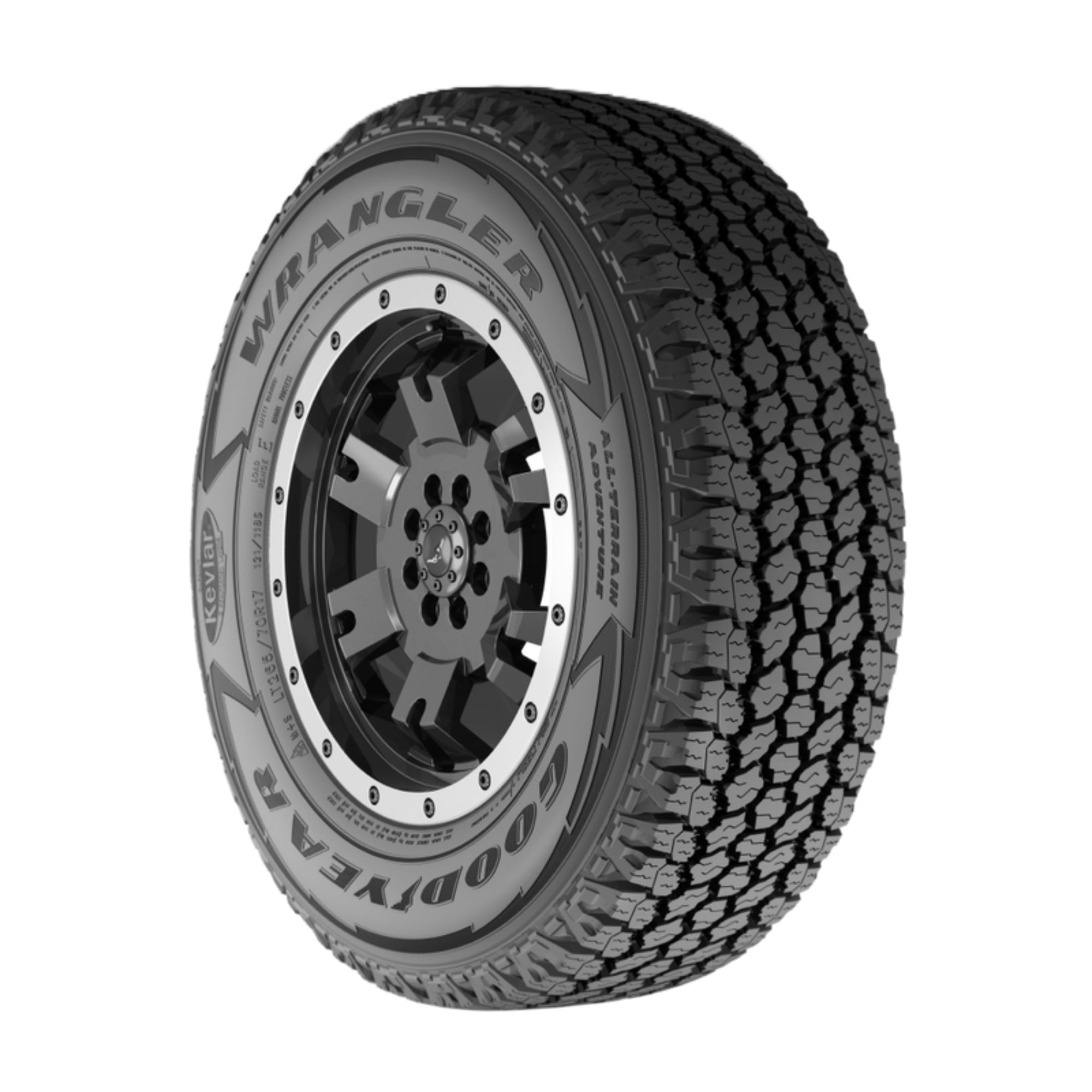 Goodyear Wrangler All-Terrain Adventure with Kevlar 245/75R17 112T OVERVIEW The Goodyear Wrangler All-Terrain Adventure with Kevlar is a premium all-terrain tire specially designed for drivers who are looking for off-road versatility, durability, and comfort. Ideal for light trucks, vans, one-ton pickup trucks, and SUVs, the Goodyear Wrangler All-Terrain Adventure with Kevlar features a specialized, strong rubber tread compound molded into a multi-faceted symmetric tread pattern. The combination of both the compound and the pattern gives the tire a rugged and aggressive look. Just perfect for driving on and off the road. To help clear mud and snow are the open shoulder blocks and outboard circumferential grooves. The sidewall rubber compound is made with Goodyear’s Durawall Technology which makes the polyester cord resistant to punctures, scuffing, abrasion, and cuts. The Goodyear Wrangler All-Terrain Adventure with Kevlar is branded with the mountain/snowflake symbol which means it has passed the auto industry’s severe snow service standards.