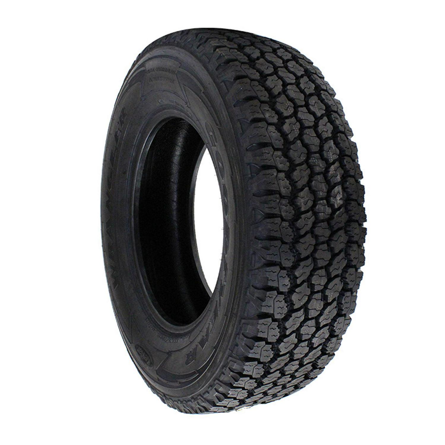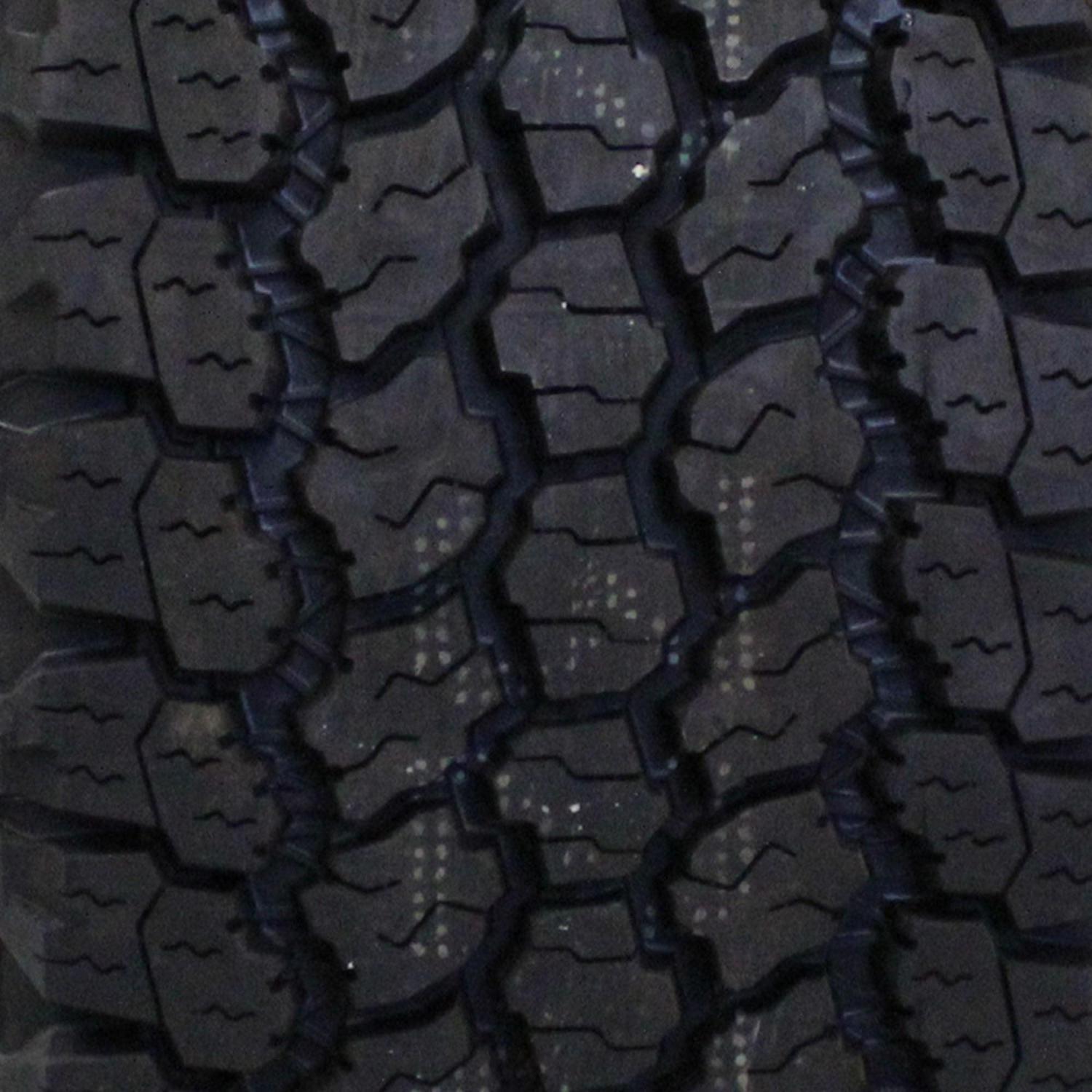 The Goodyear Wrangler All-Terrain Adventure with Kevlar is a premium all-terrain tire specially designed for drivers who are looking for off-road versatility, durability, and comfort. Ideal for light trucks, vans, one-ton pickup trucks, and SUVs, the Goodyear Wrangler All-Terrain Adventure with Kevlar features a specialized, strong rubber tread compound molded into a multi-faceted symmetric tread pattern. The combination of both the compound and the pattern gives the tire a rugged and aggressive look. Just perfect for driving on and off the road. To help clear mud and snow are the open shoulder blocks and outboard circumferential grooves. The sidewall rubber compound is made with Goodyear’s Durawall Technology which makes the polyester cord resistant to punctures, scuffing, abrasion, and cuts. The Goodyear Wrangler All-Terrain Adventure with Kevlar is branded with the mountain/snowflake symbol which means it has passed the auto industry’s severe snow service standards.