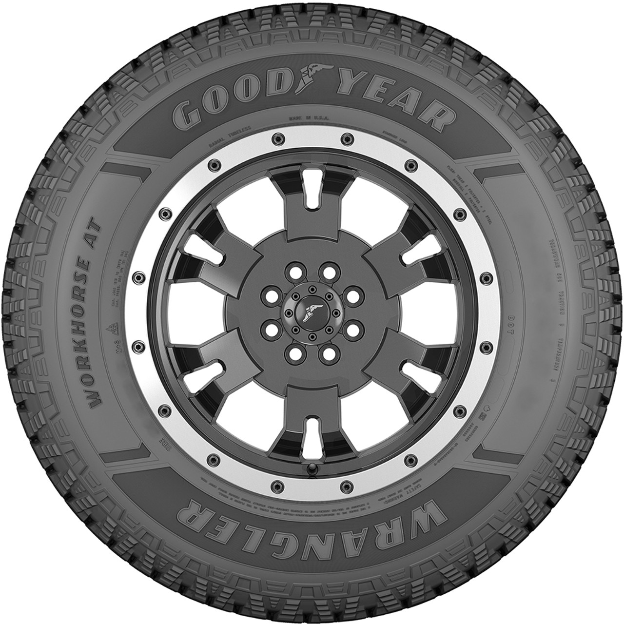 The Goodyear Wrangler Workhorse AT is an all terrain, all season tire made for SUVs and light trucks. Goodyear offers a 50,000 mile treadwear warranty with this model.