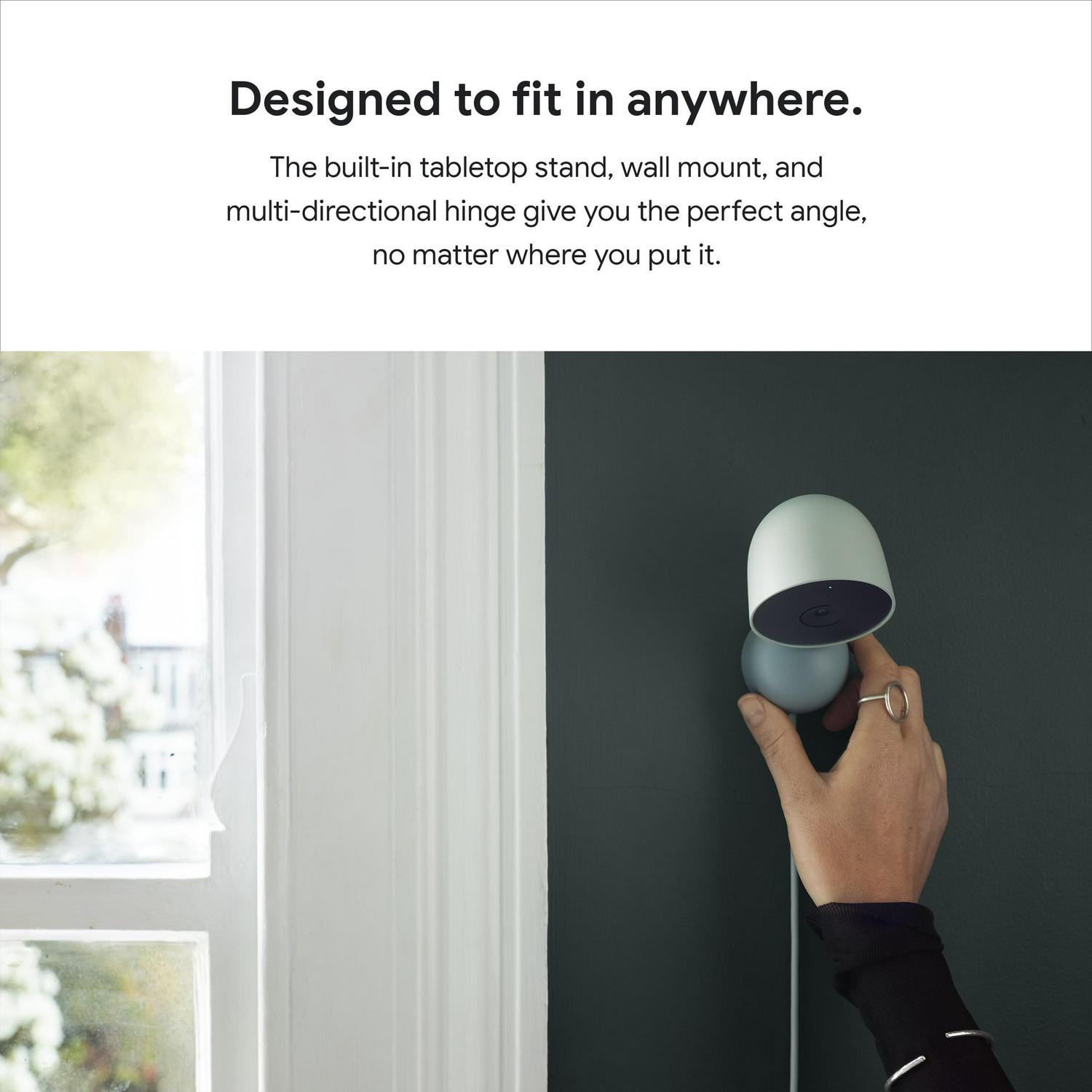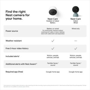 The indoor Nest Cam has built-in intelligent alerts that notify you when there s activity. The camera knows the difference between a person, pet, and vehicle, and only sends alerts about what s important to you. You can even teach it to recognize familiar faces, so you know who s coming and going. (1) See what s happening anytime with 24/7 live view, and talk and listen from the Google Home app. (2) If you miss something, you can go back and check what happened with 3 hours of free event video history. And Nest Cam is designed to fit any style, with a range of colors and a tabletop stand that can also be mounted on a wall.