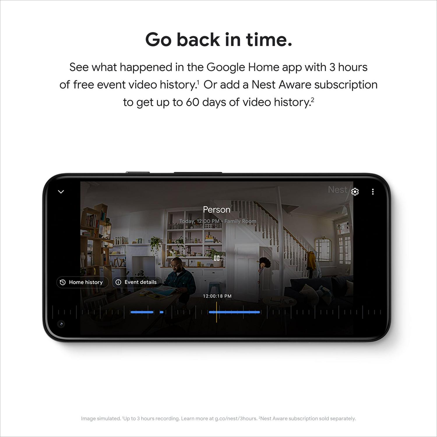 – Go back in time. See what happened in the Google Home app with 3 hours of free event video history.(1) Or add a Nest Aware subscription to get up to 60 days of video history.(2)
