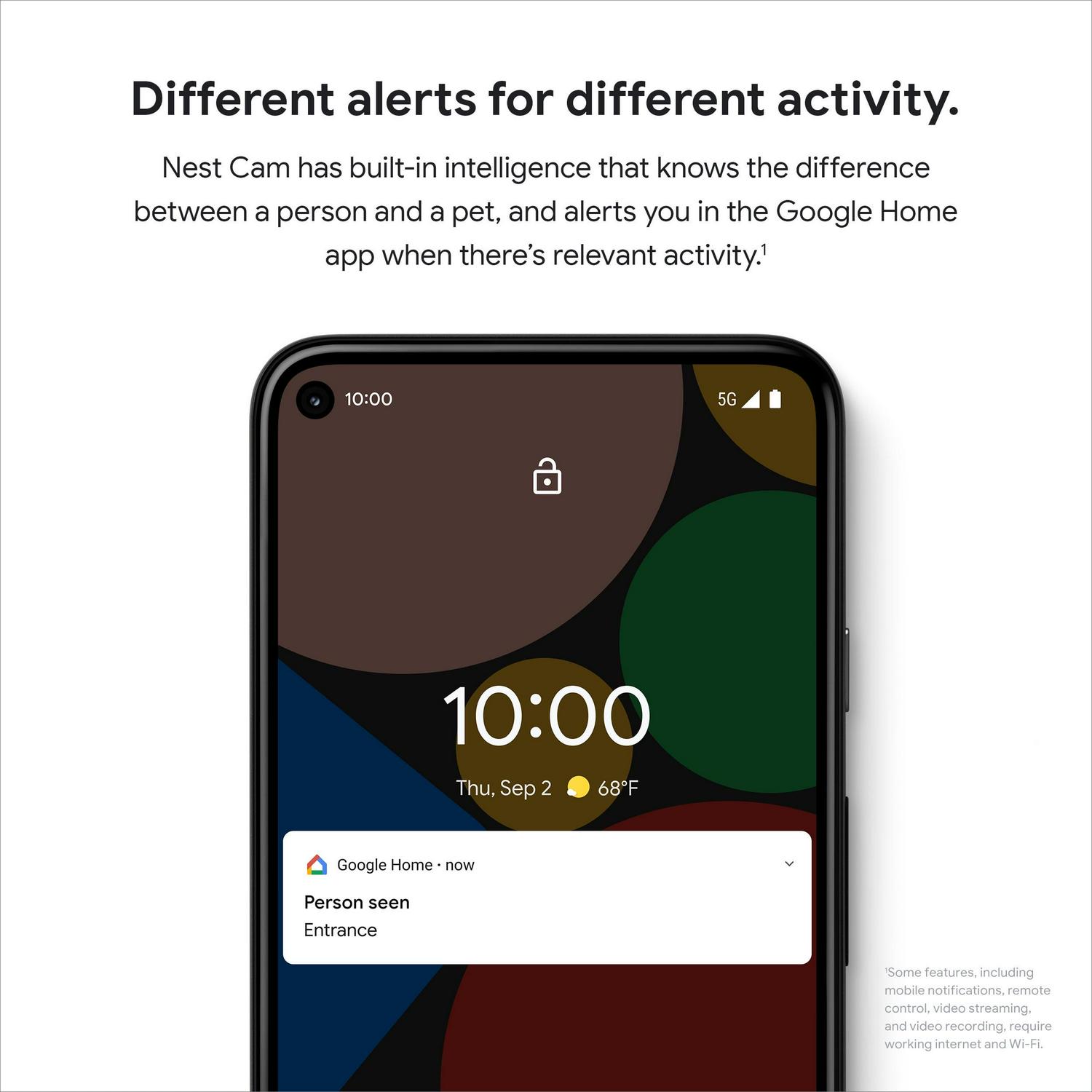 – Different alerts for different activity. Nest Cam has built-in intelligence that knows the difference between a person and a pet, and alerts you in the Google Home app when there s relevant activity. (1)
