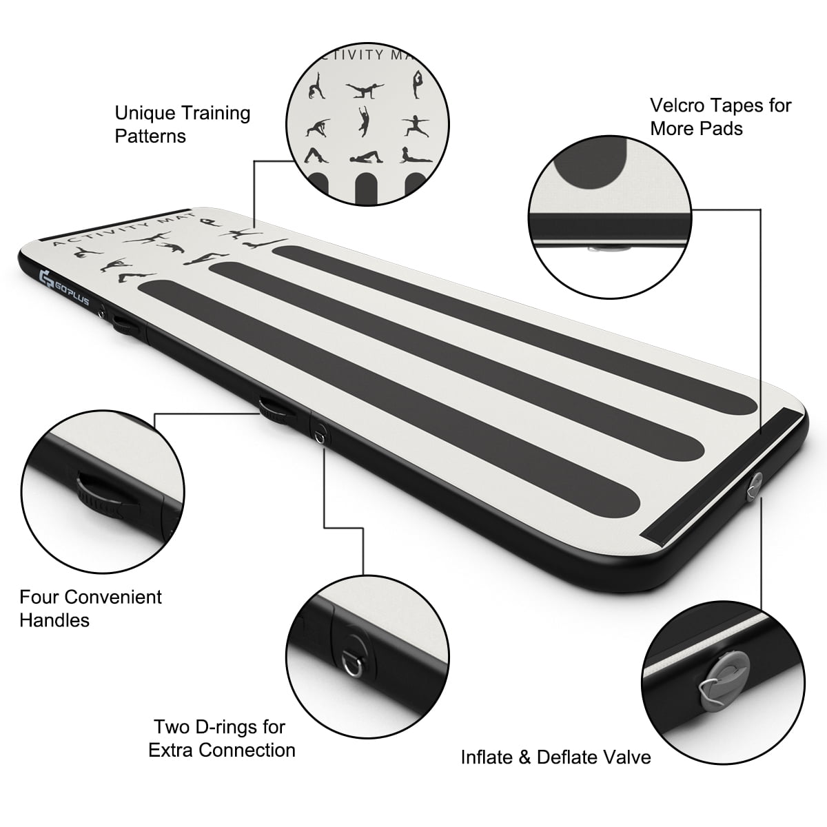 Premium & Selective PVC Material: This gymnastic mat is made from PVC material, featuring with two thicken PVC layers of 0.7mm. The outer PVC layer has an anti-slip and waterproof surface to guarantee great safety during training. Drop stitch fabric between two PVC layers is durable enough without being torn easily. Hook and Loop Fasteners & D-rings for More Mats: Hook and loop fasteners on the head of the mat can allow you connecting several mats together to create a larger activity space. Different from other common mats, our air track mat features D-rings, making it possible to connect other mats to both sides. Wide Application: This inflatable gymnastic mat can be placed on the floor of your home or gym in high performance training, such as tumbling practice, martial arts, gymnastics and yoga. Moreover, you can enjoy exercise on the beach, background, grassland or even on the water. Easy to Carry and Store: The mat can be deflated and rolled into a compact and cylinder shape easily. Compared with traditional foam-based mat, it occupies less space. Storage would be simple. With a carrying bag, it is also quite economic and convenient for transportation. Practical Accessories: An electric air pump is of course included in the package. With a power of 500W and max 2PSI pressure, this pump works efficiently to save your energy and is easy to inflate the mat within minutes. Repairing kit is provided for more convenience.