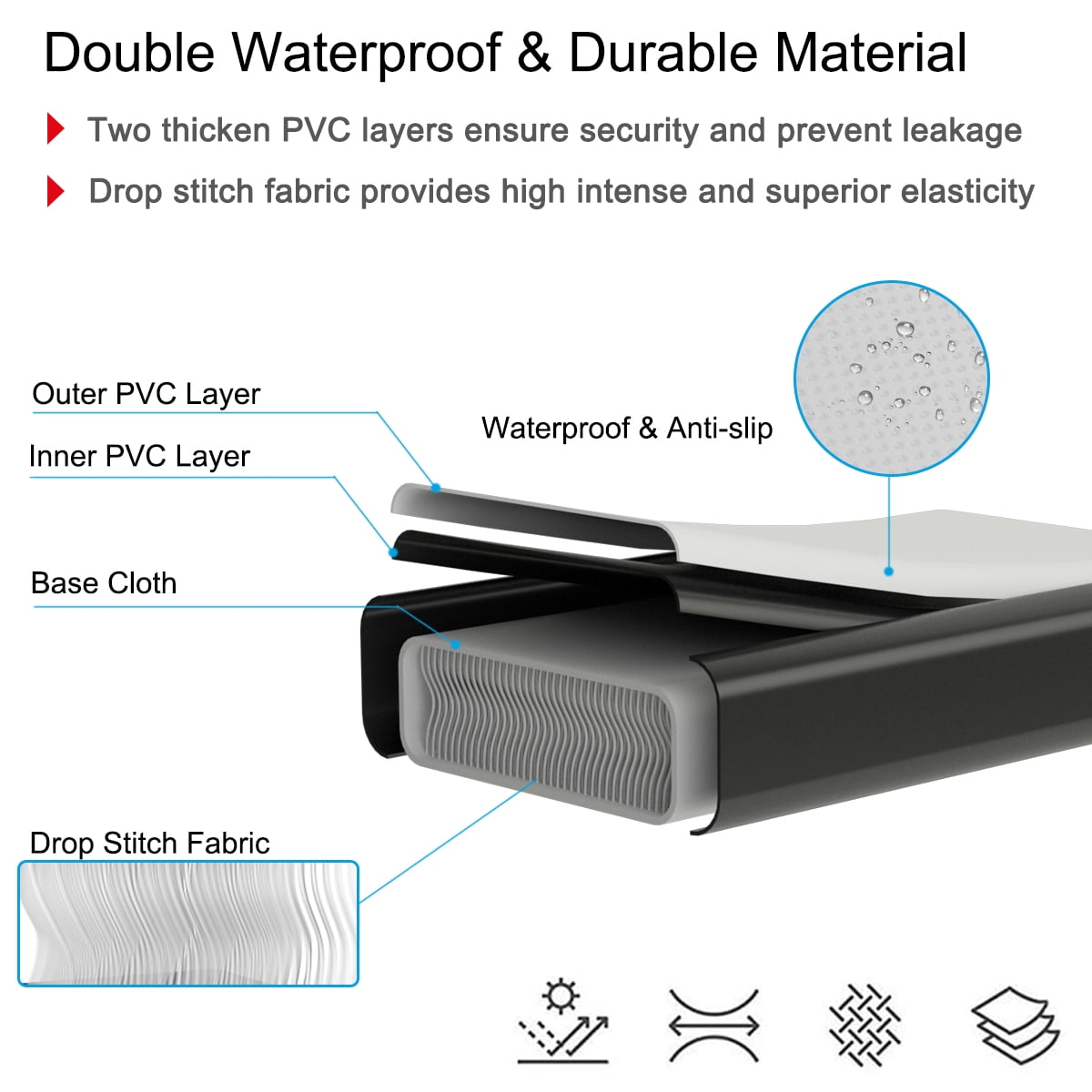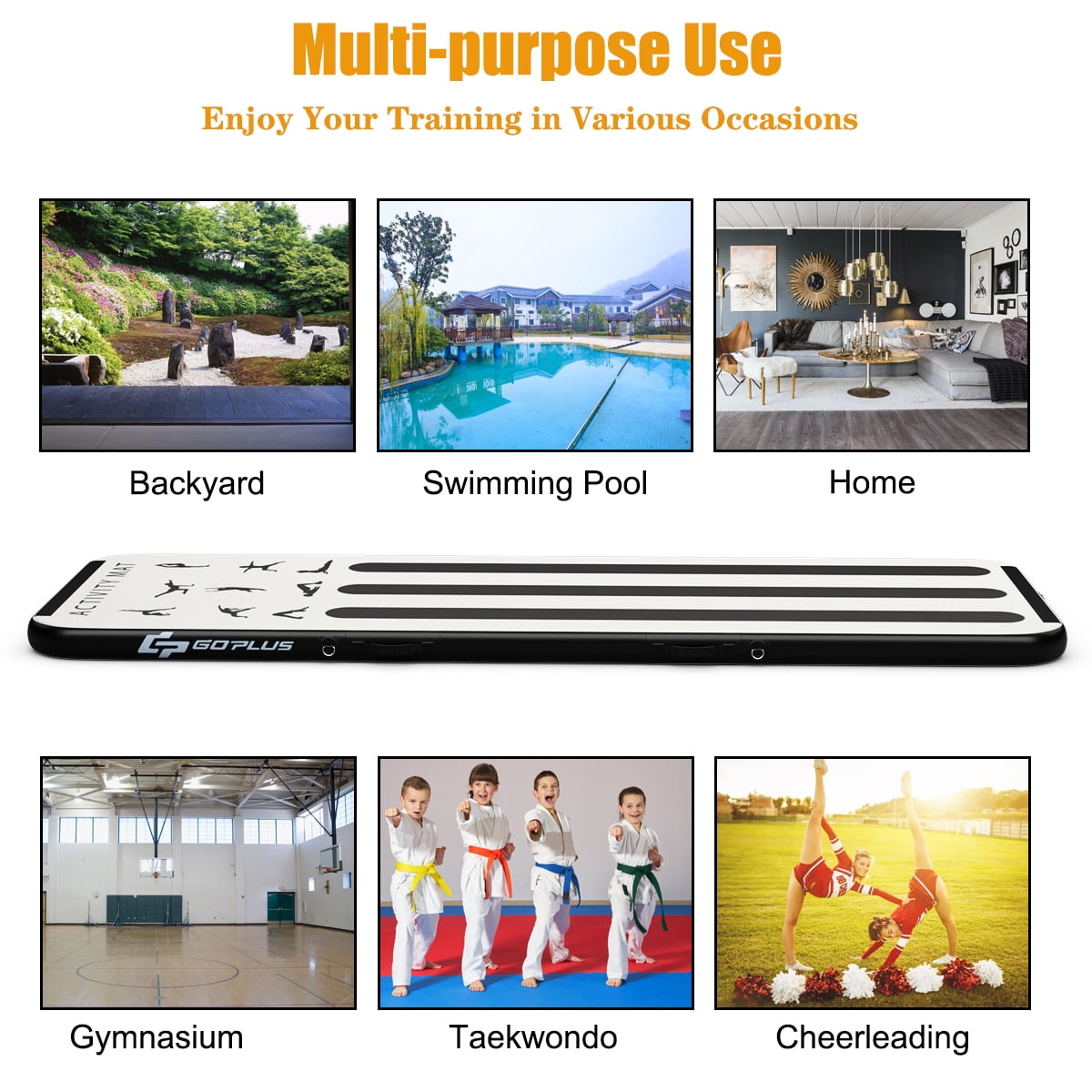 Do you want to do the various activities in your home or backyard without getting out to the gym paying great fees? Our inflatable gymnastic mat will be the best choice! Thanks to its premium PVC material, it is safe to jump and land on freely. There’s no need to worry about accidental broken of mat as an air pump and a repairing kit are provided for your convenience. As it can be folded easily, it is convenient for you to carry and store easily. This inflatable gymnastic mat is great for gymnastics, tumbling, cheer leading, free running, stunting, martial arts, and water yoga! Feature Two-layer thick PVC material is waterproof, non-slip, durable and not easy to be torn Drop stitch fabric provides high intense and superior elasticity Hook and loop fasteners and D-rings help connect two or more mats together for different needs Waterproof material makes it easy to clean and can be used on the water Good sealing performance to ensure long service time once inflated Powerful electric pump with high pressure to help inflate the mat quickly Fast deflation and compact folding design easy to be stored at the corner to save space Handles and carrying bag convenient for transportation when going out A repairing kit included for more convenience Perfect for gymnastics, tumbling, free running, stunting, martial arts, water yoga,etc Specification Color: Black Material: PVC Length: 10ft Width: 3ft Thickness: 4inch Wire Length: 6ft Net Weight: 22lbs Max Pressure: 2PSI Package includes: 1 x Inflatable Gymnastic Mat 1 x Electric Air Pump 1 x Handle Bag 1 x Repairing Kit 1 x Instructions