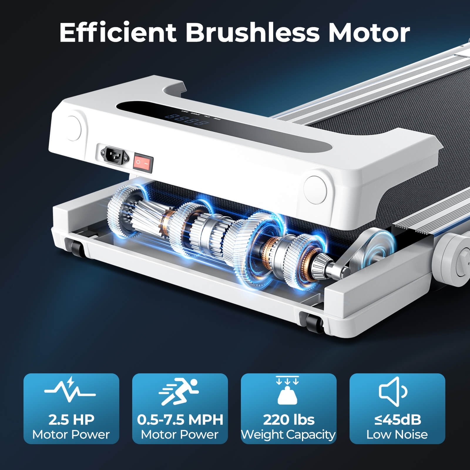 Our 3-in-1 treadmill perfectly combines the advantages of treadmills, walking machines and working machines, which is a perfect choice for family and office workout. The 2.25 HP motor is powerful but quiet in operation. And the speed can be adjusted from 0.5Mile/H-7.5Mile/H, allowing users to choose different exercising state. The large LCD display provides clear data, so you can monitor speed, time, step distance, distance and calories in real time. Bluetooth speakers and mobile phone holders allow you to enjoy music or favorite movies during your workout. When you finish exercising, the folding design and flexible wheels make it easy for you to store or move it from one room to another. Come to get it and have a healthy body easily! Feature 3 in 1 design and removable tabletop is perfect for working, jogging, running 0-4MPH when the riser put down and 0-7.5MPH when the riser stand up Powerful 2.25 hp quiet motor significantly enhance sports effect Connect the treadmill to your phone through Bluetooth to enjoy music Built-in flexible transport wheels make it easy to move and store Safety key is used for emergency braking and can avoid safety accidents 5-layer shock-absorbing running belt reduces impact during sports Phone holder help you to enjoy movies while running Large and detachable table is used to place computers or other materials 16” widened running belt allows you to run freely Rubber foot pads greatly reduce impact LCD display screen helps to monitor speed, distance, time, step and calories in real-time Included remote control is convenient to adjust speed from 0.5Mph-7.5Mph Specification Color: Black/White Material: Steel + ABS + PVC + HDF Overall Dimensions: 52.5” x 26” x 42.5” (L x W x H) Folding Dimensions: 54” x 26” x 6” (L x W x H) Acrylic Panel Dimensions: 28.5” x 13.5” x 0.5” (L x W x H) Running Belt Dimensions: 41” x 16” (L x W) Phone Holder Dimensions: 8” x 4.5” x 2.5” (L x W x H) Working Voltage: AC 110V 60Hz Peak Motor Power: 2.25HP Speed: 0.5MPH-7.5MPH Screen Display: Time, Calorie, Speed, Distance, Step Count Weigh Capacity: 220 lbs Item Weight: 73.5 lbs Certification: UL Package includes: 1 x 3-in-1 Treadmill 1 x Phone Holder 1 x Acrylic Panel 1 x Remote Control 1 x Safety Key 1 x Power Cord 1 x User manual
