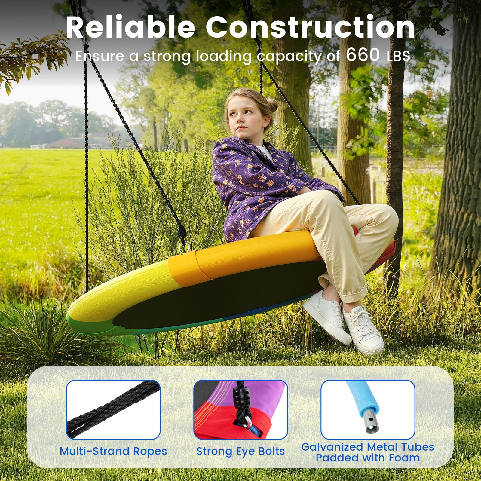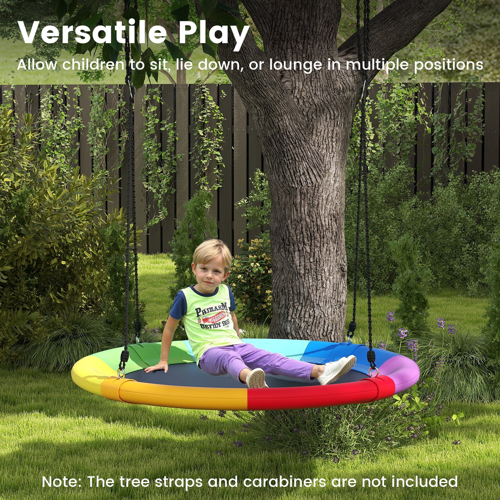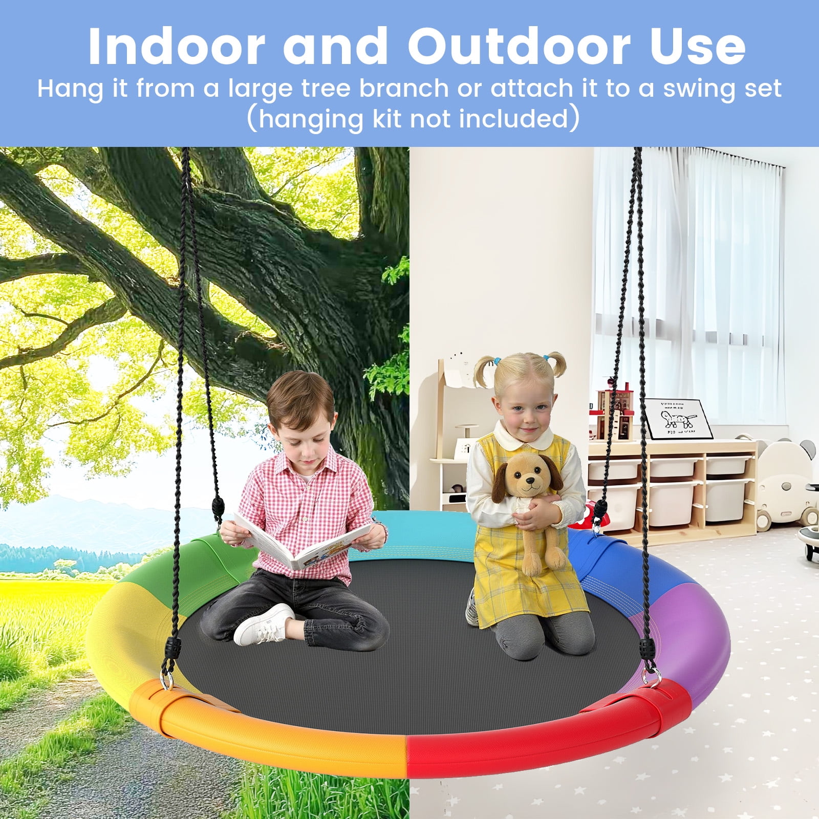 Year-round Fun for Children: Our giant 40” flying saucer tree swing is popular among children and adults! Its unique design and attractive appearance allow for exciting swinging year-round. There is no doubt that the entire family could harvest happiness from this product. Safe Material and Large Capacity: Considering the problems of safety, our product is made of the strongest and safest materials such as 600D oxford fabric, PP cloth and an industrial strength steel frame. With a strong load-bearing capacity, our swing can handle multiple children at the same time. Adjustable Height to Meet Your Needs: The rope is 63 inches in length, which can be adjusted as you like in the range from 40 inches to 63 inches. You may adjust the height and choose the most appropriate one for your children to relax as the condition changes. Multiple Functions for Various Situations: This kind of tree swing can be used for many purposes, such as sitting, reading, sleeping, and playing. It will supply so much fun to both children and parents! It can be used in many places, such as in the backyard, park, on trees, swing sets and etc. Easy Assembly and Installation: If it’s complicated to put together and take apart a swing, it cannot be called as a good one. Rather, our swing was designed with simplicity. It’s universal and versatile design allows for quick and painless installation. Just a take a moment to hang it from a large tree branch or attach it to a swing set. Feature Provides a fun hang out space for kids to safely spin or swing into action during playtime Easy to set up and storage can be hung from an existing swing set or by two ropes in a Tree 600D oxford fabric and steel construction ensure great load-bearing capacity Long life with anti-aging feature, soft, ductile and wearable Large enough for multiple children to swing and play together Adjustable heights to satisfy various needs Perfect lounging space to play, read, listen to music, daydream, relax Resilient and resistant to all types of weather Specification Color: Red + Orange + Yellow + Green + Blue + Purple Net Weight: 6.0lbs Max Capacity:700lbs Material: PP Cloth + 600D Oxford Fabric + Hot-dip Galvanized Steel Adjustable Height: 40” ~ 63” Diameter: 40.0” Package includes: 1 x Flying Saucer Tree Swing 1 x User Guide