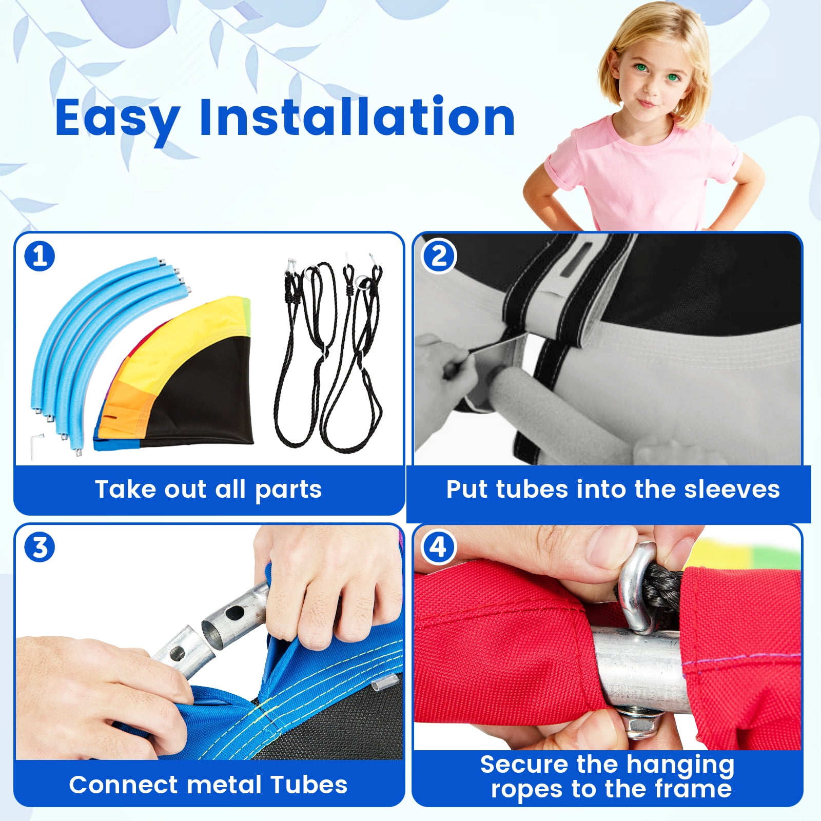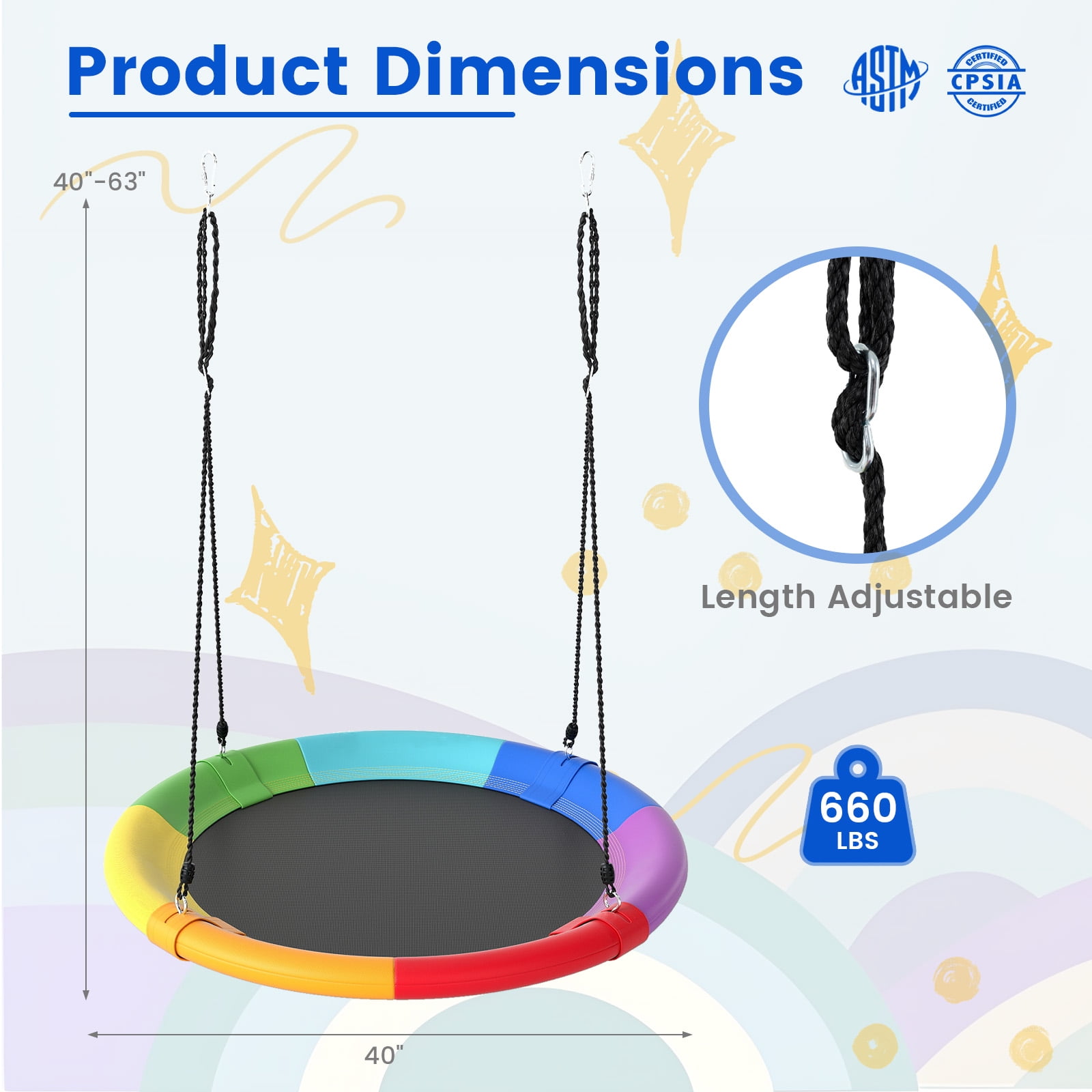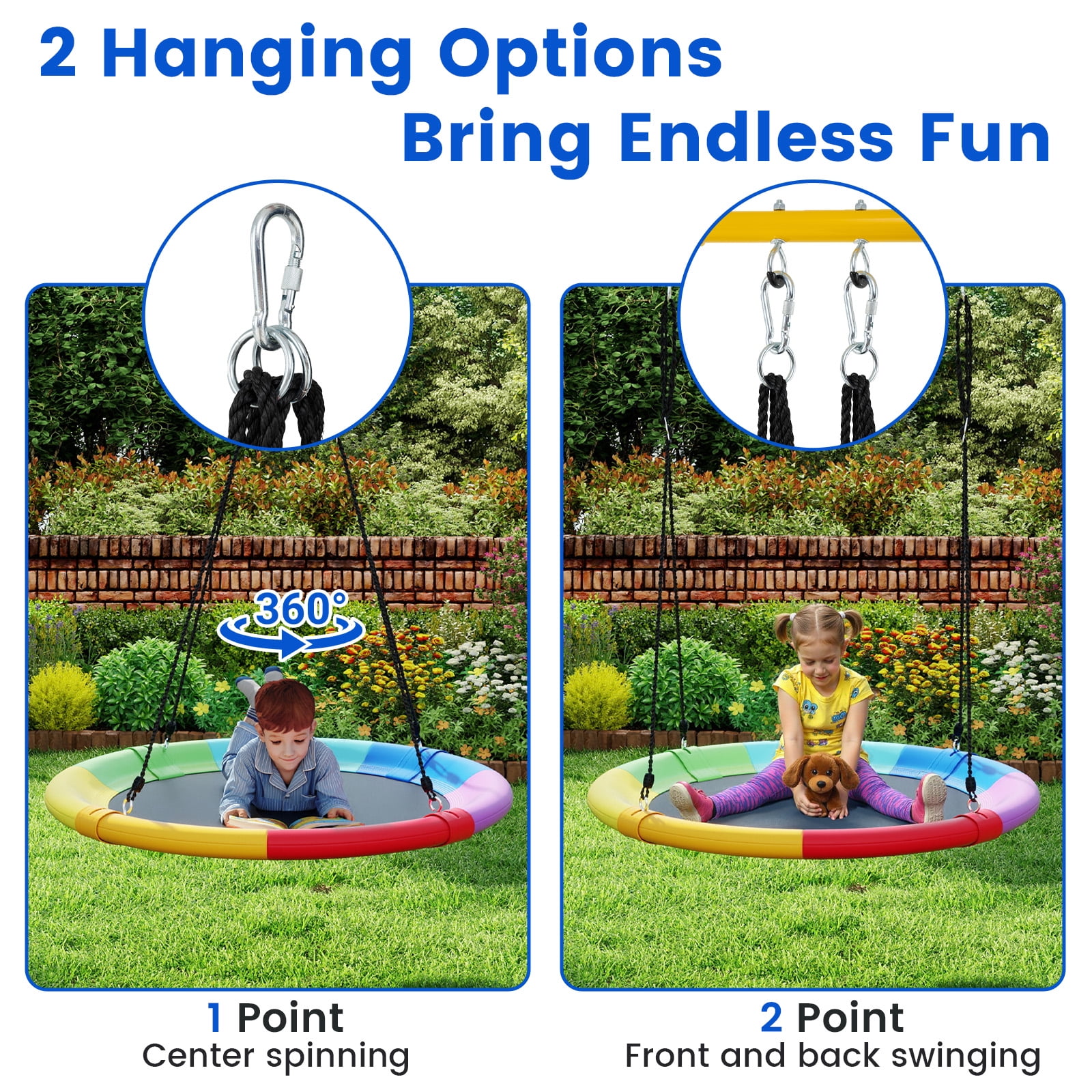 Year-round Fun for Children: Our giant 40” flying saucer tree swing is popular among children and adults! Its unique design and attractive appearance allow for exciting swinging year-round. There is no doubt that the entire family could harvest happiness from this product. Safe Material and Large Capacity: Considering the problems of safety, our product is made of the strongest and safest materials such as 600D oxford fabric, PP cloth and an industrial strength steel frame. With a strong load-bearing capacity, our swing can handle multiple children at the same time. Adjustable Height to Meet Your Needs: The rope is 63 inches in length, which can be adjusted as you like in the range from 40 inches to 63 inches. You may adjust the height and choose the most appropriate one for your children to relax as the condition changes. Multiple Functions for Various Situations: This kind of tree swing can be used for many purposes, such as sitting, reading, sleeping, and playing. It will supply so much fun to both children and parents! It can be used in many places, such as in the backyard, park, on trees, swing sets and etc. Easy Assembly and Installation: If it’s complicated to put together and take apart a swing, it cannot be called as a good one. Rather, our swing was designed with simplicity. It’s universal and versatile design allows for quick and painless installation. Just a take a moment to hang it from a large tree branch or attach it to a swing set. Feature Provides a fun hang out space for kids to safely spin or swing into action during playtime Easy to set up and storage can be hung from an existing swing set or by two ropes in a Tree 600D oxford fabric and steel construction ensure great load-bearing capacity Long life with anti-aging feature, soft, ductile and wearable Large enough for multiple children to swing and play together Adjustable heights to satisfy various needs Perfect lounging space to play, read, listen to music, daydream, relax Resilient and resistant to all types of weather Specification Color: Red + Orange + Yellow + Green + Blue + Purple Net Weight: 6.0lbs Max Capacity:700lbs Material: PP Cloth + 600D Oxford Fabric + Hot-dip Galvanized Steel Adjustable Height: 40” ~ 63” Diameter: 40.0” Package includes: 1 x Flying Saucer Tree Swing 1 x User Guide