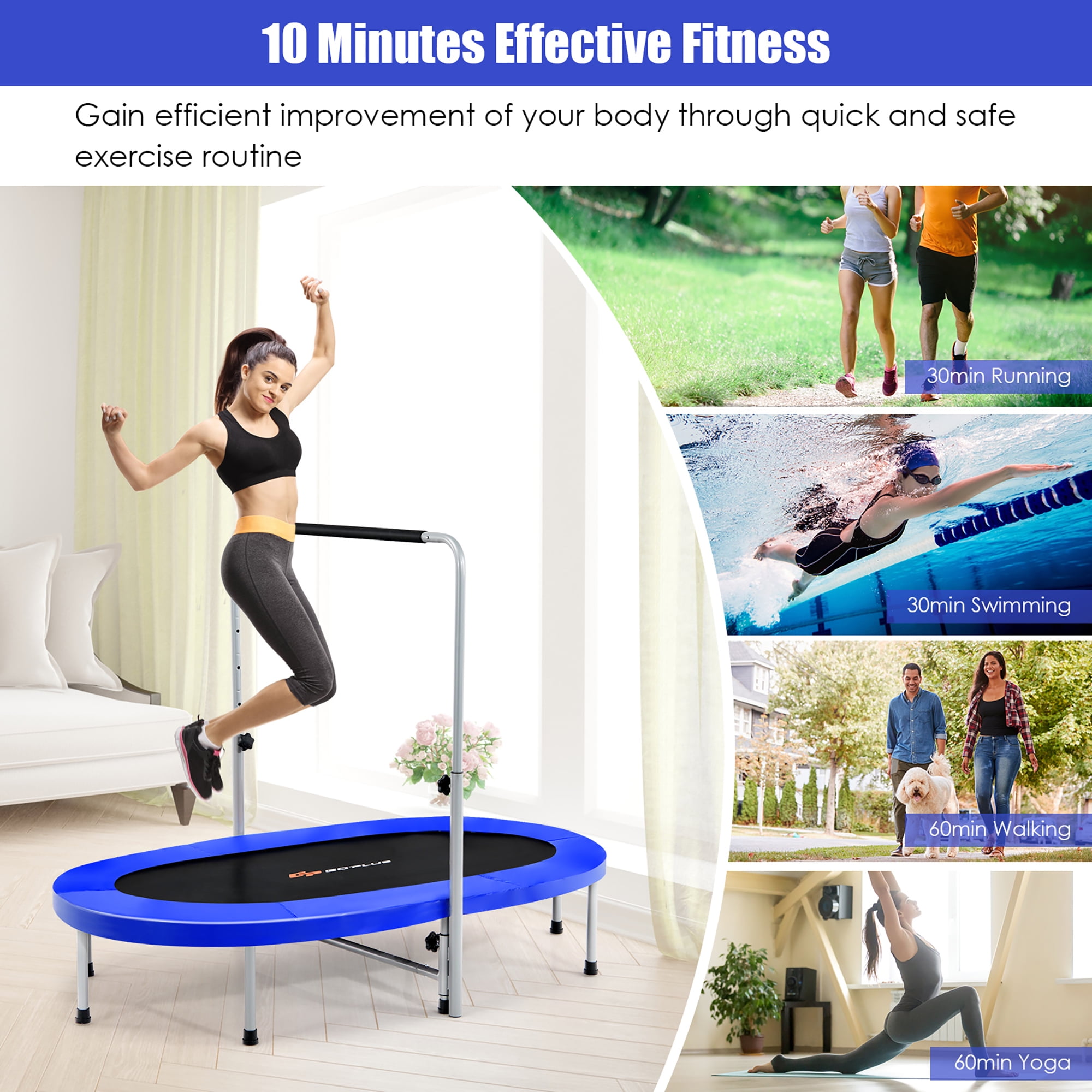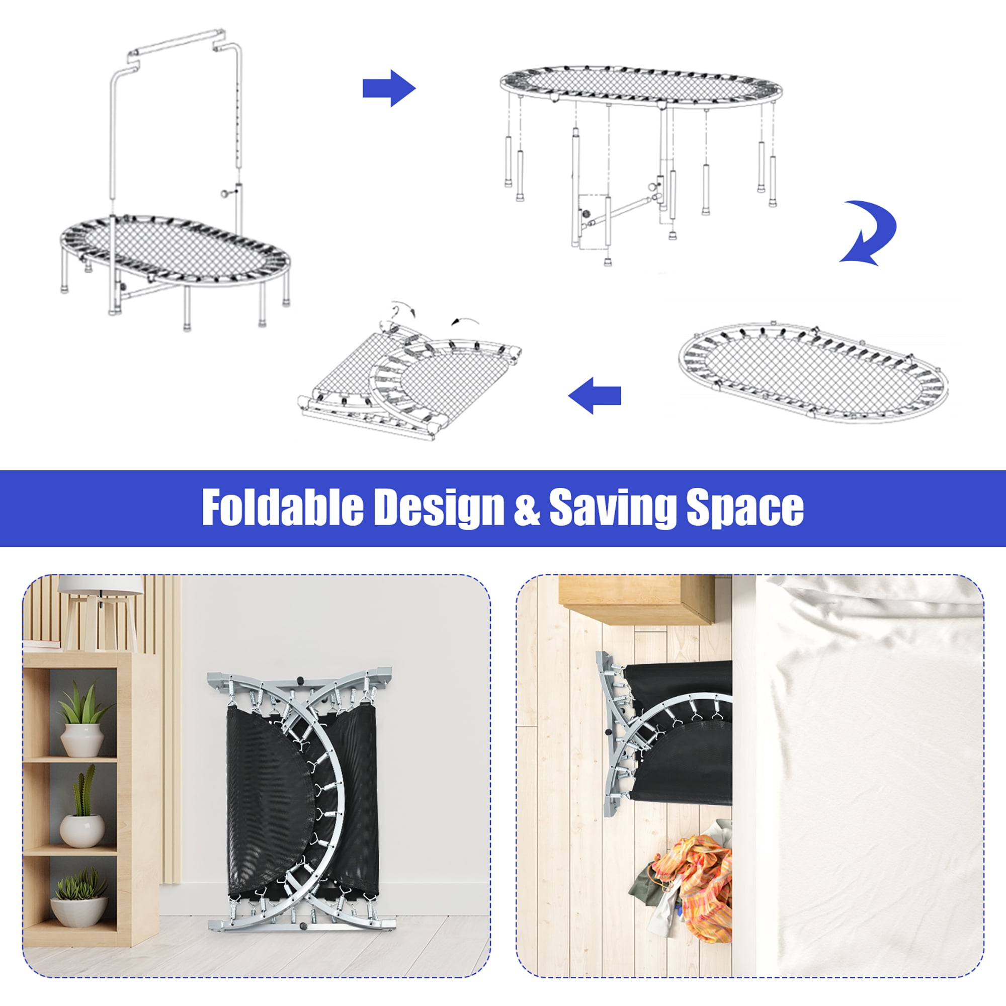 Goplus Adjustable Handrail Foldable Trampoline, Blue, 59.50″ x 35.50″ x 52.00″