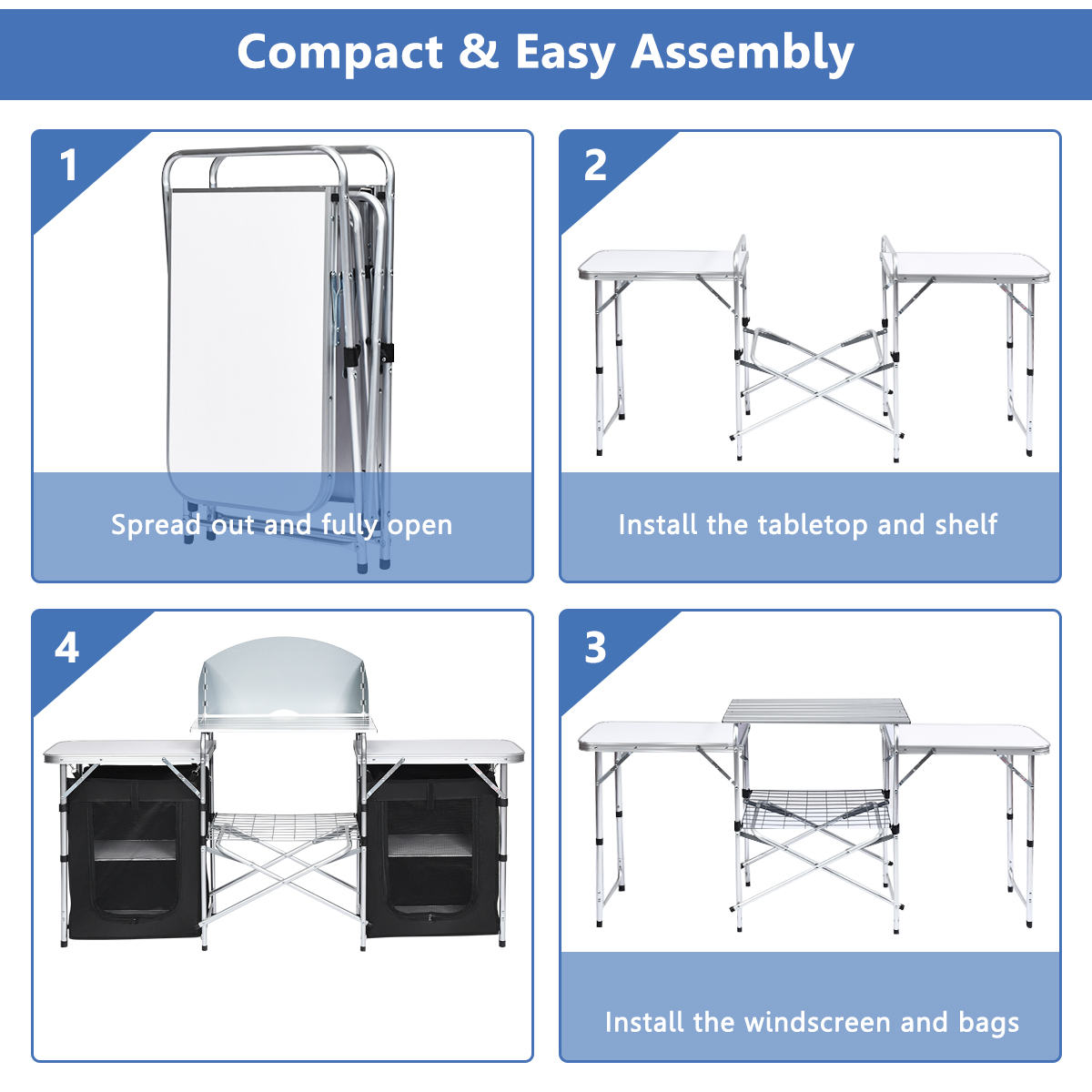 Cooking On the Go: Comes with large cooking table with windscreen, this portable kitchen cook station is the outdoor camping essential to ensure more effective burning and enable you to enjoy a big meal anytime. Perfect for picnics, backyard barbecues, tailgating parties, or an overnight hit outdoors. Stable & Durable Construction: Made of sturdy steel X-shape frame and heavy duty oxford fabric, this portable camping cooking table can hold up to 55 lbs on tabletop and side tables. The round edge cornercan protect your kids from being hit and the rubber sleeve effectively prevents the table from slipping when cooking. Large Utensil Storage Organizer: Large tabletop, two side tables, the lower mesh shelf and two side bags with two shelves are available to store your outdoor kitchen utensil with good classification. And the heat-resistant tabletop accommodates most stoves and coolers. Foldable Design with Carrying Bag: Foldable design gives you convenience to spread the body in seconds. And all the parts are packed in the carrying bag for convenient transportation to sit neatly in the backseat or the trunk of yourcar, ensuring that it won’t be the encumbrance in your sweet travel. Tool-Free Assembly: With detailed installation manual in the package, this camping table can be assembled in minutes requiring no tools. You can effortless set up this camping table for a more joyful grilling experience.