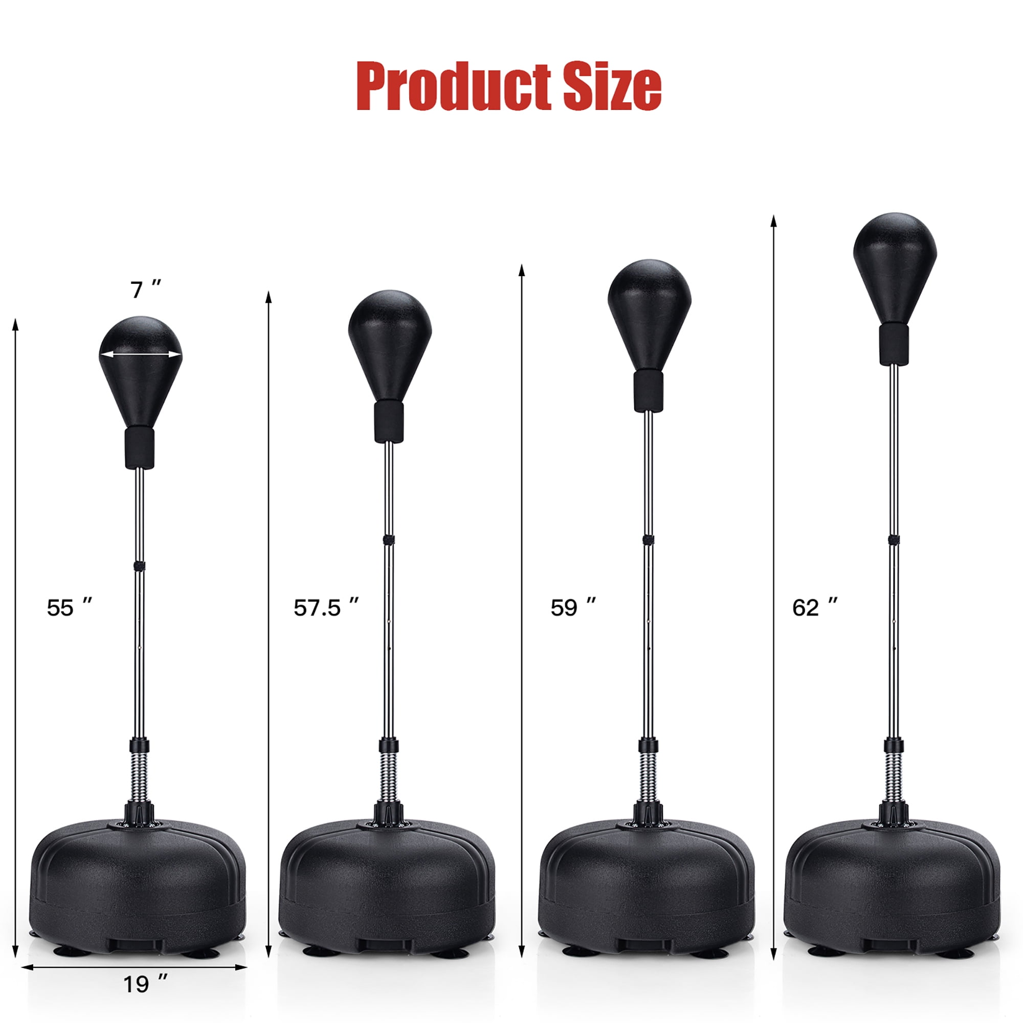 Our freestanding punching bag with stand is a good fitness program suitable for the whole family without going out. 4-position height adjustment aims to reduce the height limit of users and meet the needs of people of different ages. The durable base can hold up to 28L of water or 70.5 lbs of sand for stability. The additional 6 suction cups maximize the stability, no matter what kind of ground can bring excellent performance. The integrated PU material features good impact resistance, which can serve for a long time. Breathable gloves can protect your hands from feeling stuffy. When you are not using it, the boxing ball can be stored in the base and can be easily moved through handles. Feature 4 height adjustment according to the needs of different people The integrated PU boxing ball is more durable and impact resistant The base can be filled with water or sand to keep it stable 6 suction cups allow you to use it on any floor With high-quality spring, for fast rebound and good durability The base can be placed on the boxing bag for easy storage The handle on the side is easy to grasp when moving The included gloves are breathable and protect your hands Multiple uses: fitness, professional training, shaping and more Specification Color: Black, Silver Material: PU+ Steel+ PE Height Range: 55”/57.5”/59”/62” Base Diameter: 19” The Width of The Boxing Ball: 7” Net Weight: 11 lbs Maximum Sand Capacity: 70.5 lbs Maximum Water Capacity: 28L Package Includes: 1 x Freestanding Punching Bag with Stand 1 x Pair of Boxing Gloves 1 x Instruction