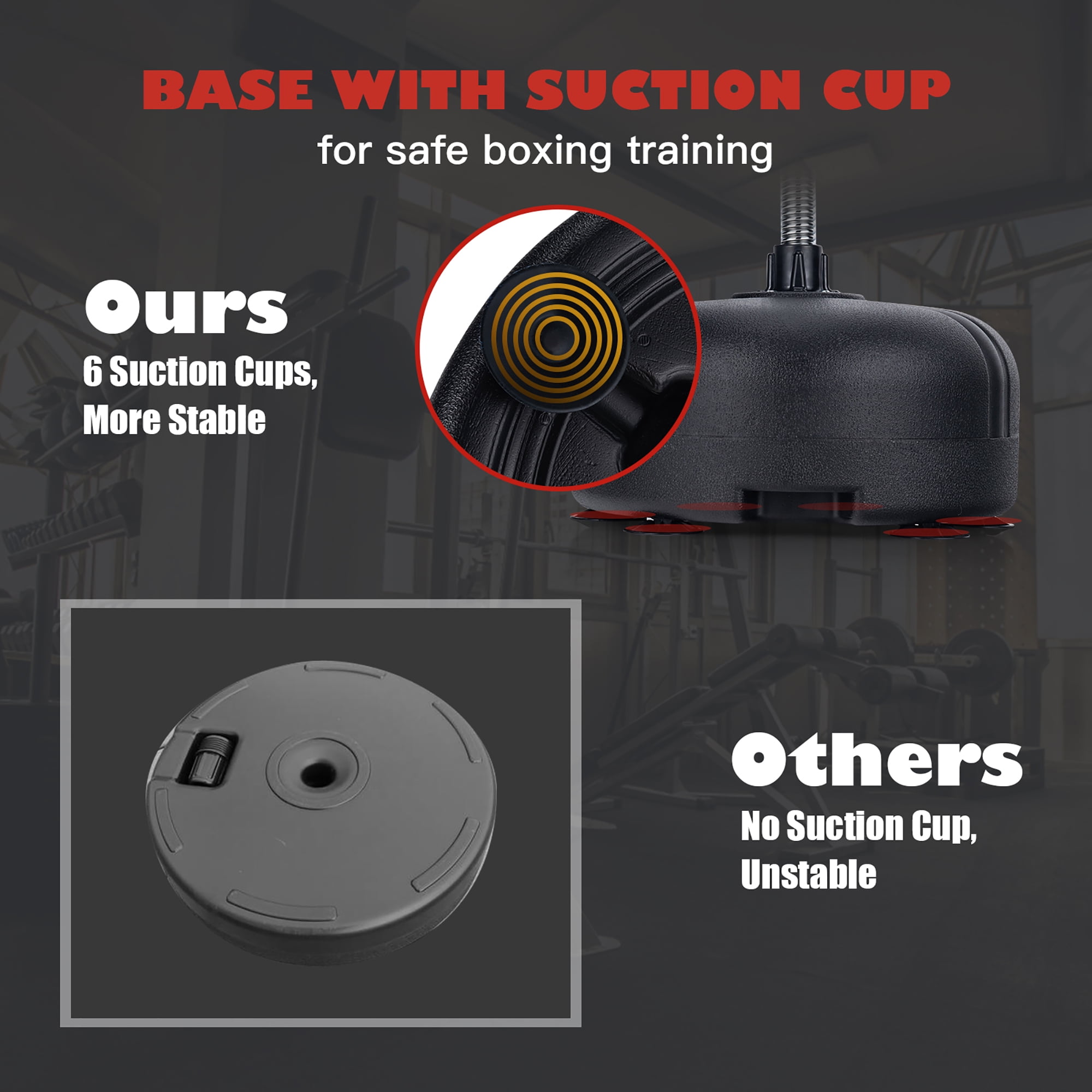 4-Level Adjustable Heights: The boxing bag with stand features a 4-level adjustment function, allowing you to freely choose between the heights of 55”/57.5”/59”/62”. Both kids and adults can quickly find the height that suits them to ensure the best boxing training experience. Firm Base & 6 Suction Cups: The base of this reflex bag can be filled with 28L of water or 70.5lbs sand to increase stability. Other than that, the base is designed with 6 suction cups to ensure that it can be kept in place on various grounds such as lawn, wooden floor, tiled floor, carpet and more during fitness. Integrated PU & High-quality Spring: Compared with most PVC boxing balls on the market, this high-grade punching bag is made of integrated PU, which is more impact-resistant and durable. The high-quality spring is dedicated to ensuring that it can quickly return to the original position after each punch. Breathable Gloves & Convenient Transportation: The included boxing gloves feature small holes to achieve the effect of ventilation and bring a better user experience. The bottom of the base can store boxing balls to facilitate storage. The recessed design on both sides of the base acts as the handle in order to increase the convenience of transportation. Wide Applications: When you feel tired after working for a long time, this boxing training equipment is the best choice to help you release stress. If you want to have a healthier body, the punching bag can help you exercise and fitness. Needless to say, for professional athletes, this boxing ball can help you improve your skills. Besides, boxing can keep children active and enhance hand-eye coordination.