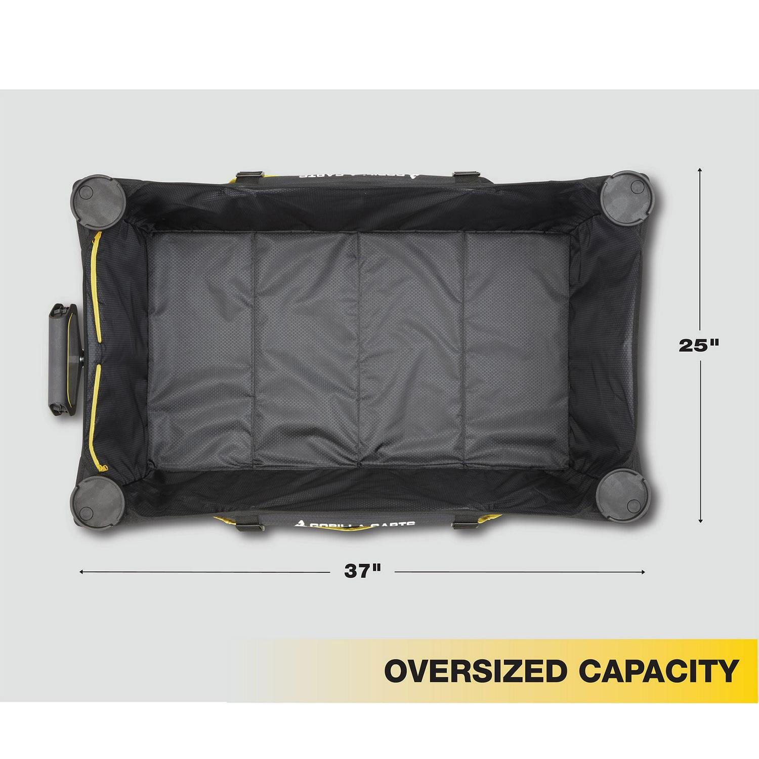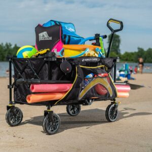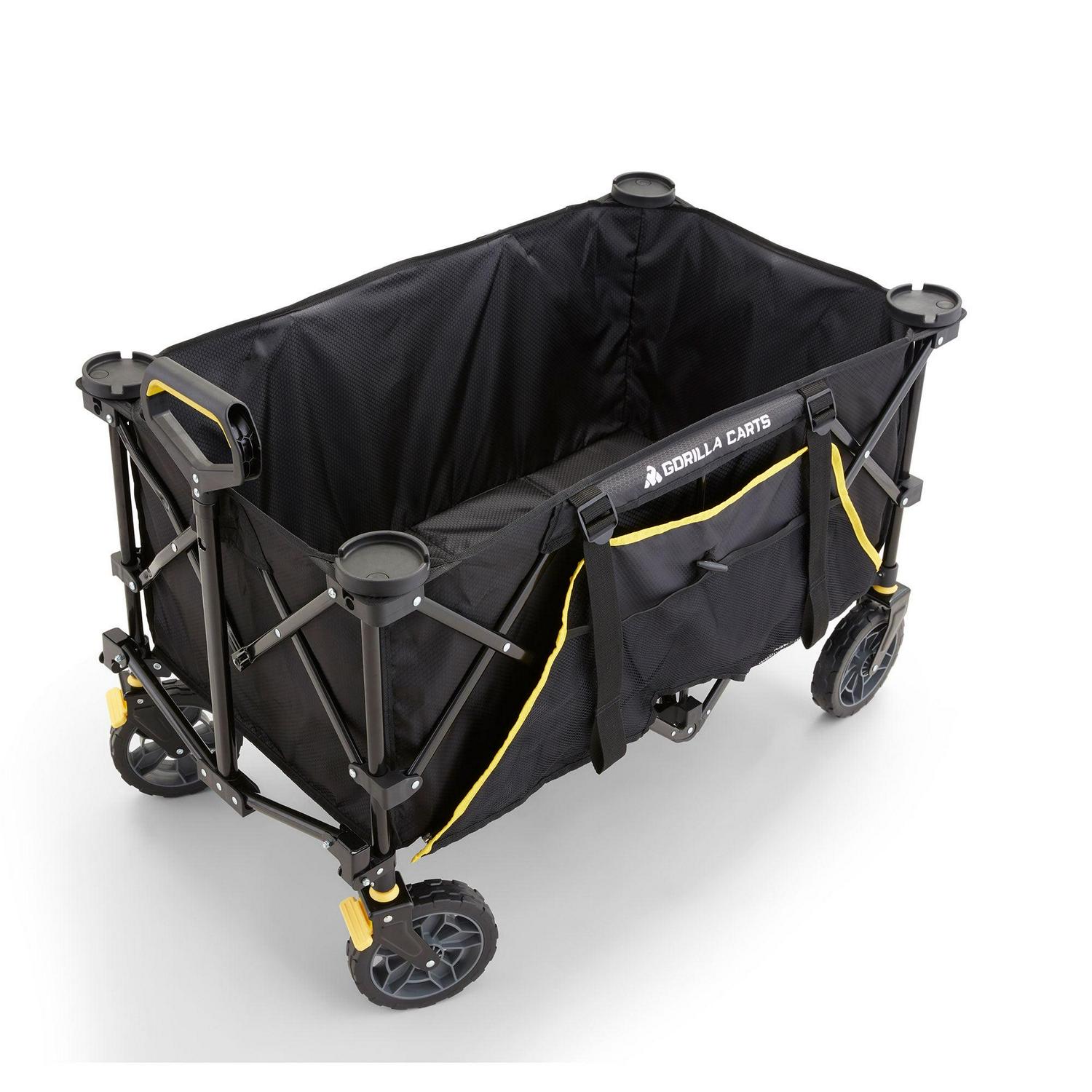 Whether it’s a day at the beach or a picnic in the park, there’s plenty of room for you to carry all of your stuff with the Gorilla Carts 7 Cubic Feet Utility Cart Collapsible Wagon with Oversized Bed. This foldable beach wagon carrier can carry up to 150 pounds worth of items for the maximum hauling experience. Pack up everything you need in this cart wagon with is huge bed measuring 36 inches long, 21 inches wide, and 15 inches tall. Expand the sides for umbrellas, chairs, camping gear, and additional storage, and use the handy zipper pockets on the pull cart for storing small items like your phone or keys. Enjoy the built-in cup holders for drink storage or for holding your phone so you can be hands-free. When hauling is complete, simply fold down the collapsible cart to its compact size for easy transport and storage. This all terrain wagon features a long handle that provides comfort when pulling and reduces fatigue in the process. Plus, the wagon includes flat-free, 7-inch tires with PVC treads that give you the versatility of a beach cart, garden cart, or a trusted Gorilla cart for navigating gravel or grass. Along with upgraded steering and brakes, the maneuverability system on this wagon is second to none. Constructed from a high-quality sport fabric, the foldable cart is designed with a soft, washable interior for easy cleaning and maintenance. All you need to do is a little pulling and the Gorilla Carts Collapsible Folding Utility Wagon will do the rest.