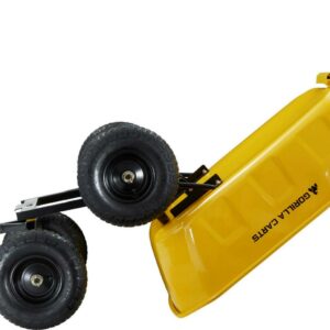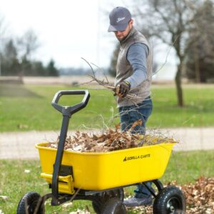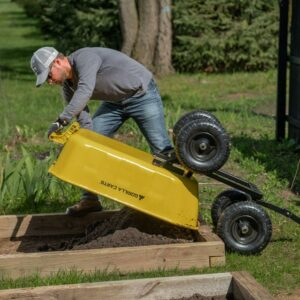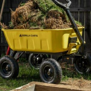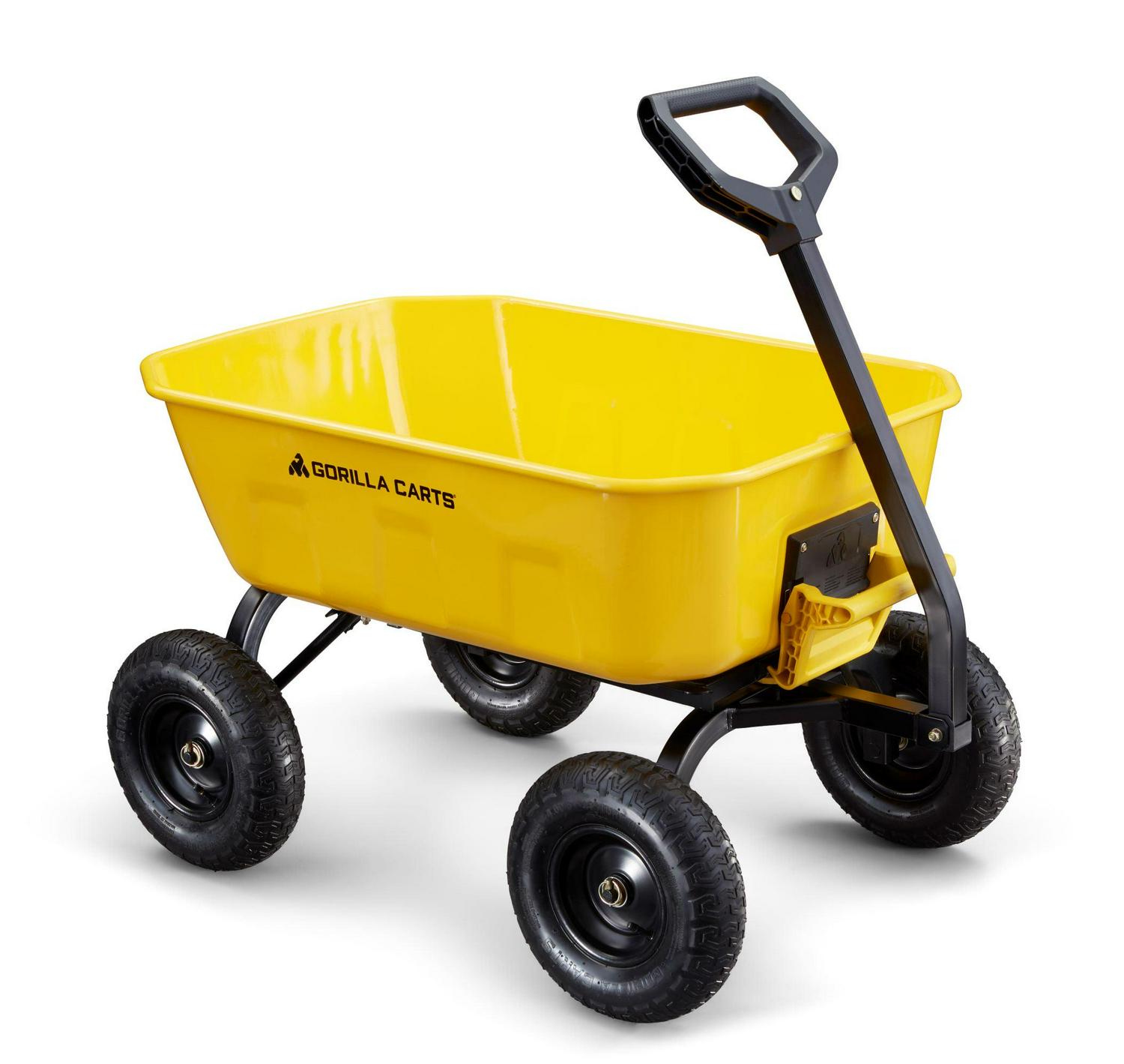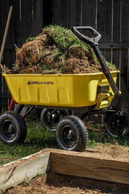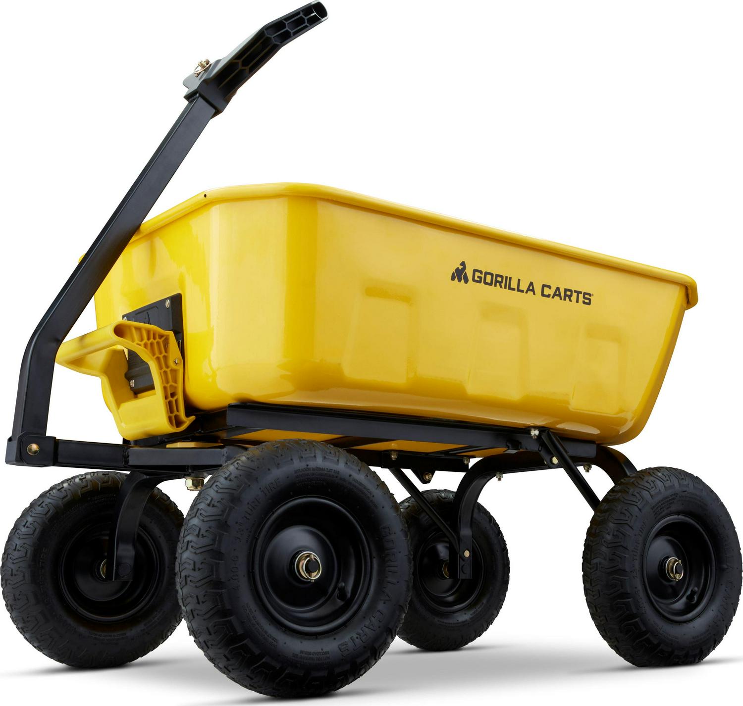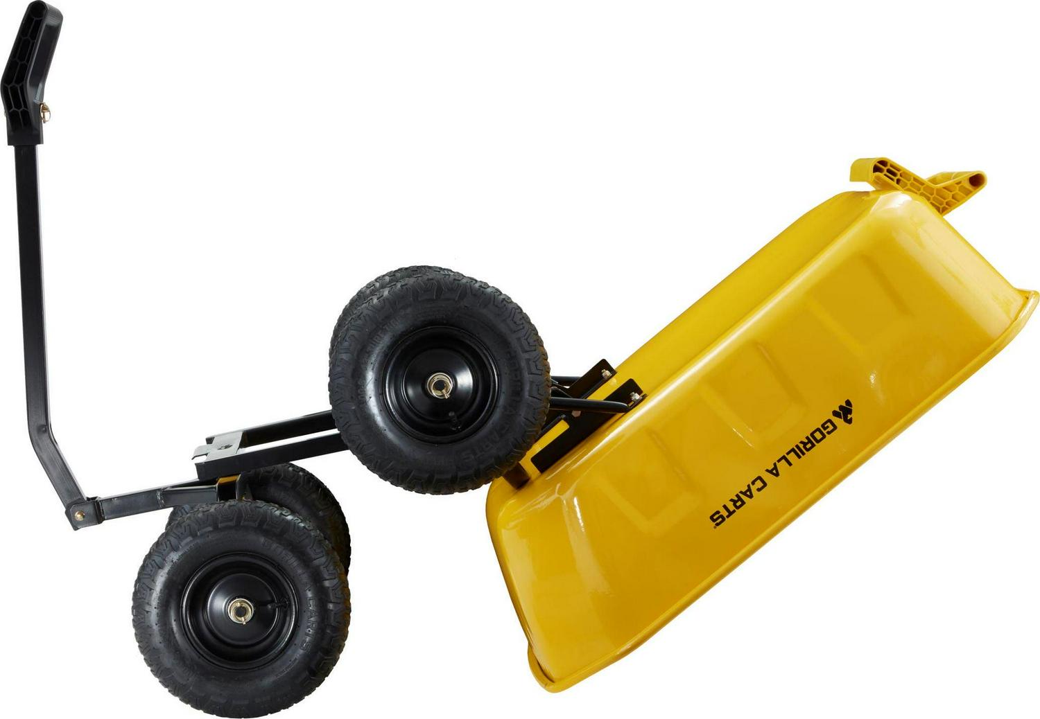 The Gorilla Carts 8 Cu. Steel Dump Cart is your ultimate tool for heavy-duty hauling. The oversized 39 x 28 steel bed has a 1,200 lb. hauling capacity, making it perfect for use around the garden, lawn, barn, or farm. The patented 2-in-1 convertible handle allows the cart to be towed behind a lawn tractor or ATV, or pulled easily by hand, and zero-turn steering means it s also easy to maneuver. The exclusive quick-release dumping system easily allows contents to be fully dumped and unloaded. The balanced, extra-wide base with 4-wheel stability allows you to tackle heavy landscaping or garden projects. High-quality 13 in. pneumatic tires keep this workhorse on the move and allow you to roll easily over any terrain. This strong and durable cart is always ready to take on your next big yard project.