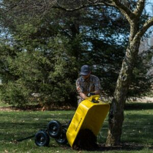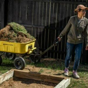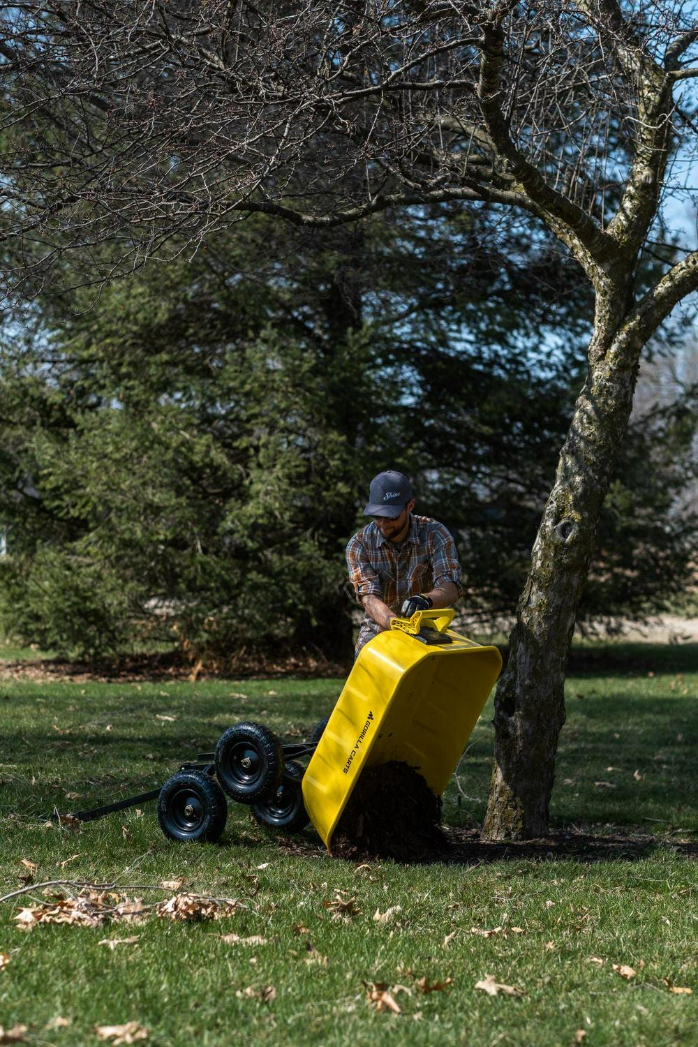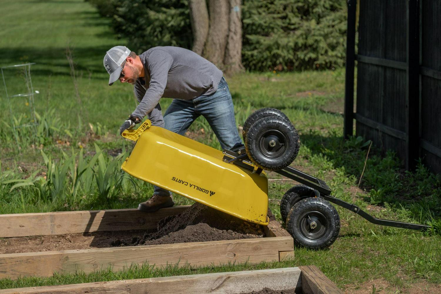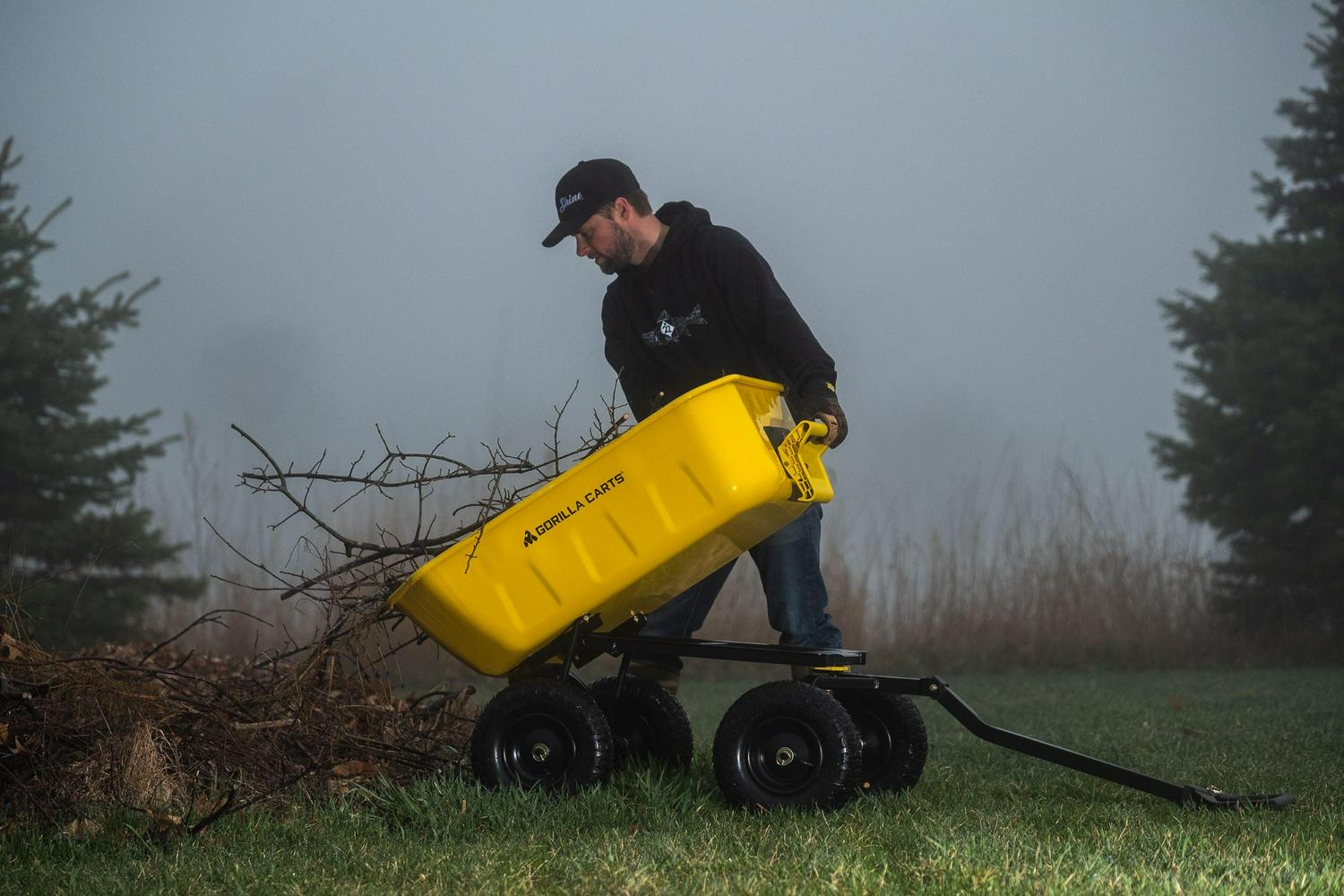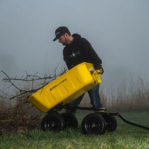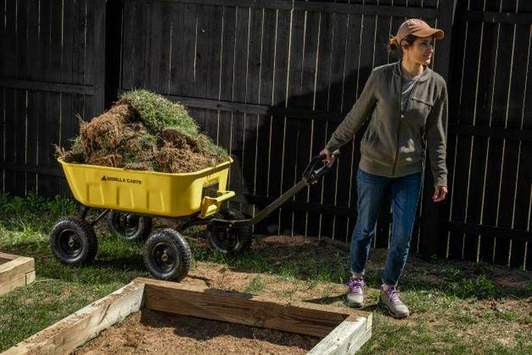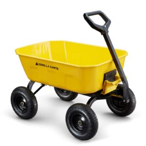 The Gorilla Carts 8 Cu. Steel Dump Cart is your ultimate tool for heavy-duty hauling. The oversized 39 x 28 steel bed has a 1,200 lb. hauling capacity, making it perfect for use around the garden, lawn, barn, or farm. The patented 2-in-1 convertible handle allows the cart to be towed behind a lawn tractor or ATV, or pulled easily by hand, and zero-turn steering means it s also easy to maneuver. The exclusive quick-release dumping system easily allows contents to be fully dumped and unloaded. The balanced, extra-wide base with 4-wheel stability allows you to tackle heavy landscaping or garden projects. High-quality 13 in. pneumatic tires keep this workhorse on the move and allow you to roll easily over any terrain. This strong and durable cart is always ready to take on your next big yard project.