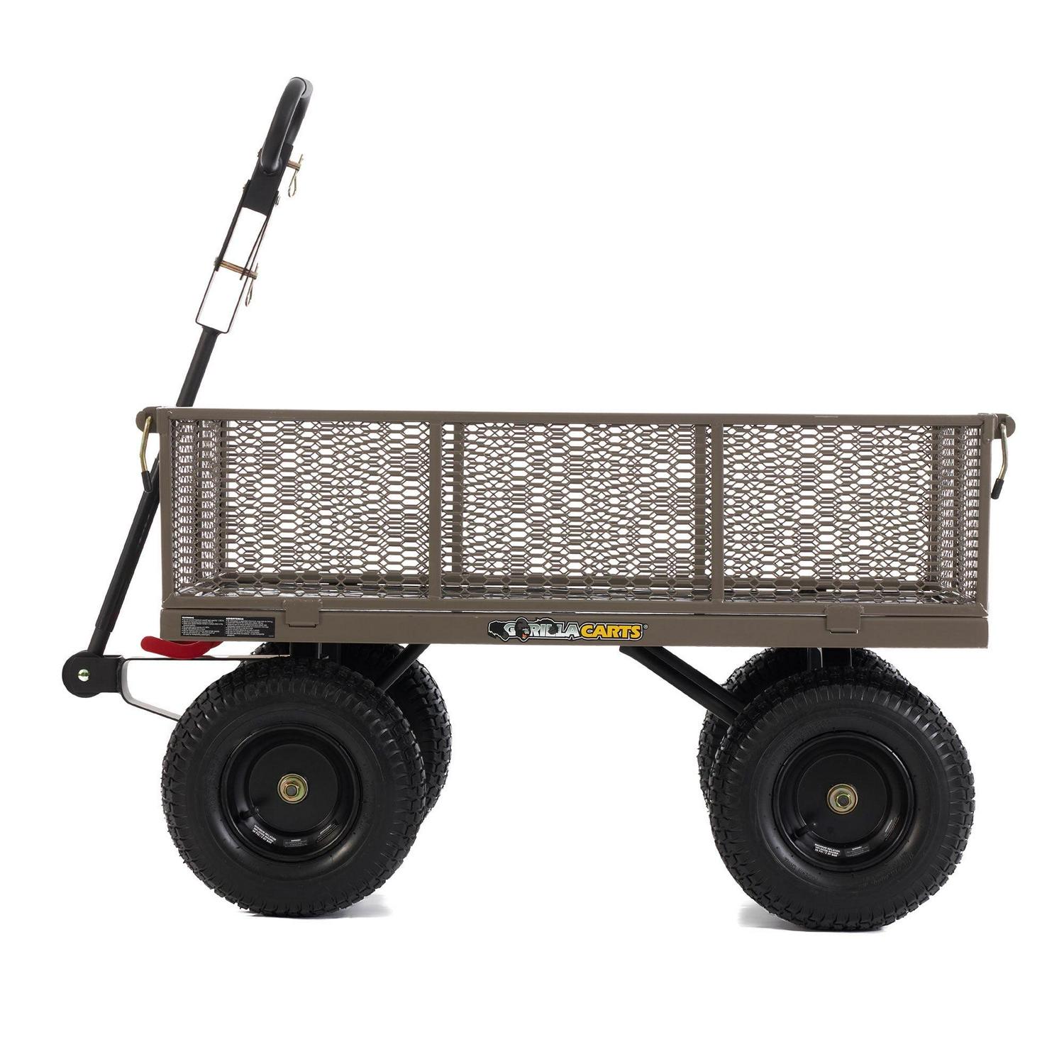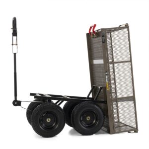 Whether it’s hauling chopped wood or fertilizer, carry them all in the Gorilla Carts 5-Cubic Feet Steel dump Utility Wagon. This strong cart with wheels can carry up to 1,200 pounds worth of items for the maximum hauling experience. This versatile, heavy duty wagon features a long handle that provides comfort and convenience when going from place to place so you can say goodbye to stressful hauling. Plus, you can easily convert the yard wagon handle to a hitch for towing behind a mower or ATV if needed. Along with removable sides and bed liner, you can enjoy customizing the gorilla cart wagon to your needs and have even more room for bigger loads. With a weight capacity of 1,200 pounds, this wagon cart is suitable for rugged use around the lawn, garden, and more. The rolling cart wagon includes durable, 13-inch pneumatic wheels that make it easy to maneuver across any terrain, great for doing work around the farm or as a camping wagon to haul all your gear across the camping grounds. You can also use this as a utility cart, beach wagon, all-terrain wagon, garden cart on wheels, or classic cargo cart. When you need to unload, the patented quick-release dumping system is easy to use and efficient. Constructed from heavy-duty powder-coated steel, the pull cart features the utmost durability for long-lasting use. Measuring only 39.45 inches long and 22 inches wide, easily store the cart in your garage or another storage area when you are done with a hard day’s work. All you need to do is a little pulling and the Gorilla Carts Utility Steel Wagon will do the rest.