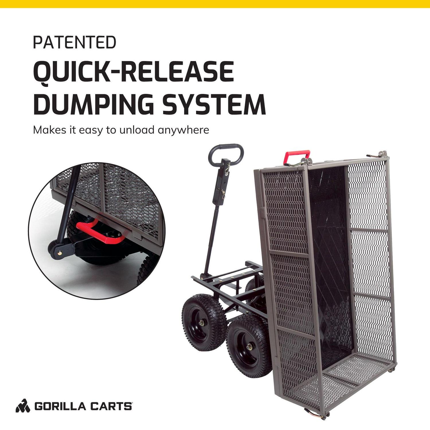 – Patented quick-release dumping system allows you to easily unload garden essentials such as mulch and fertilizer