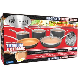 – ULTIMATE CERAMIC NONSTICK the Gotham Steel nonstick cooking surface is coated three times and then reinforced with diamonds to deliver the ultimate food release. No seasoning or even oil or butter needed, makes for healthier eating, and provides for hassle free, 1-2-3 cleanup.