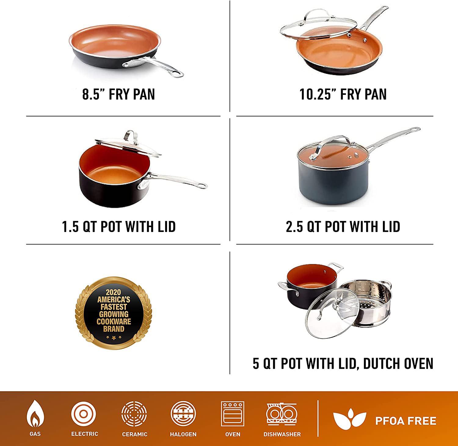 – COMPLETE COOKWARE SET this set includes everything you need to outfit your kitchen and get cooking right out of the box, including a 8.5 skillet, 10.25 frying pan, tempered glass lid for 10.25 frying pan, 1.5 quart sauce pan with tempered glass lid, 2.5 quart stock pot with tempered glass lid, 5 quart stock pot with tempered glass lid, XL aluminum steamer insert