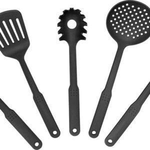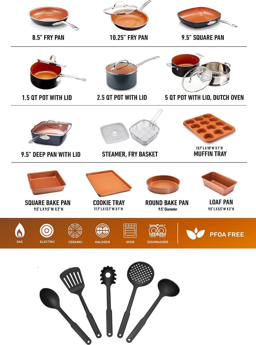 – SET INCLUDES- 8.5 in. Skillet, 10.25 in. frying pan with lid, 9.5 in. shallow square frying pan, 1.5 qt. saucepan with lid, 2.5 qt. saucepan with lid, 5 qt. stock pot with lid, steamer insert, 9.5 in. deep square casserole pan with lid with fry basket, steaming rack, round cake pan, cookie sheet / jelly roll pan, large 12 cup muffin pan, large baking pan 9 in. x 13 in. and 5 in. deep square pan, 5 Cooking Utensils