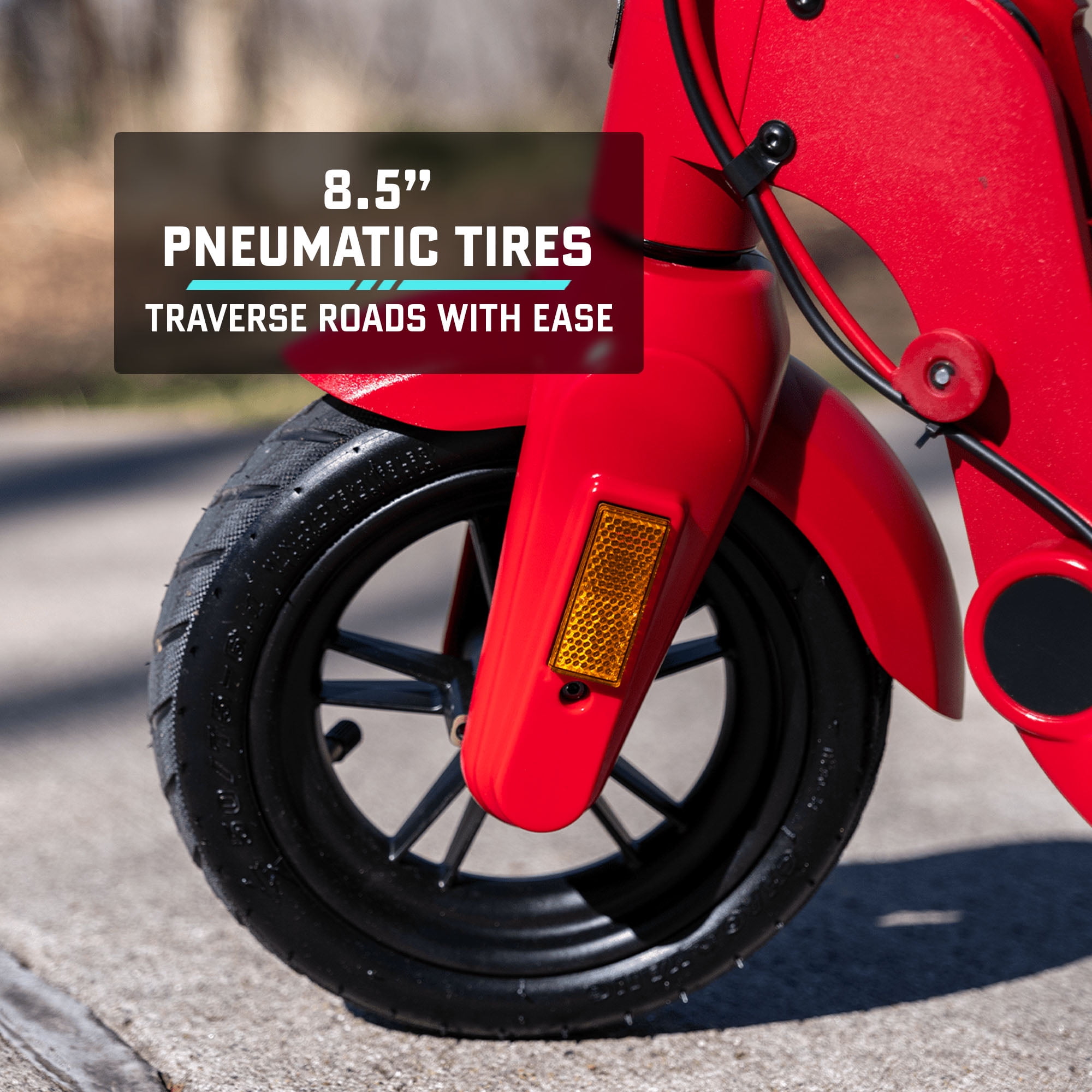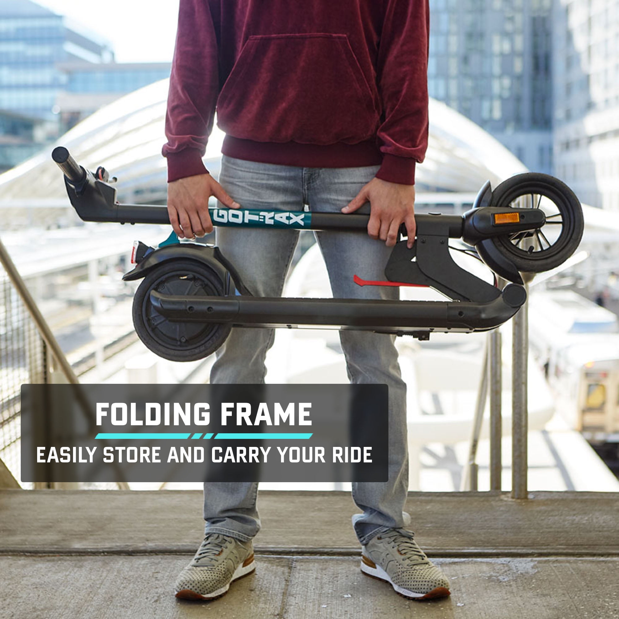 Looking for an efficient and comfortable way to commute through the city? The Gotrax Apex Adult Electric Scooter Unisex might just be the perfect solution for you! With its air-filled 8.5″ tires, you can enjoy a smooth ride even on bumpy streets. You can easily keep track of your speed and battery life, and the bright headlight and taillight will help keep you safe on the road. Plus, the one-step folding frame makes it easy to store the scooter in any small space. With rear disc braking and EABS anti-lock braking system, you can trust this scooter to provide a responsive and efficient braking experience. And with the upgraded battery, you can enjoy a max range of 15 miles on a single charge. Whether you’re looking for a convenient way to get around or a fun new mode of transportation, the Gotrax Apex Electric Scooter is sure to be your new favorite travel companion! NAME Gotrax Apex Adult Electric Scooter MILES PER CHARGE – 15.5 miles MAX SPEED – 15.5mph MAX RIDER WEIGHT – 220lbs WATERPROOF RATING – IPX4 MOTOR SIZE – Peak 350W???Nominal Power 250W) COLOR(S) – Black+White, Red,Black+Blue TIRE SIZE – 8.5 inches PRODUCT WEIGHT – 32lbs DIMENSIONS – 44.1″ x 18.5″ x 43.5″ WARRANTY LENGTH – 1 Year Limited FRAME MATERIAL – Aluminum alloy A6061 BATTERY SIZE – 36V 6.0aH Lithium-ion Battery (216Wh) BRAKES – (Front) Electromagnetic Brake, (Rear) Disc Brake DISPLAY – LED Digital HEADLIGHT – LED TAIL LIGHT – Reactive Tail Light CHARGER – 42V 1.5A KICK 2 START – Yes